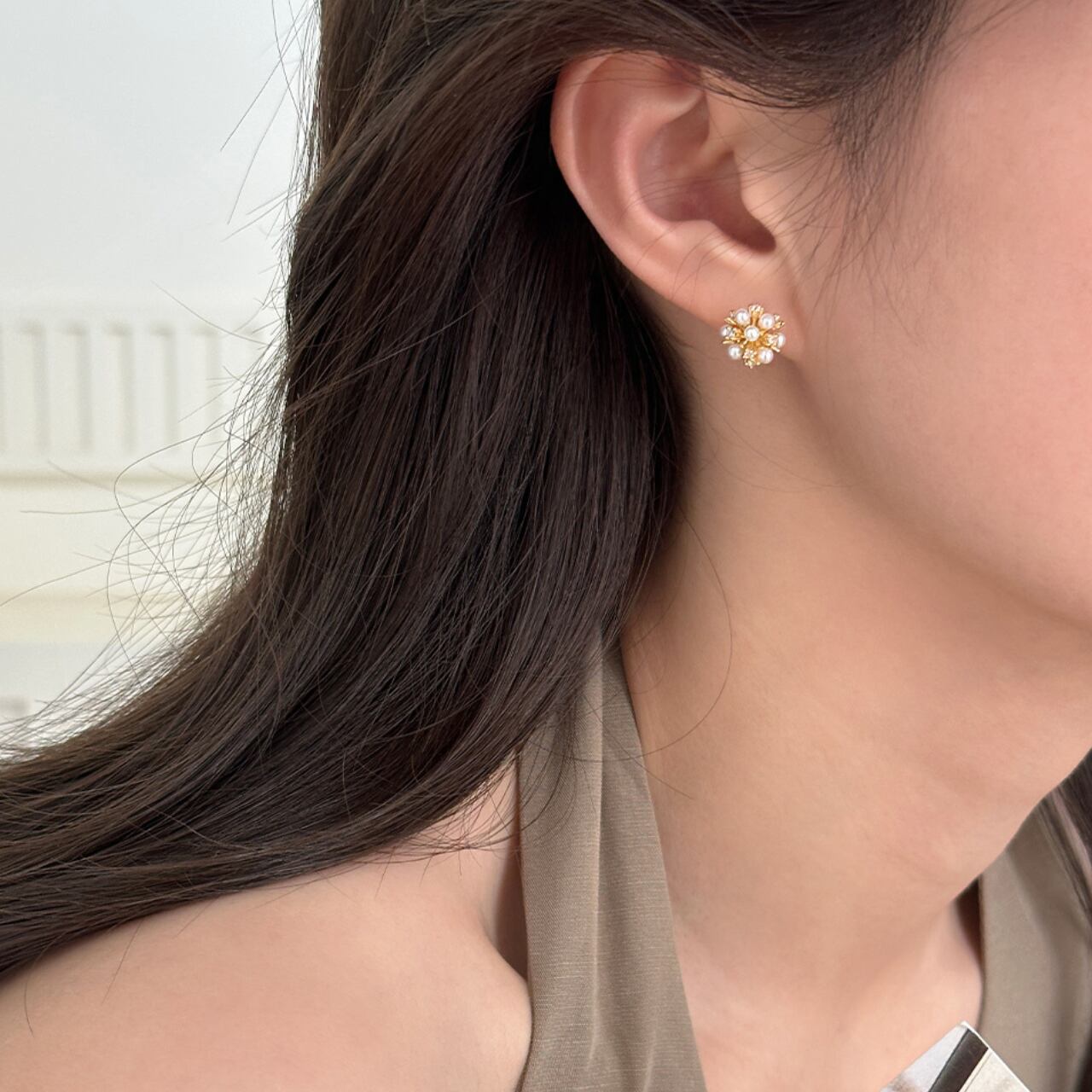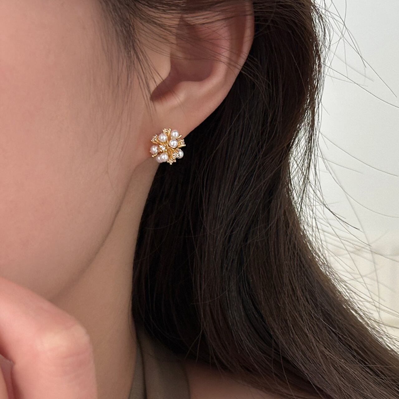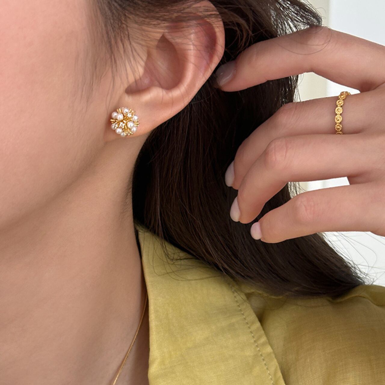 上品な輝きを放つパールが贅沢にあしらわれた、洗練されたデザイン。さりげないながらも存在感があり、普段使いから特別な日のお洒落まで幅広く活躍します。