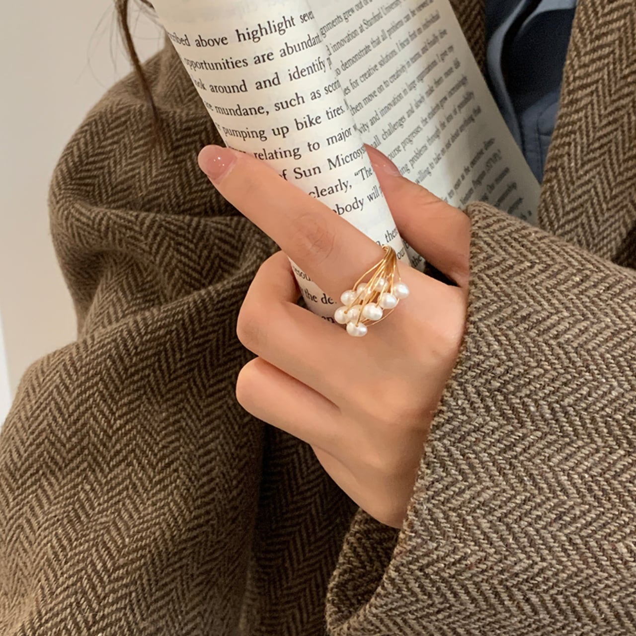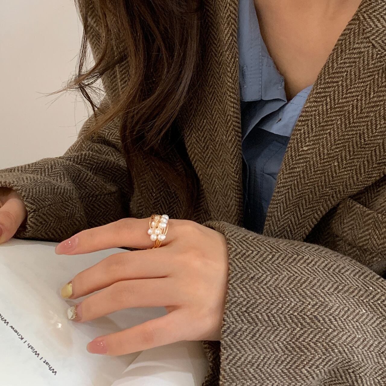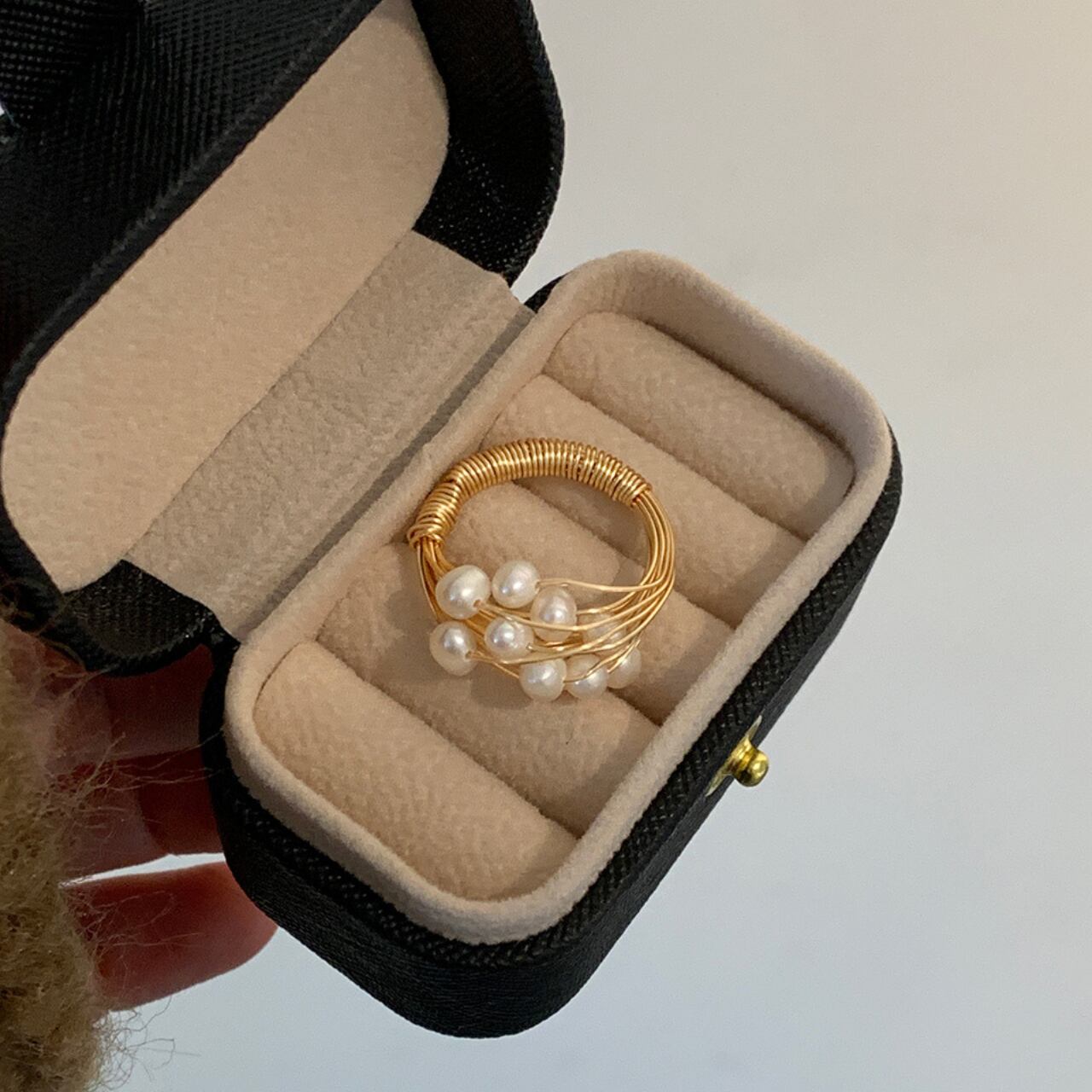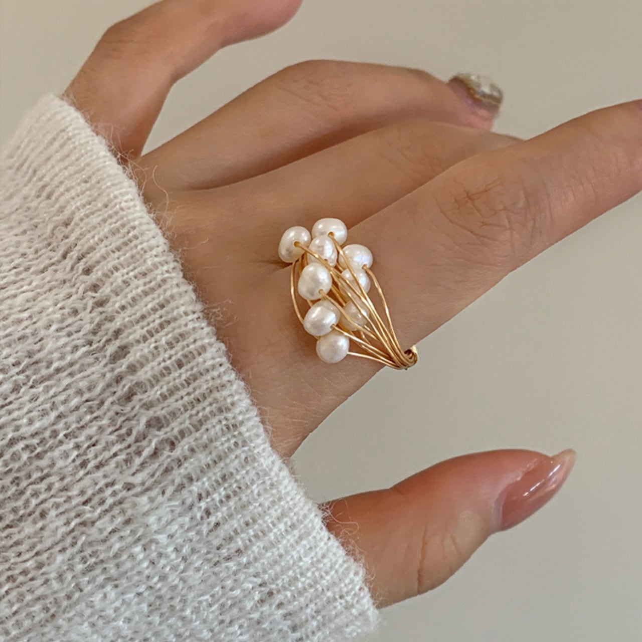 繊細なワイヤーが幾重にも重なり、上品な輝きを放つパールが散りばめられたリング。華奢なデザインながら存在感があり、デイリー使いから特別な日の装いまで幅広く活躍します。指元をさりげなく彩り、洗練された印象を演出します◎
