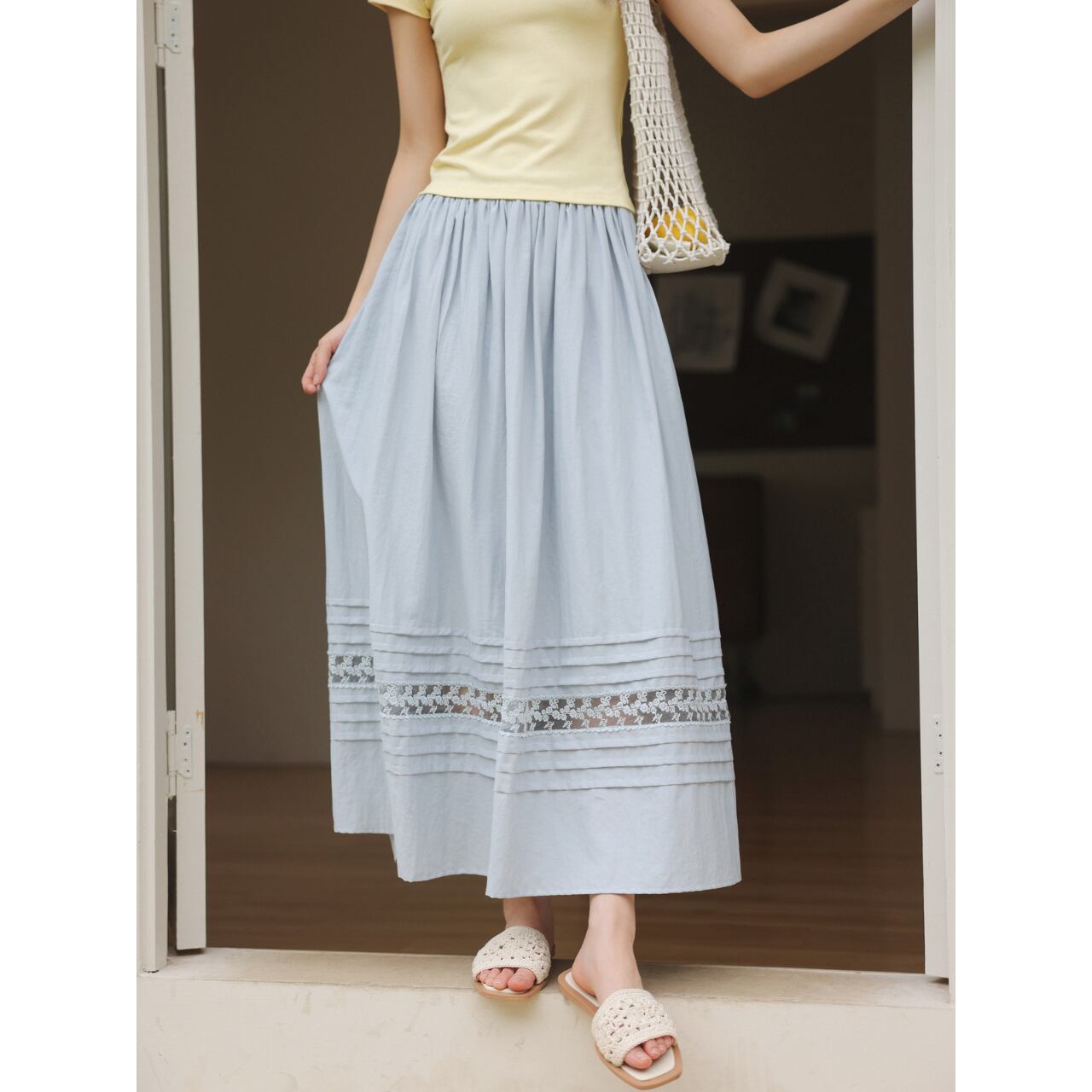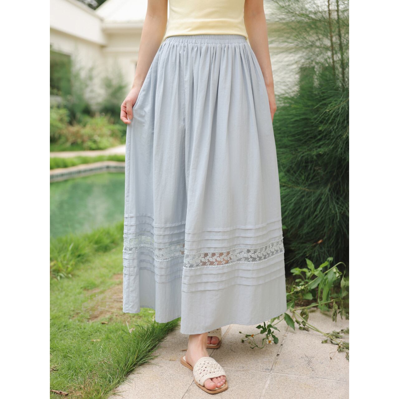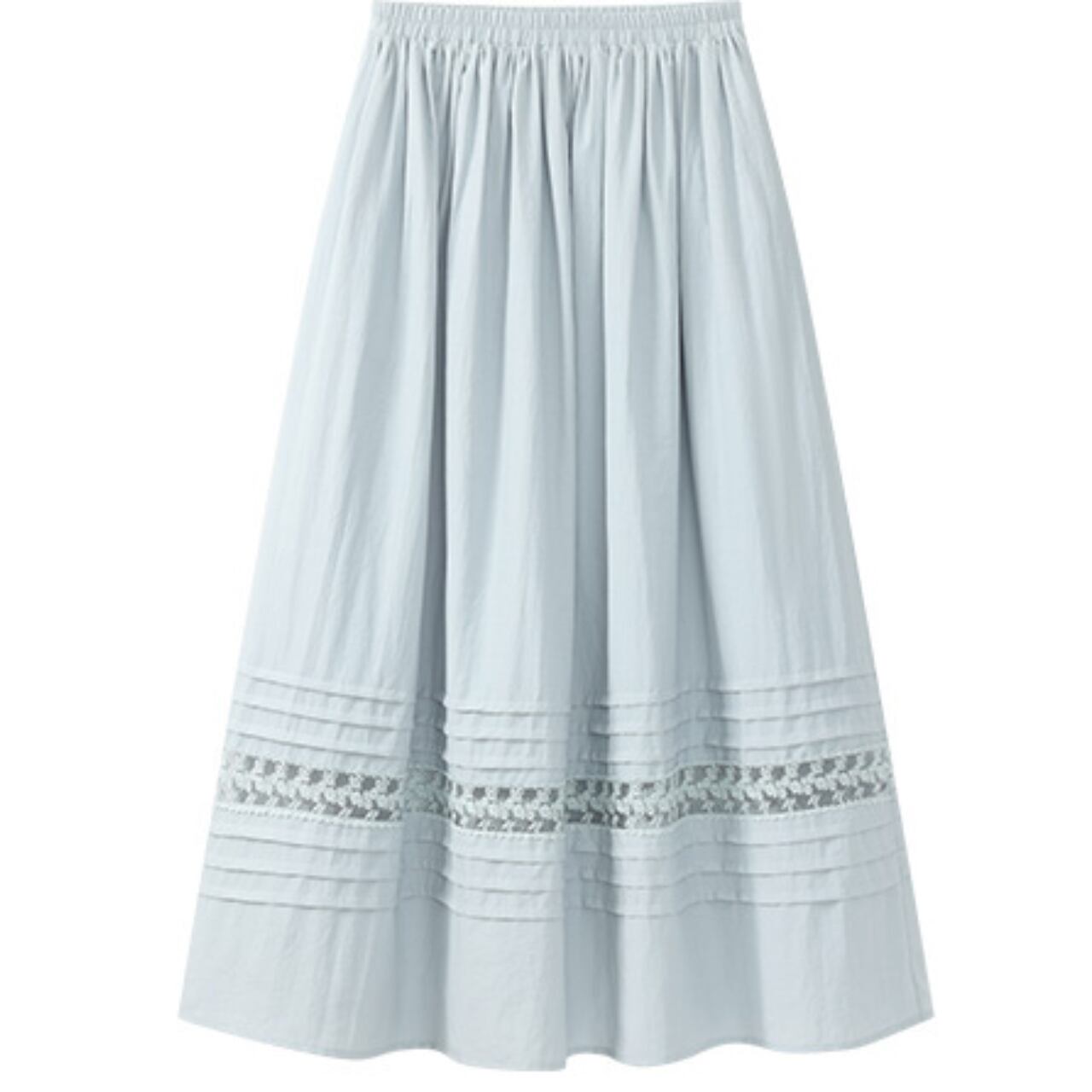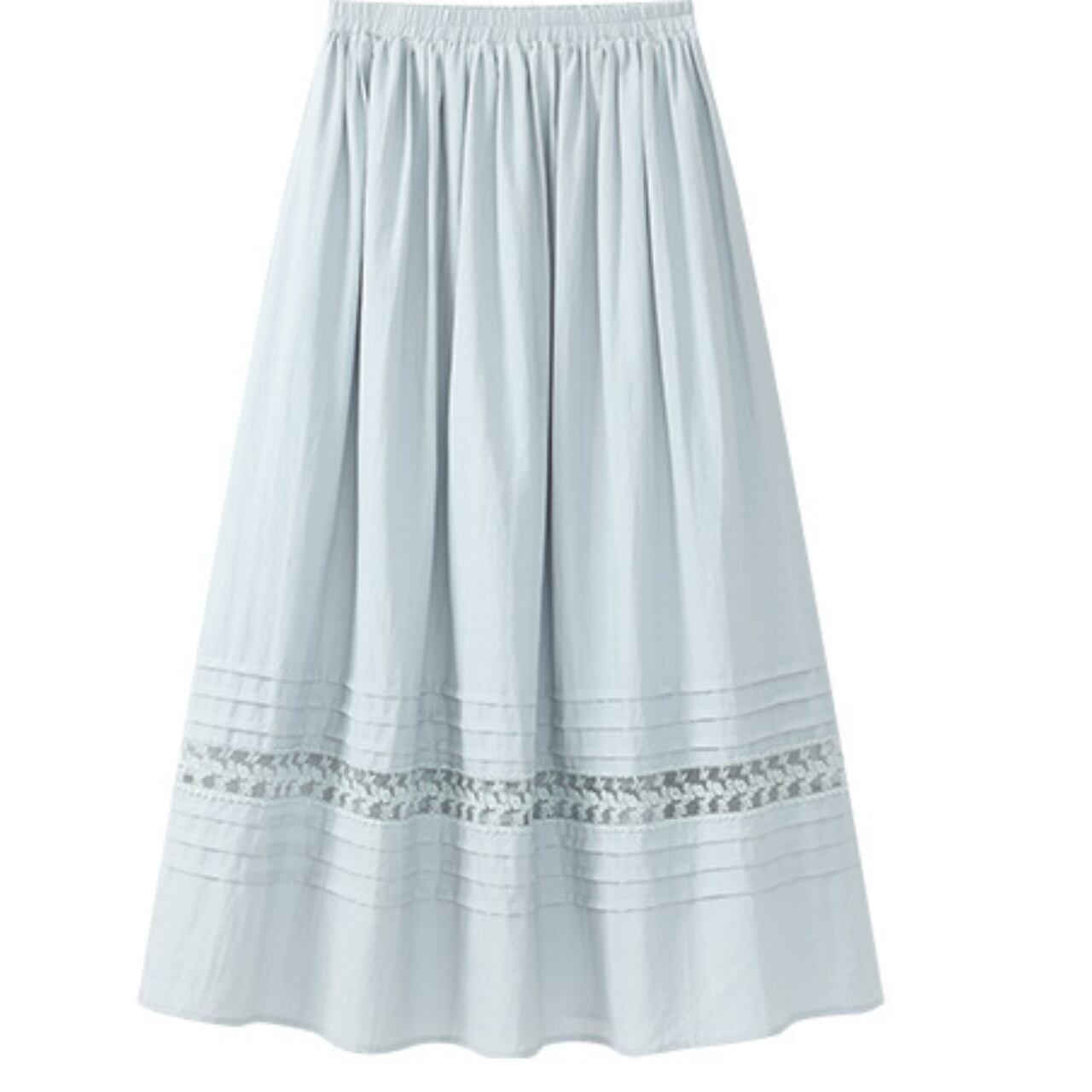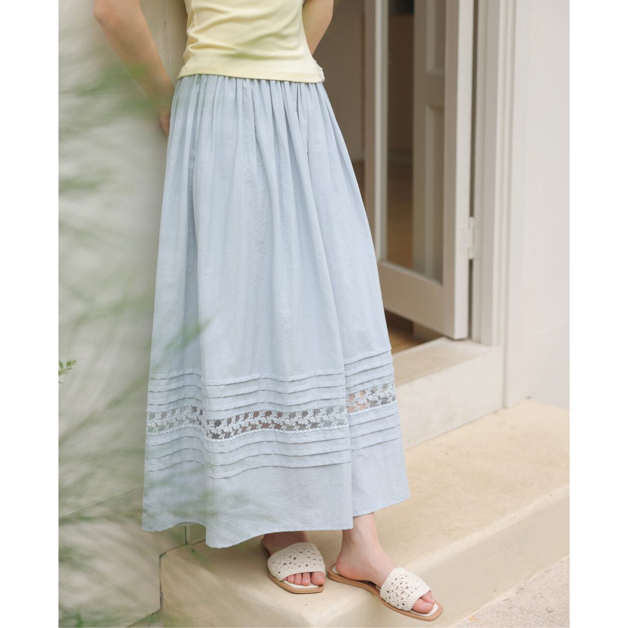 Aラインシルエットが美しいロングスカート。ギャザーが上品な女性らしさを演出します。裾のレースがさりげないアクセントになり、シンプルなトップスと合わせるだけで、洗練された着こなしが完成します。普段使いはもちろん、旅行やデートなど、様々なシーンで活躍すること間違いなしです◎