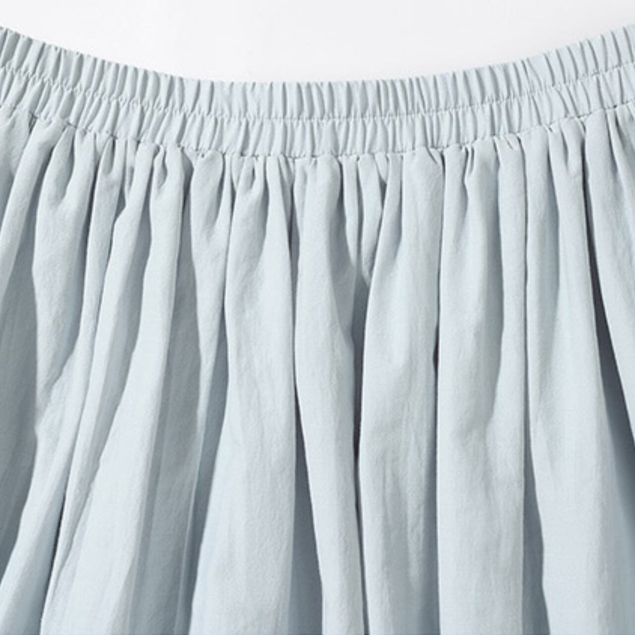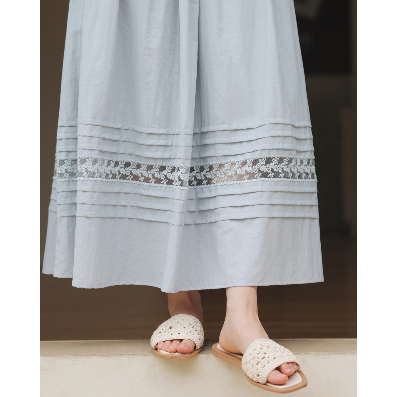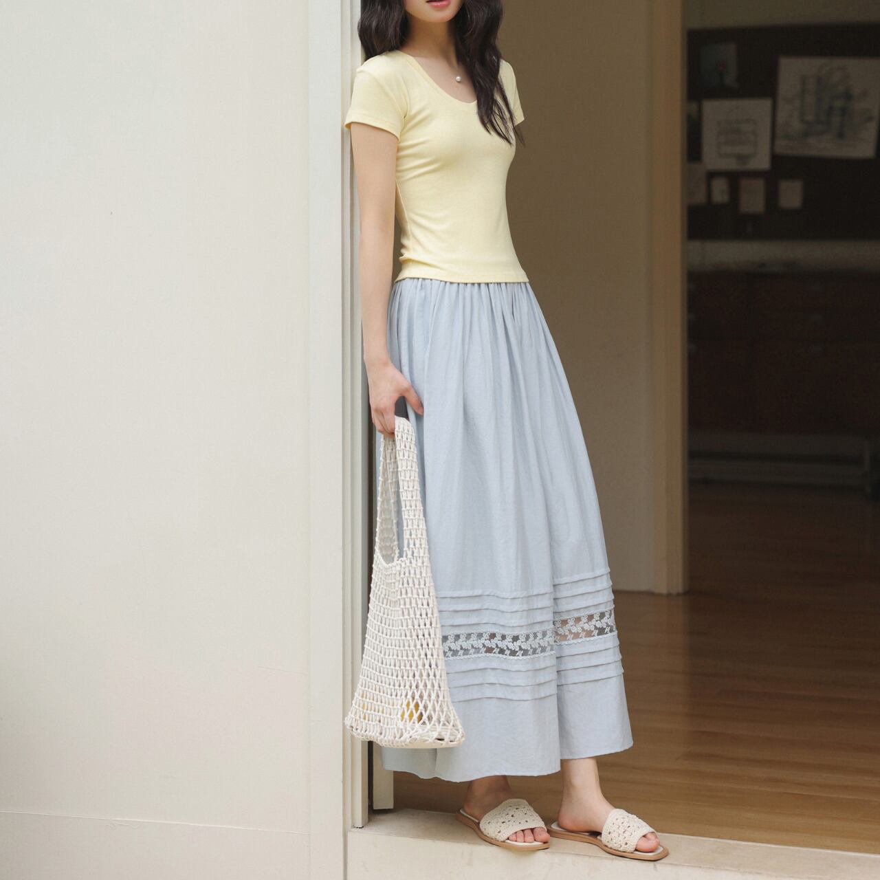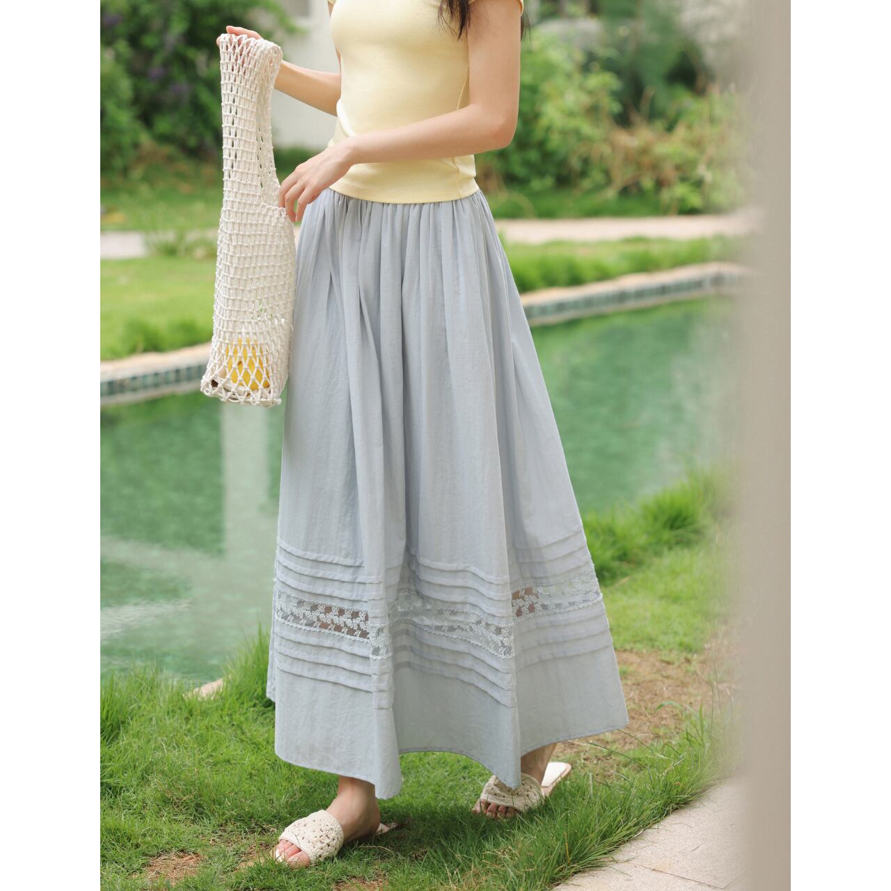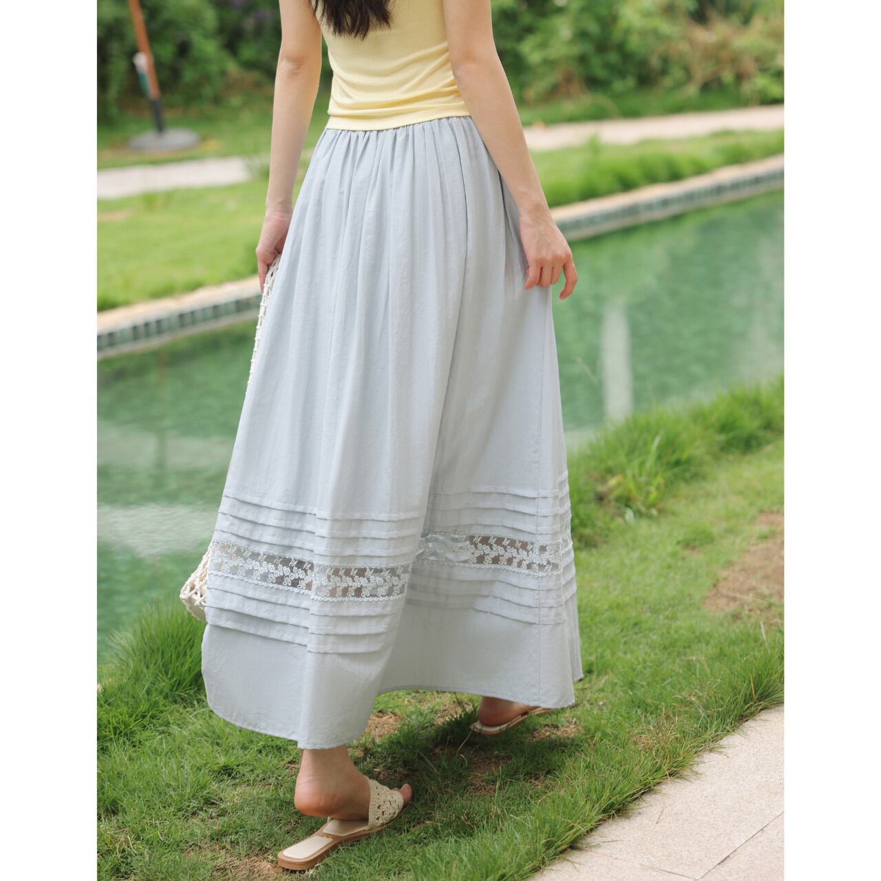 Aラインシルエットが美しいロングスカート。ギャザーが上品な女性らしさを演出します。裾のレースがさりげないアクセントになり、シンプルなトップスと合わせるだけで、洗練された着こなしが完成します。普段使いはもちろん、旅行やデートなど、様々なシーンで活躍すること間違いなしです◎