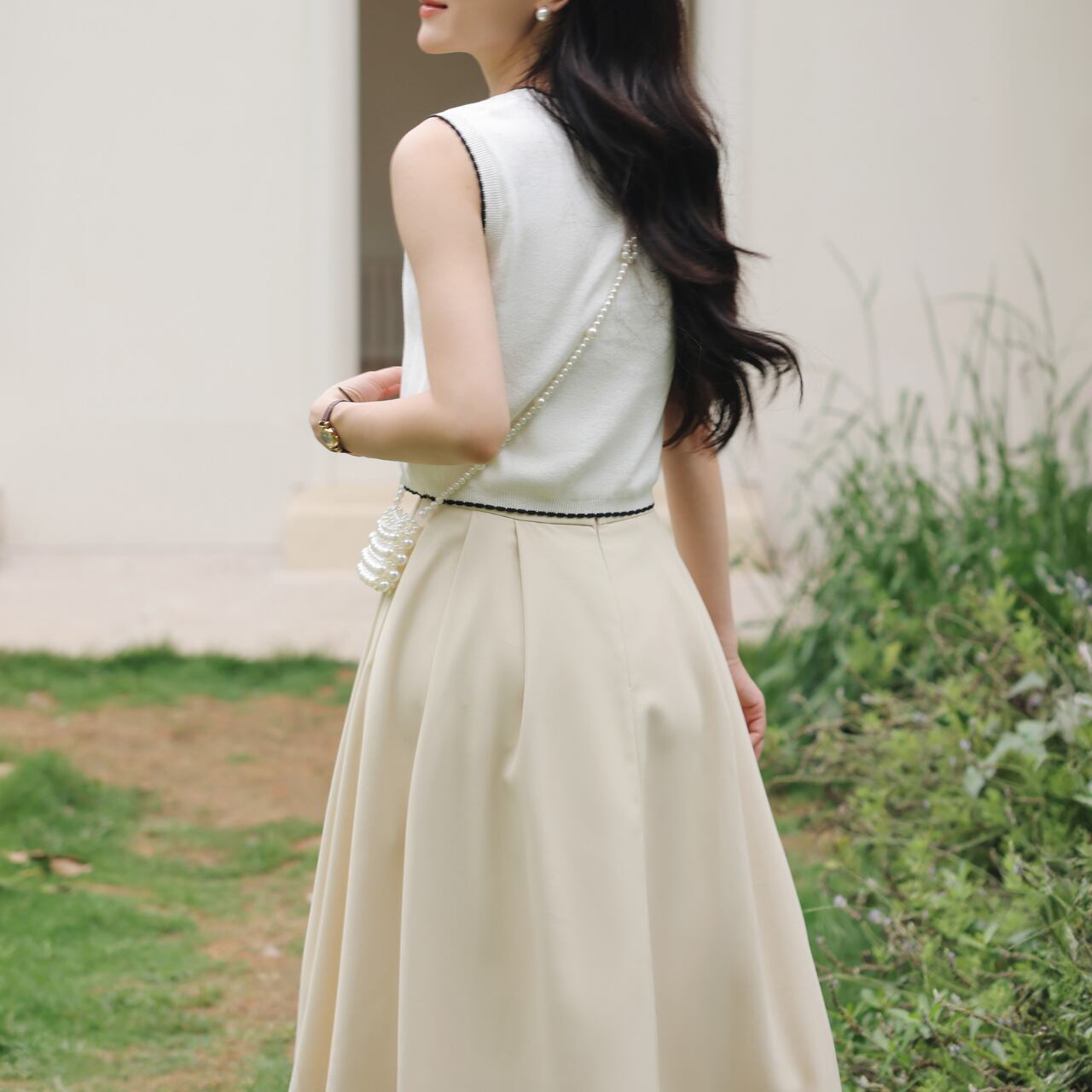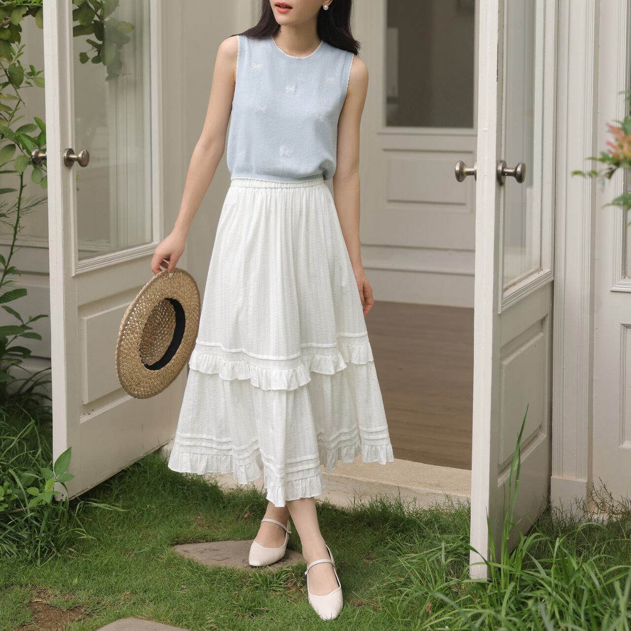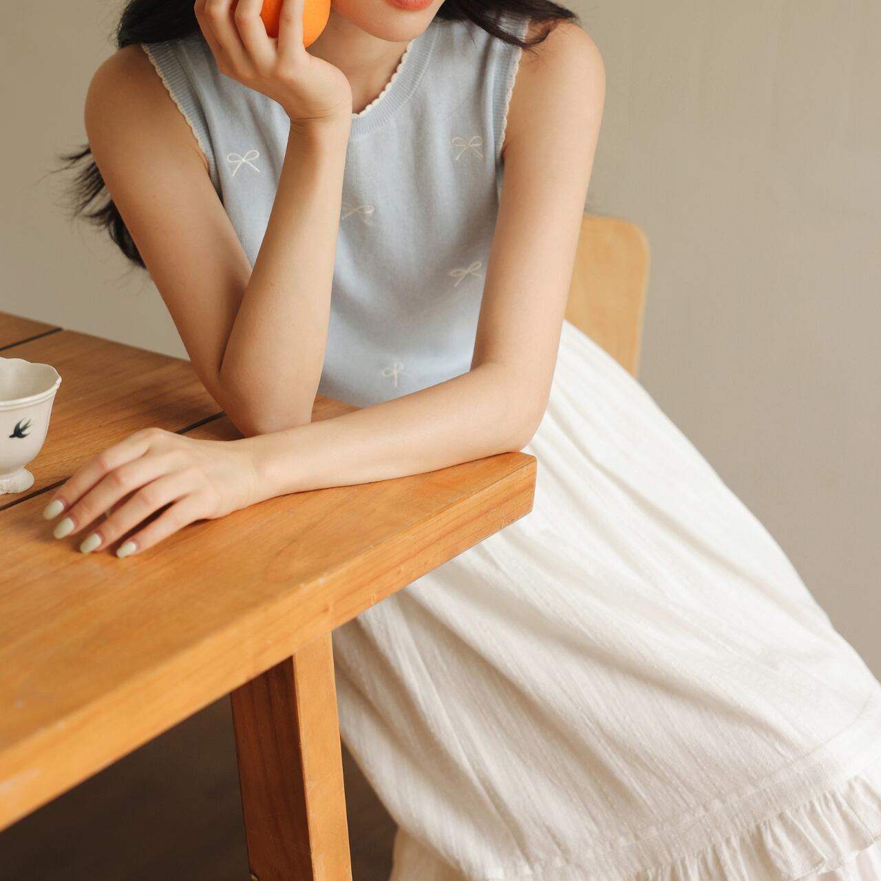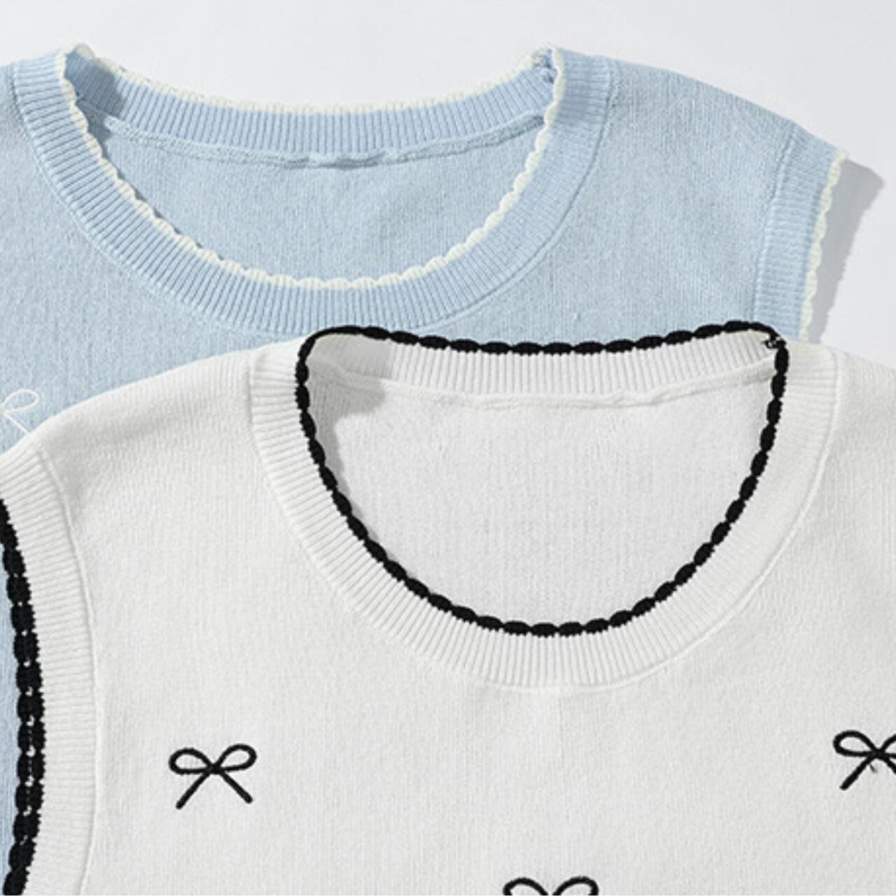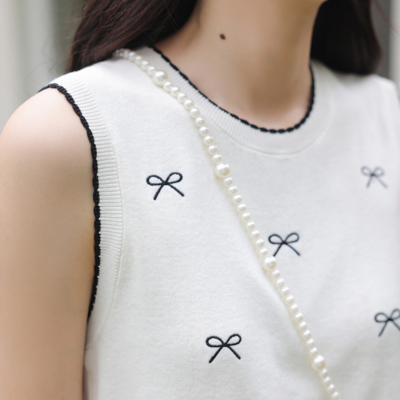 シンプルなラウンドネックノースリーブトップス。さりげなく散りばめられた小さなリボンモチーフが、上品で可愛らしいアクセントになっています。普段使いはもちろん、ちょっとしたお出かけにも◎。着回し力抜群で、様々なスタイルに合わせやすい一枚です。