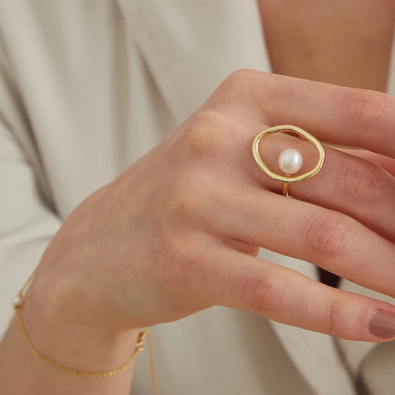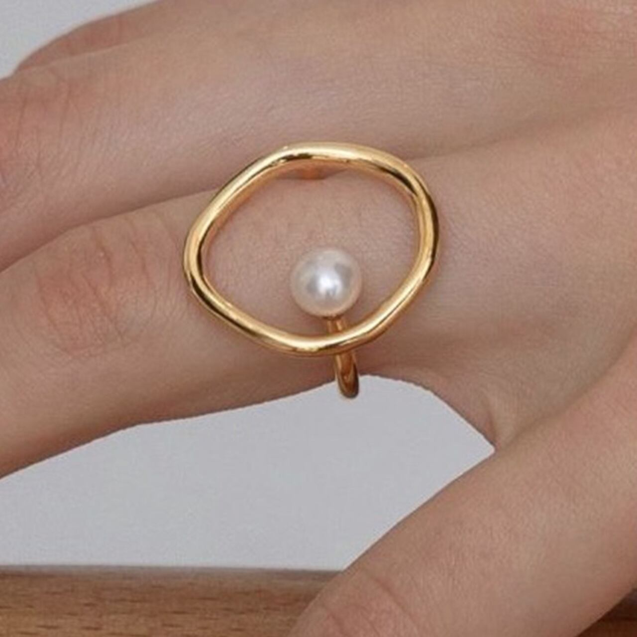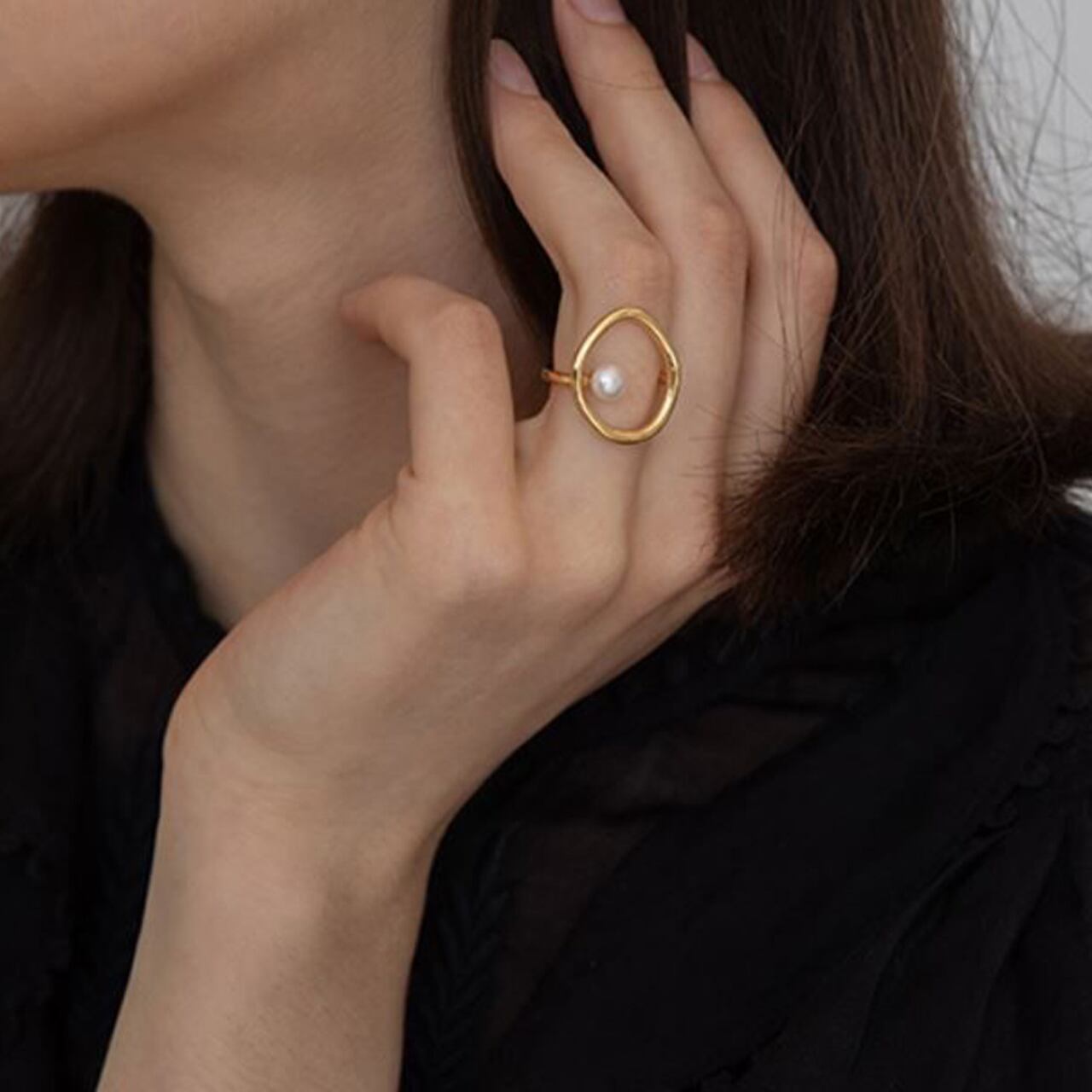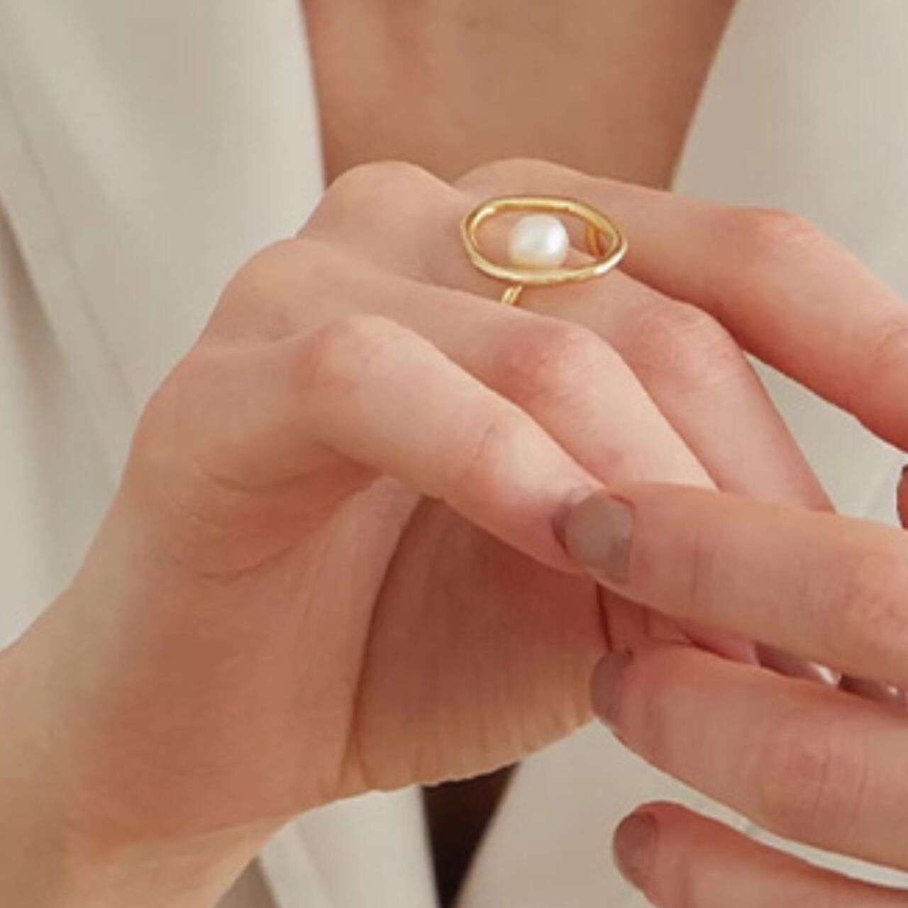 オーバル型のリングに、上品なパールがアクセントになったアシンメトリーデザイン。
