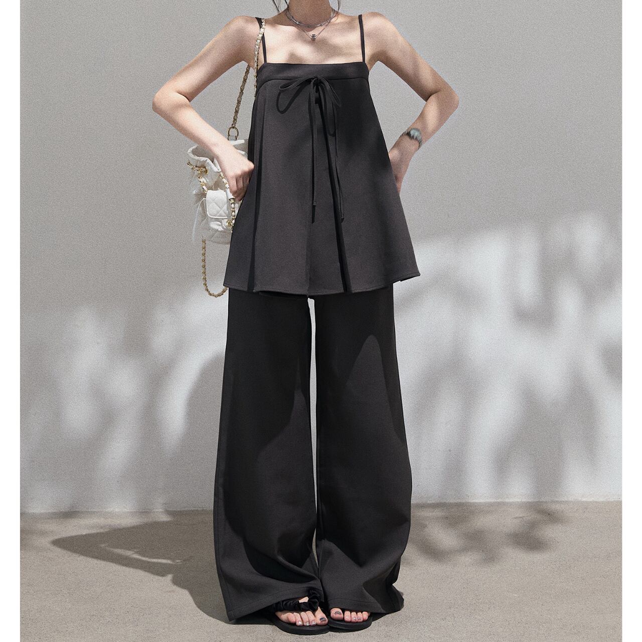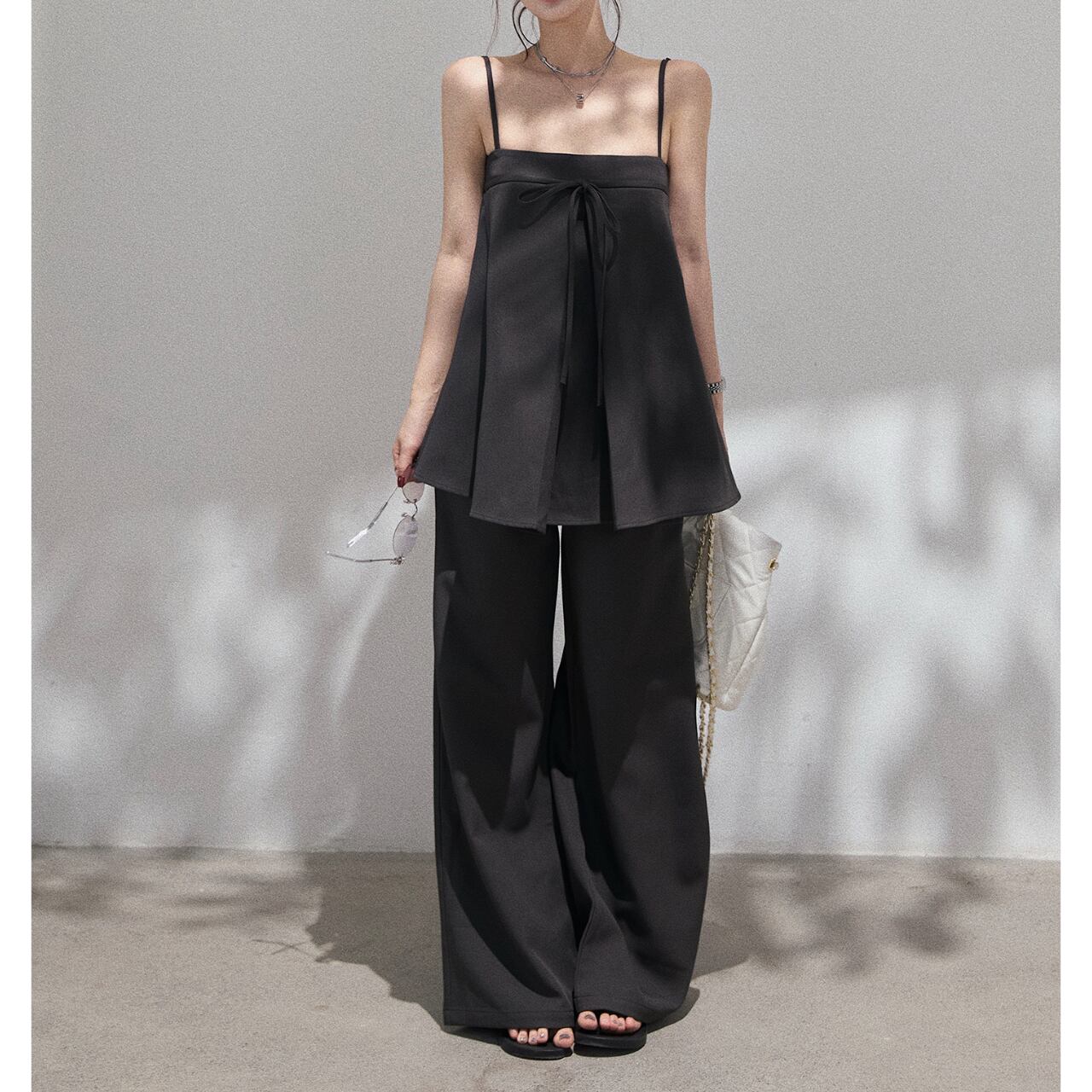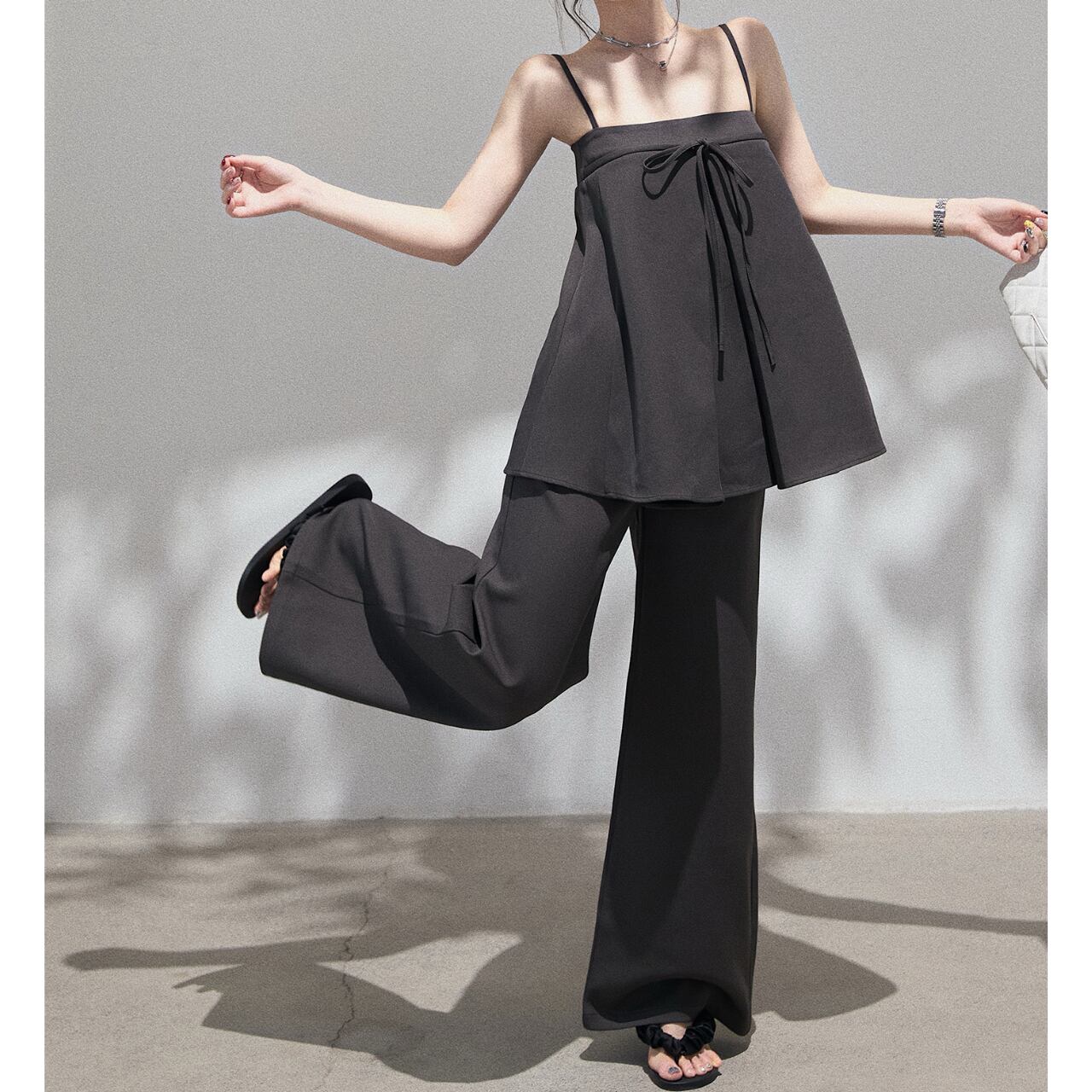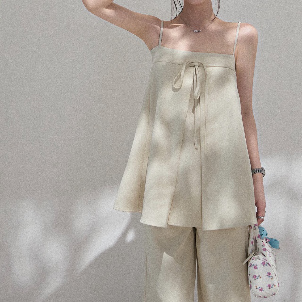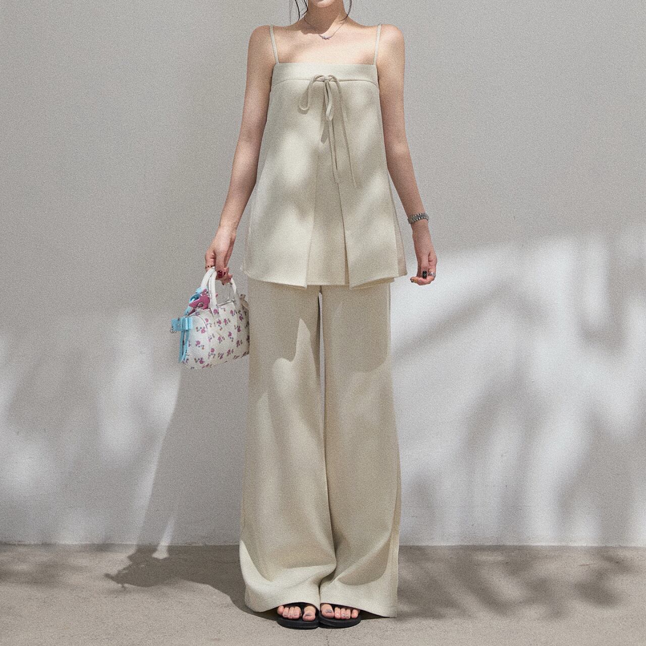 Aラインシルエットのキャミソールとリボン結びがポイントのワイドパンツのセットアップ。女性らしいシルエットが魅力的で、上品な雰囲気を演出します。普段使いはもちろん、旅行やデートなど、様々なシーンで活躍する一枚です◎ ◼️サイズ 【S】 上胸围:76cm 着丈:48cm 【M】 上胸围:80cm 着丈:48.5cm 【L】 上胸围:84cm 着丈:49cm ◼️カラー ホワイト グレー ◼️素材 ポリエステル スパンデックス 【お届けについて】 こちらの商品は海外店舗より直接発送となる為、ご入金から1〜3週間でお届けいたします。 ◼️注意事項 ・タイミングによっては 商品在庫切れにより注文キャンセルとさせていただく恐れもございますので、予めご了承くださいませ。 ・日本製とは検品基準が異なる為、縫製などが若干甘い場合があります。 ・海外倉庫にて保管をしております。在庫情報に時差が生じますため在庫切れや生産中止、生産に遅れがある場合は、受注後でもキャンセルさせていただく恐れがございます。 ・商品の色味は、お手持ちのスマートフォンの画面によって実物と若干異なる場合がございます。 ・発送時期によりデザイン仕様(細部、素材など)の変更がある場合がございます。 ・イメージ違いやサイズ交換等、お客さまご都合による交換、返品は対応出来かねます。 ———————————— 誠に恐れ入りますが、ご購入前に以下をご確認頂きご承諾の上お買い求めくださいませ。 →https://petitelune.official.ec/about ————————————