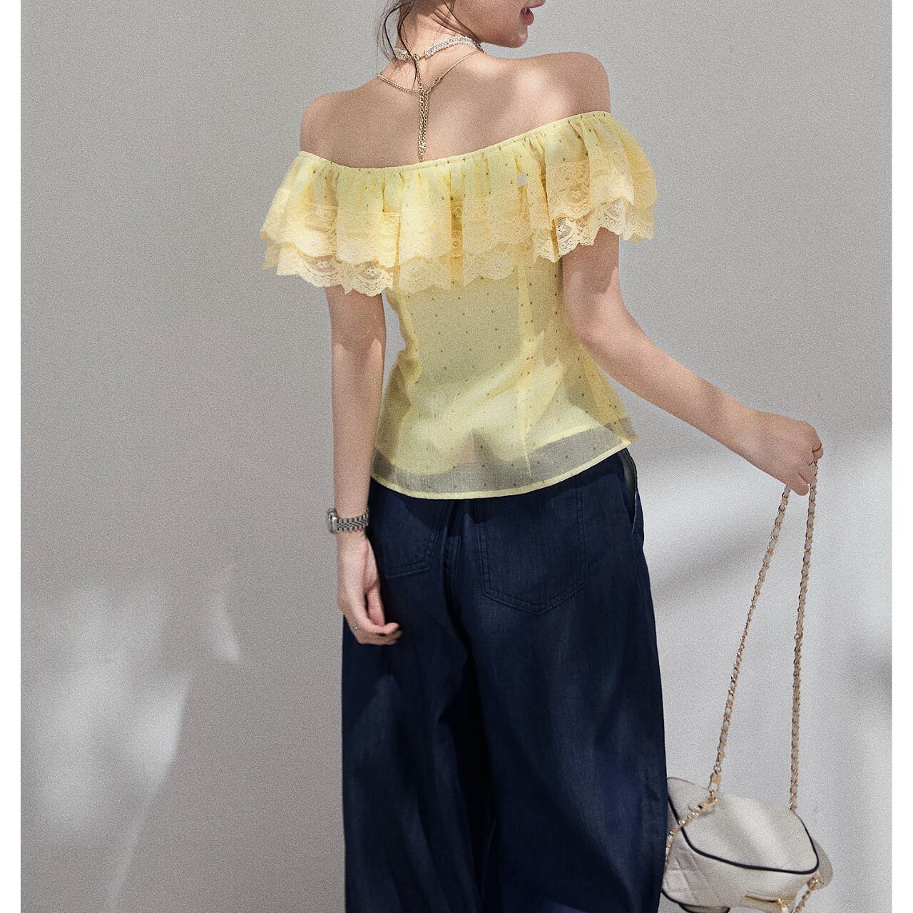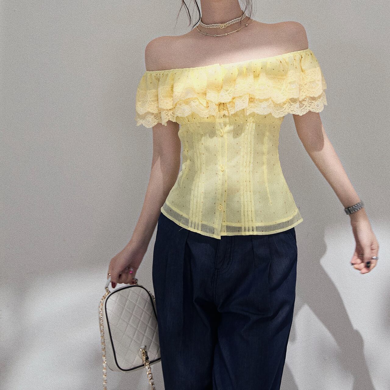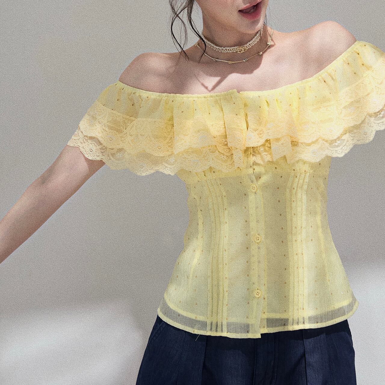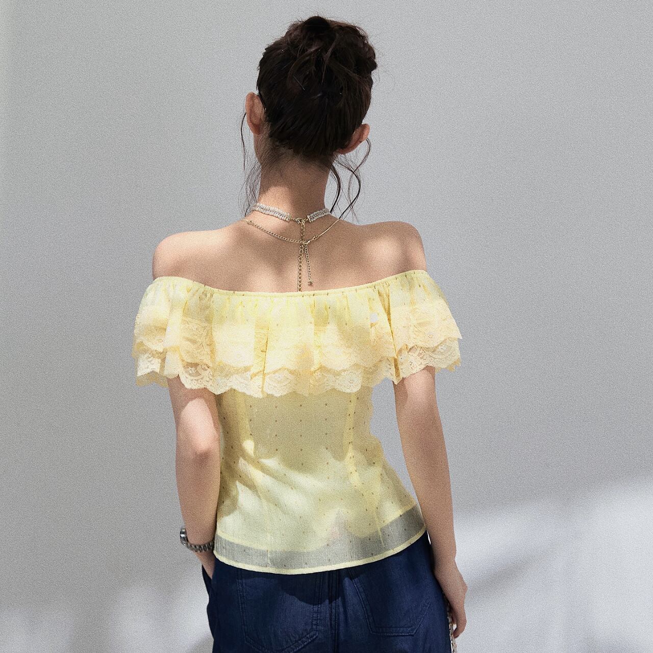 レース飾り付きオフショルダーフレアスリーブトップス。