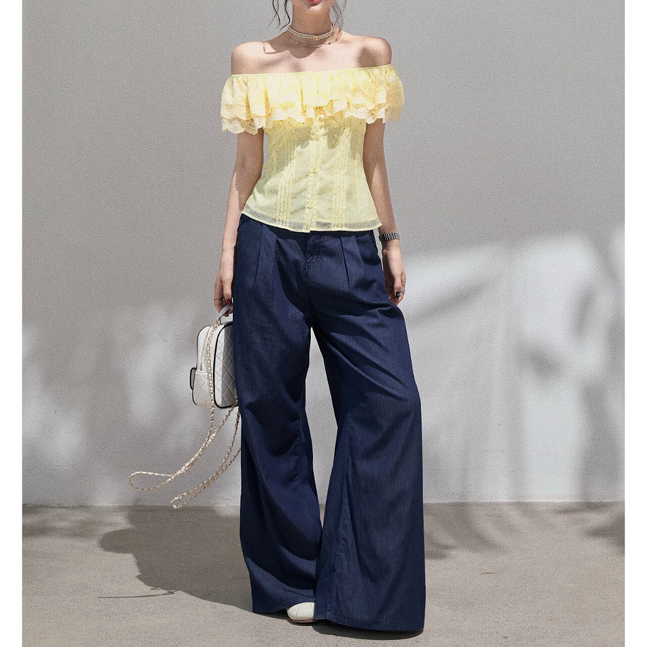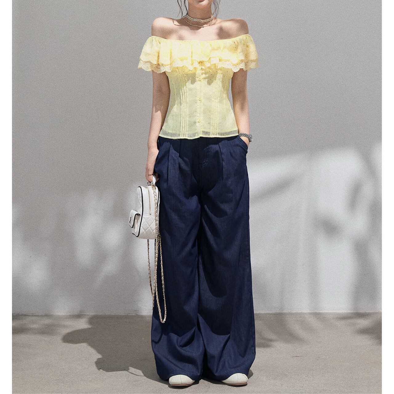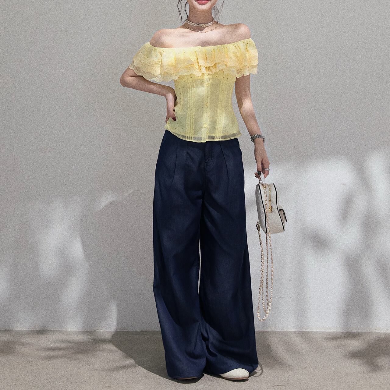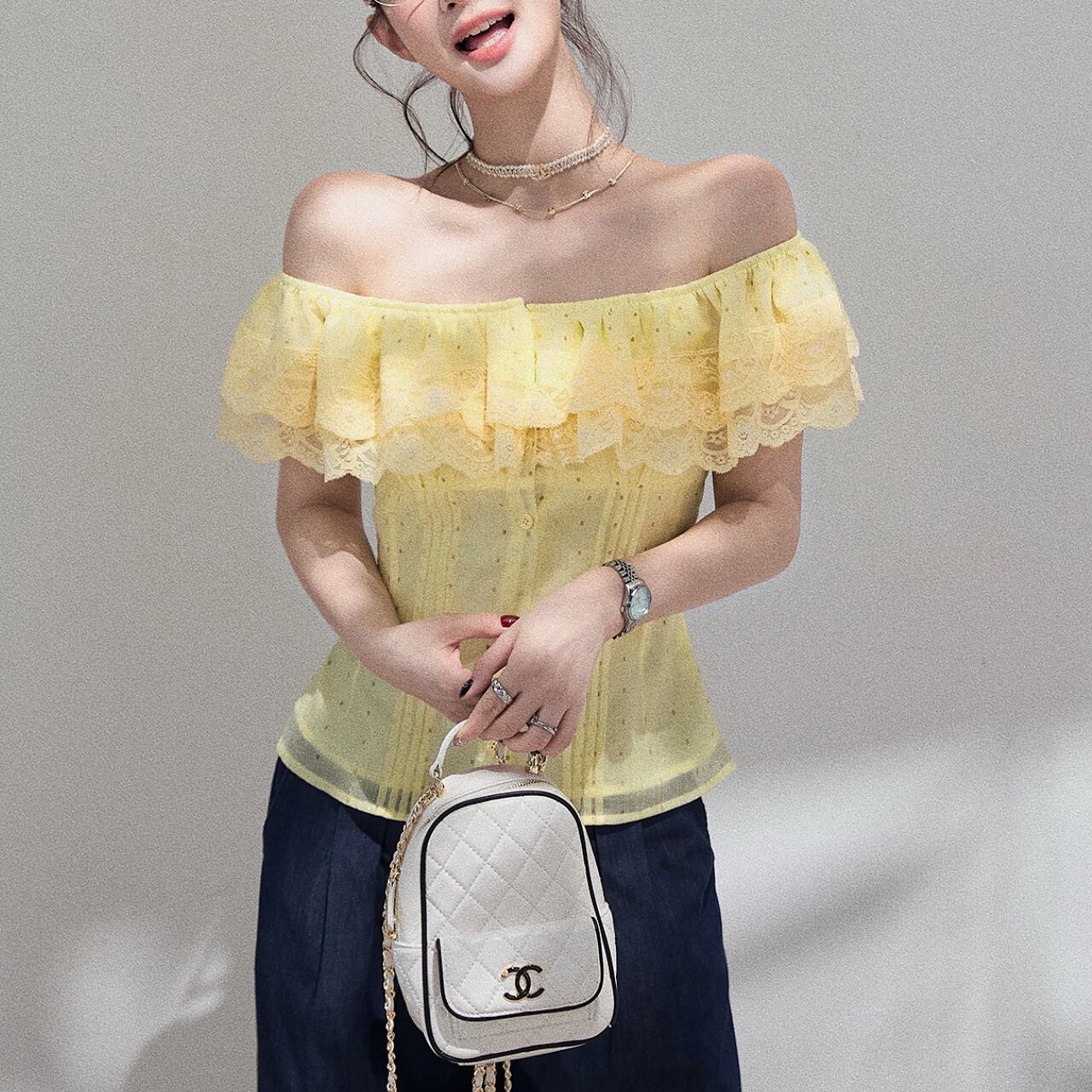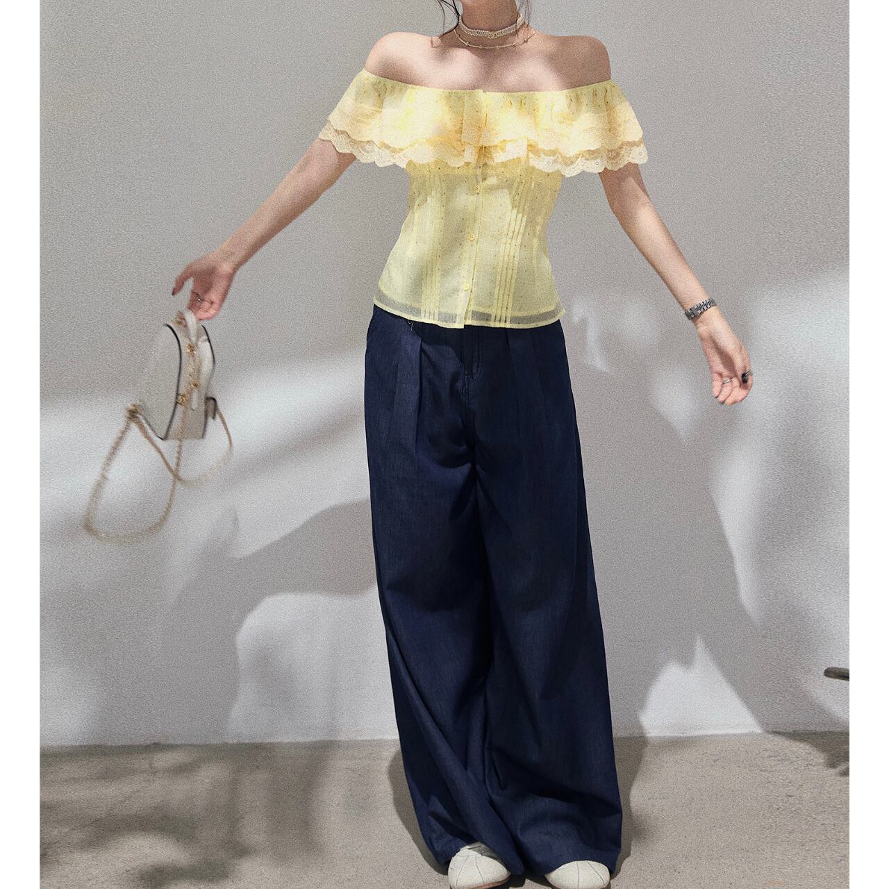 繊細なレースがオフショルダーのデザインを上品に引き立て、女性らしいシルエットを演出します。フレアスリーブが腕を華奢に見せ、さりげない可愛らしさをプラス。ちょっとしたお出かけから、旅行のコーディネートにもおすすめです◎