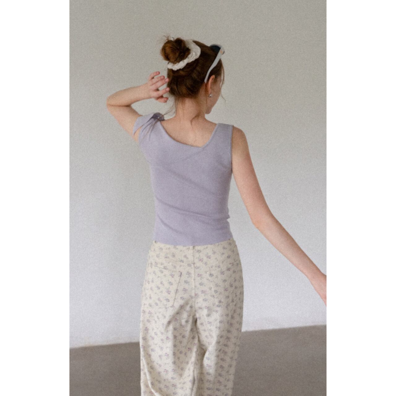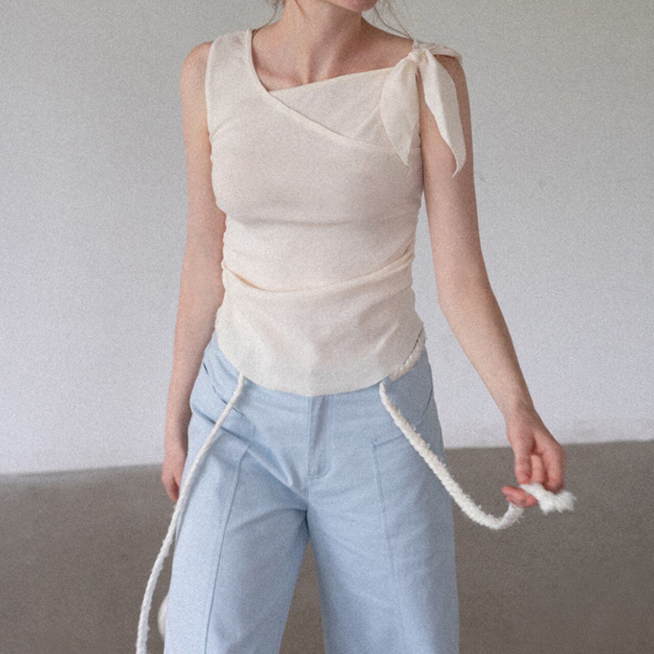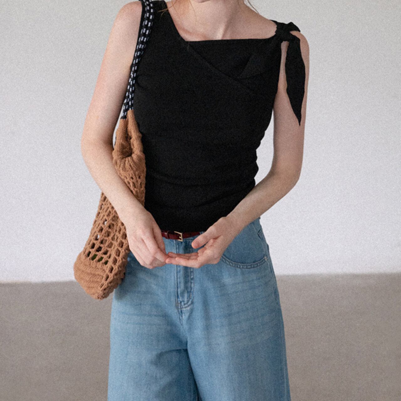 肩の結び目がアクセントとなり、シンプルなデザインながらもこなれた雰囲気を演出します。