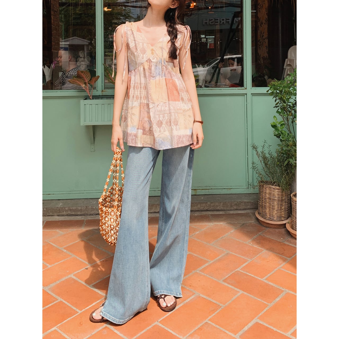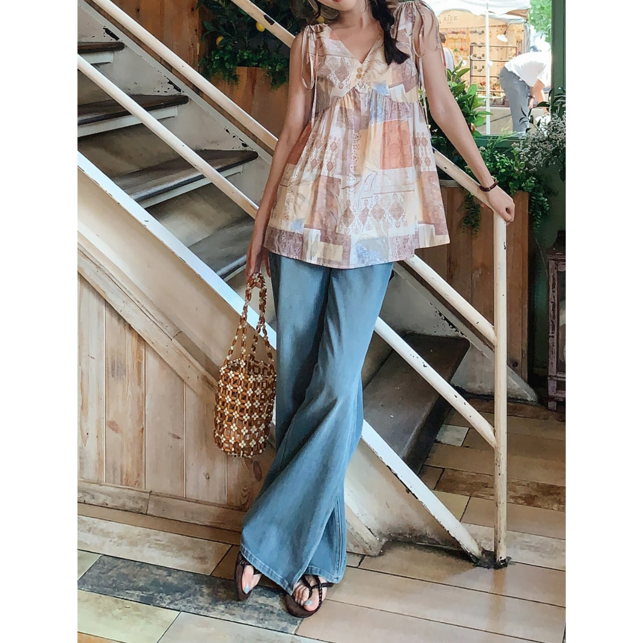Vネックキャミソールとハイウエストフレアデニムパンツのセット。ベルベットリボンがアクセントになった、女性らしいシルエットが魅力です。カフェでのランチや、お友達とのショッピングなど、様々なシーンで活躍するアイテム。大人の余裕を感じさせる、こなれたカジュアルスタイルを演出します◎