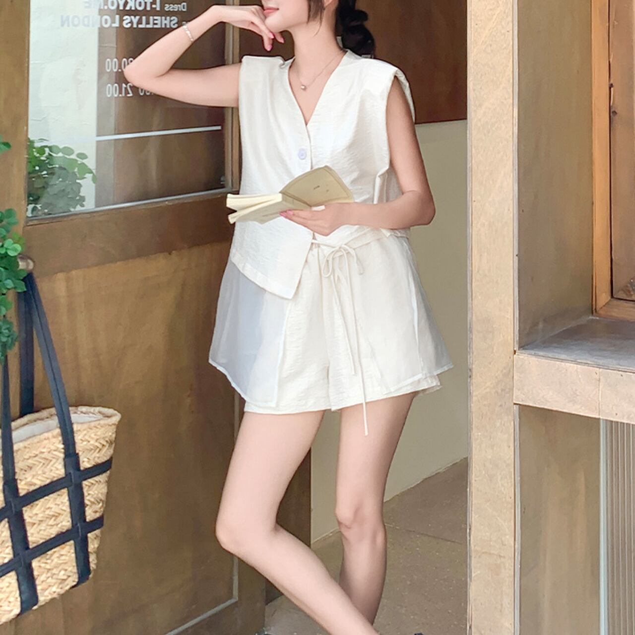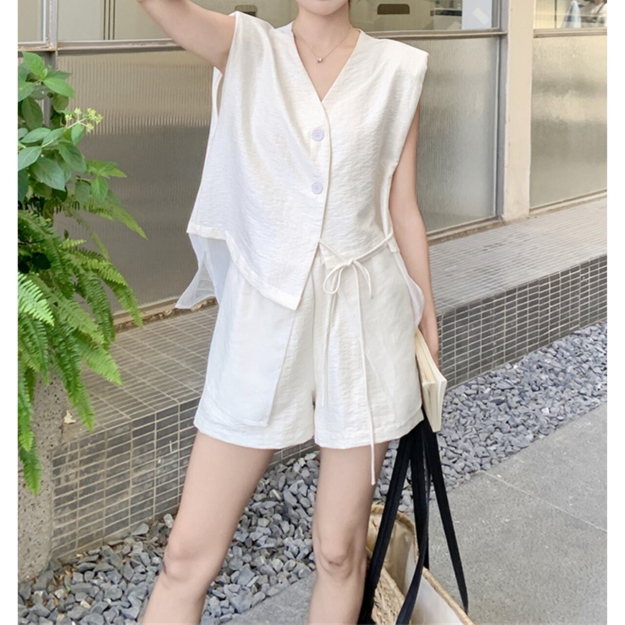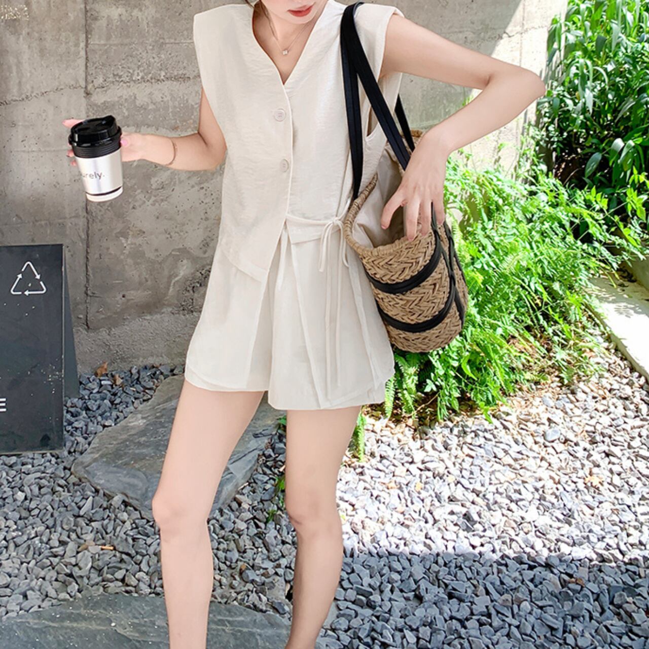 ノースリーブ Vネック ボタン留めブラウス& ウエスト紐付きショートパンツ セットアップ 00136