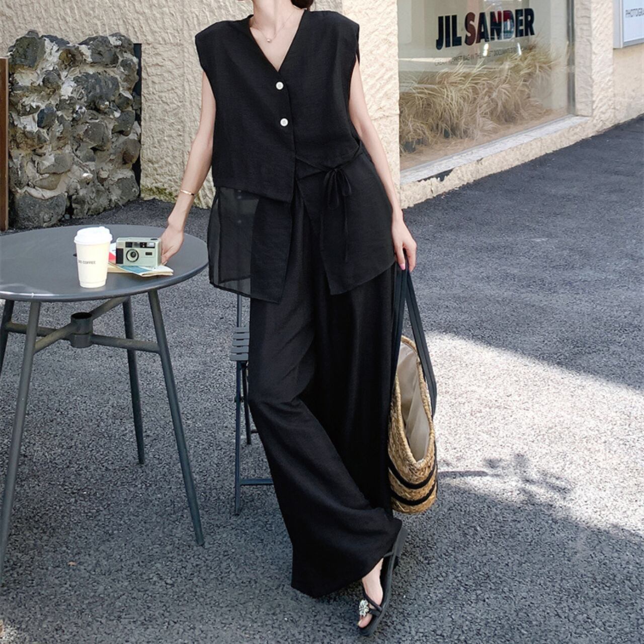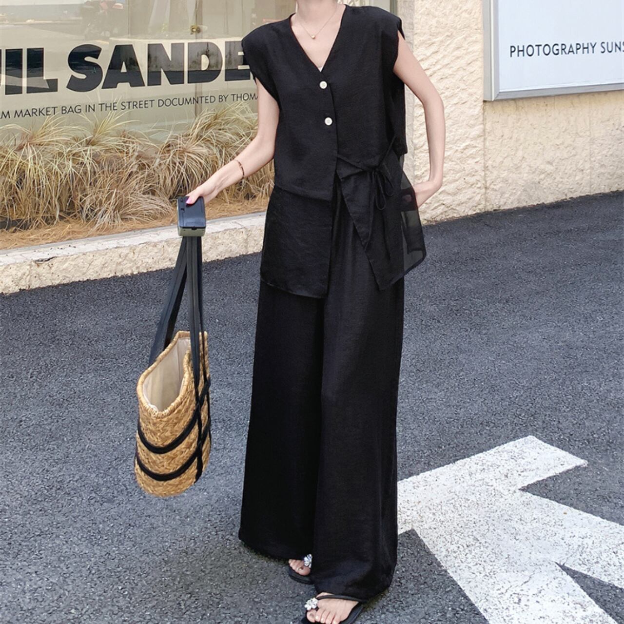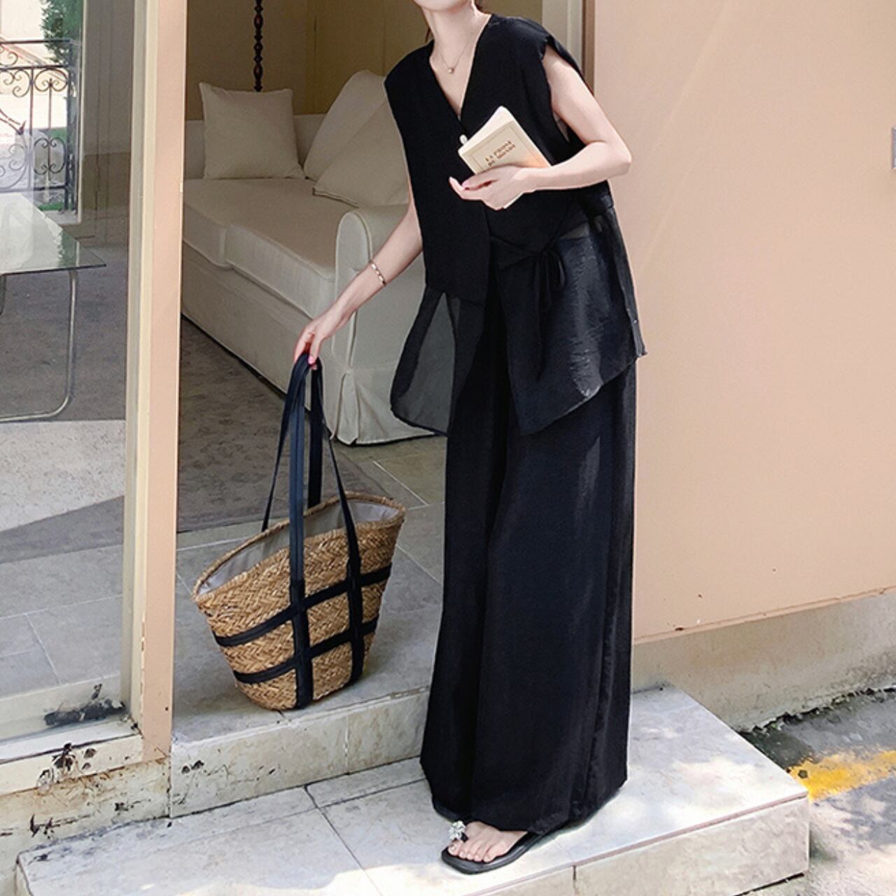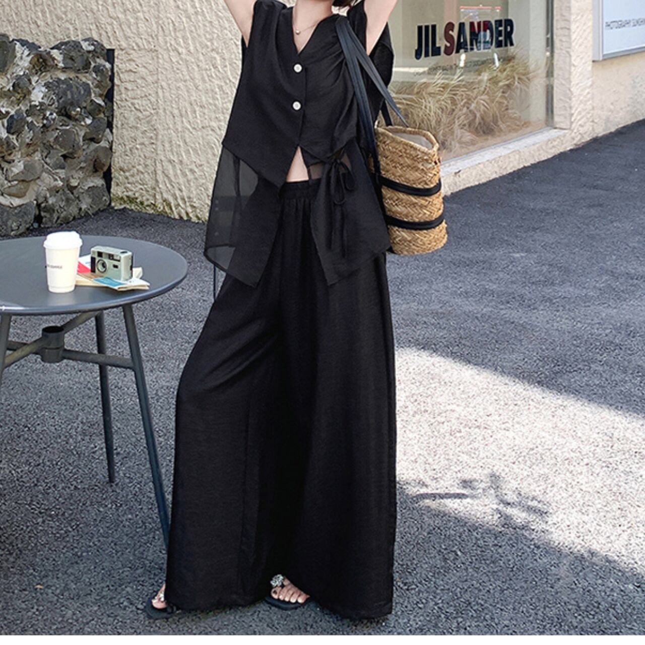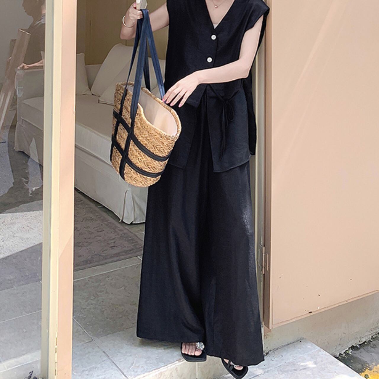 ノースリーブVネックで涼しげな印象のセットアップ。 ボタン開閉で着脱も簡単、パフスリーブが女性らしさを演出します。 ワイドパンツで体型カバーも叶い、旅行やちょっとしたお出かけにも◎ ◼️サイズ 【S】 肩幅: 44cm 胸囲: 102cm 着丈: 72cm 【M】 肩幅: 45cm 胸囲: 106cm 着丈: 73cm 【L】 肩幅: 46cm 胸囲: 110cm 着丈: 74cm 【XL】 肩幅: 47cm 胸囲: 114cm 着丈: 75cm ◼️カラー ブラック ◼️素材 【お届けについて】 こちらの商品は海外店舗より直接発送となる為、ご入金から1〜3週間でお届けいたします。 ◼️注意事項 ・タイミングによっては 商品在庫切れにより注文キャンセルとさせていただく恐れもございますので、予めご了承くださいませ。 ・日本製とは検品基準が異なる為、縫製などが若干甘い場合があります。 ・海外倉庫にて保管をしております。在庫情報に時差が生じますため在庫切れや生産中止、生産に遅れがある場合は、受注後でもキャンセルさせていただく恐れがございます。 ・商品の色味は、お手持ちのスマートフォンの画面によって実物と若干異なる場合がございます。 ・発送時期によりデザイン仕様(細部、素材など)の変更がある場合がございます。 ・イメージ違いやサイズ交換等、お客さまご都合による交換、返品は対応出来かねます。 ———————————— 誠に恐れ入りますが、ご購入前に以下をご確認頂きご承諾の上お買い求めくださいませ。 →https://petitelune.official.ec/about ————————————