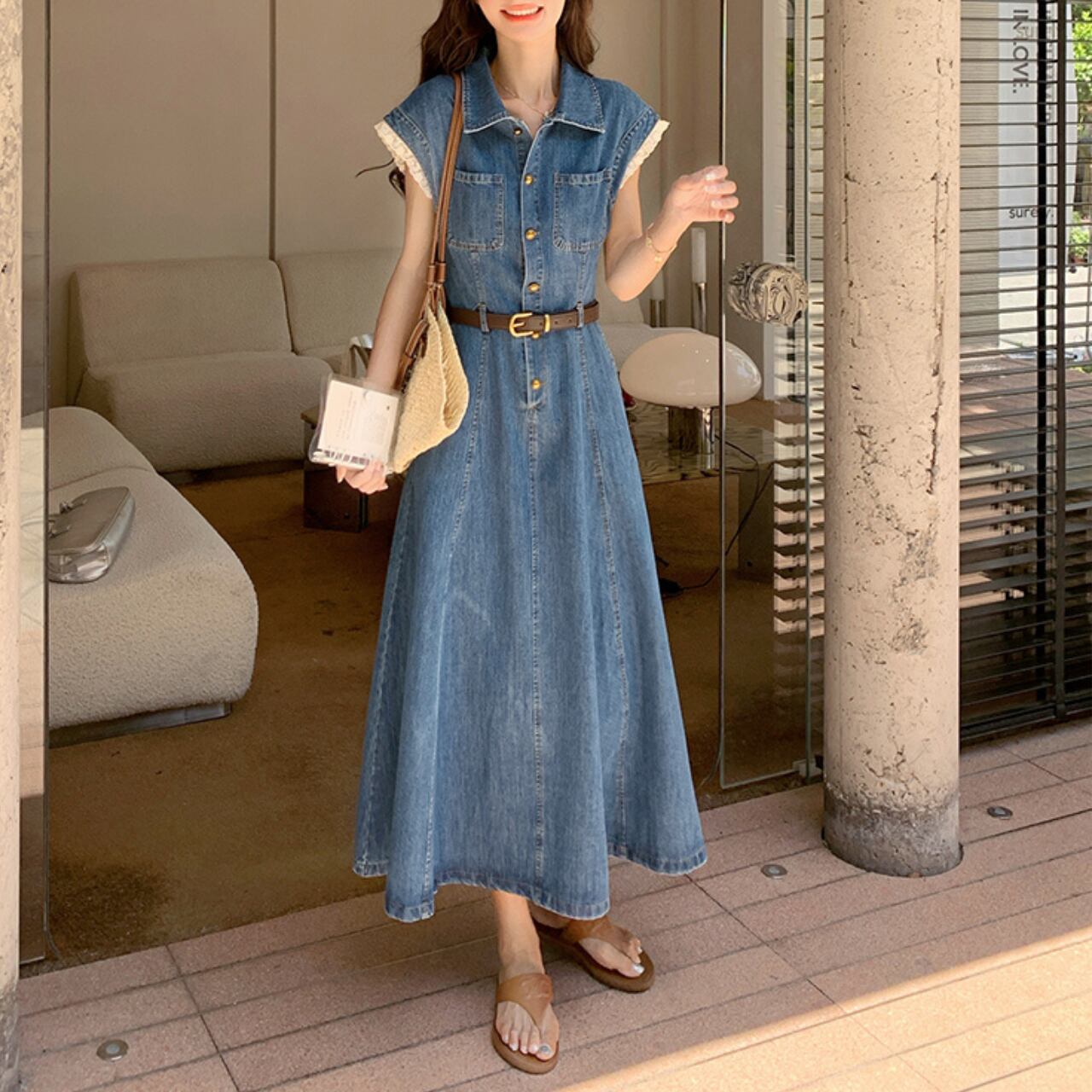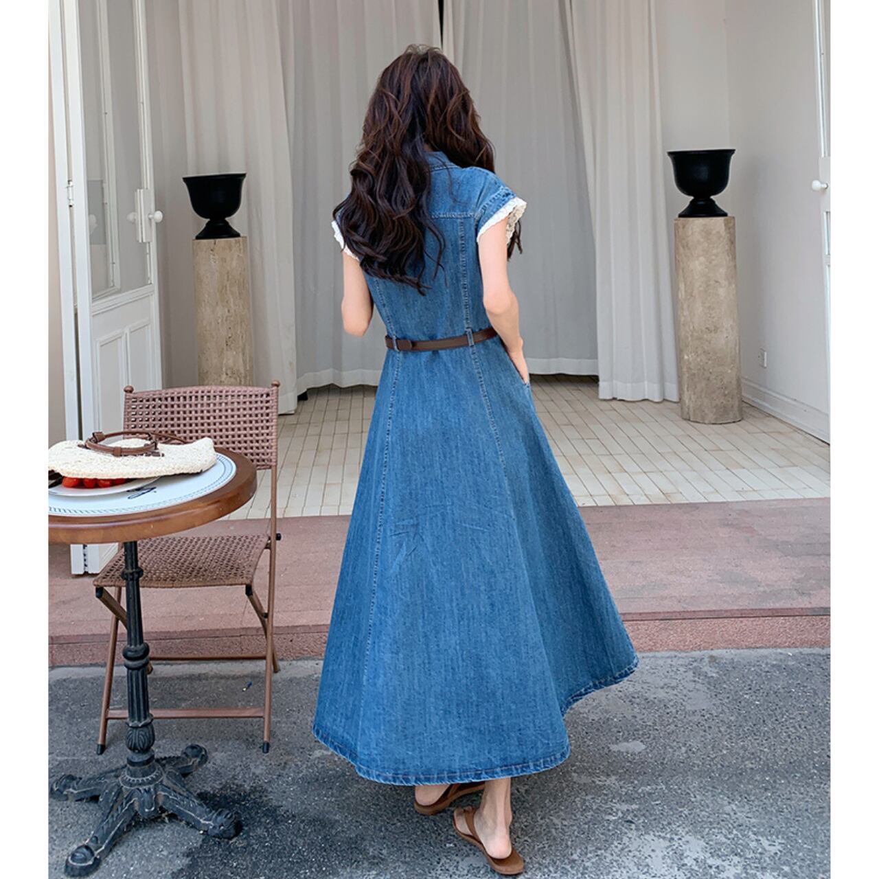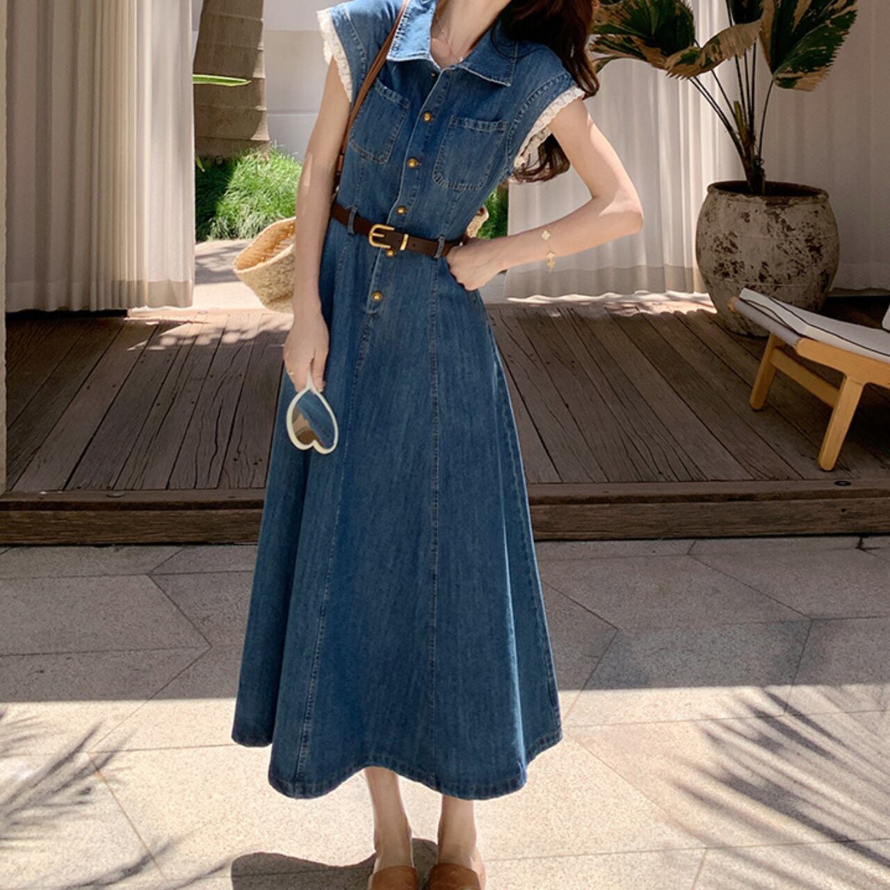 デニム素材のウエストマークAラインロングワンピース。上品なカジュアル感を演出する、一枚で着映えするアイテムです。程よく体にフィットするウエストマークと、Aラインシルエットが女性らしい美しいシルエットを作り出します。旅行やちょっとしたお出かけにも最適◎