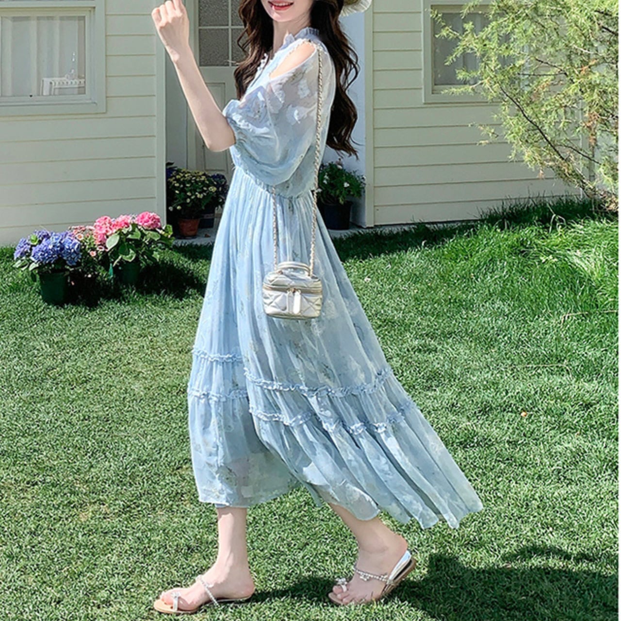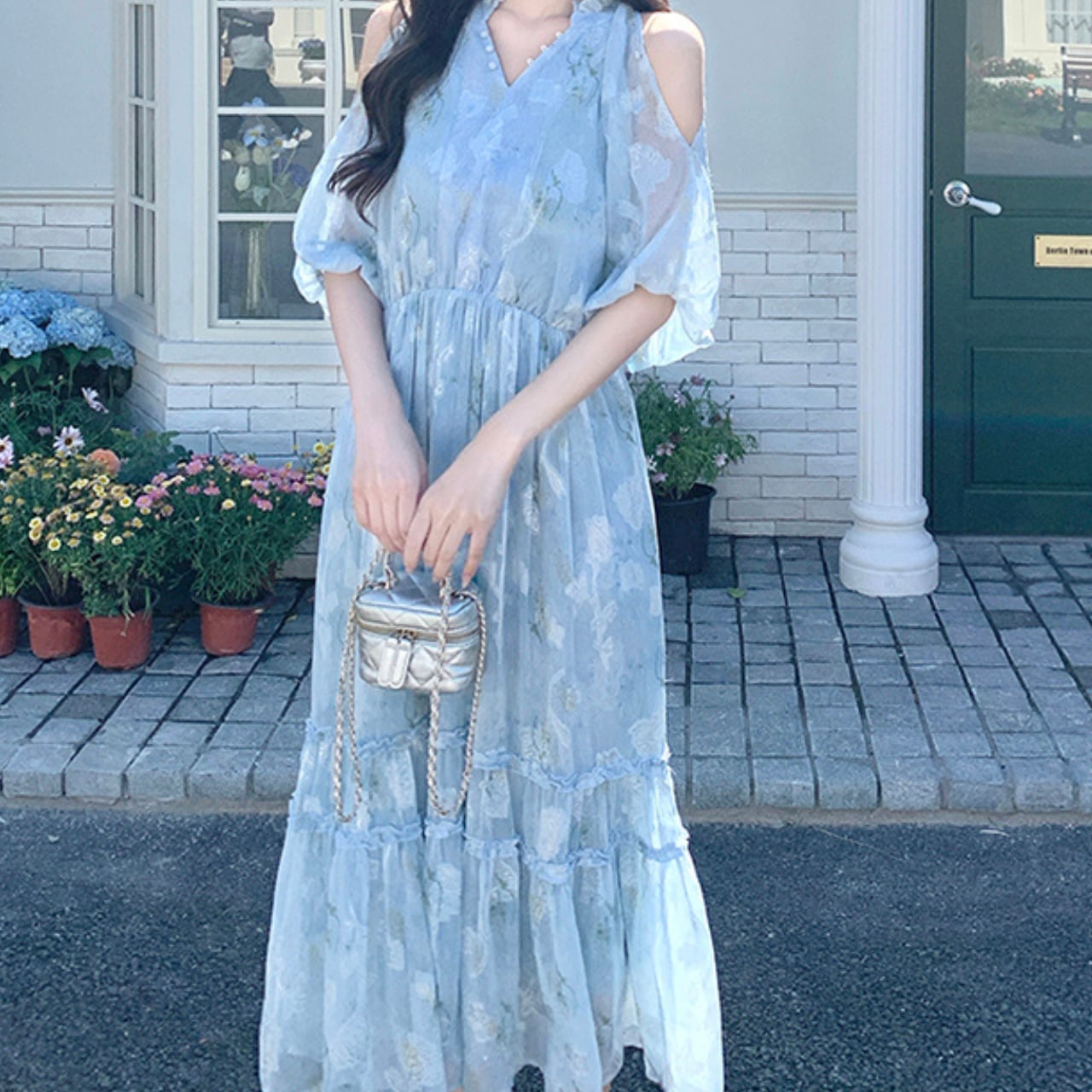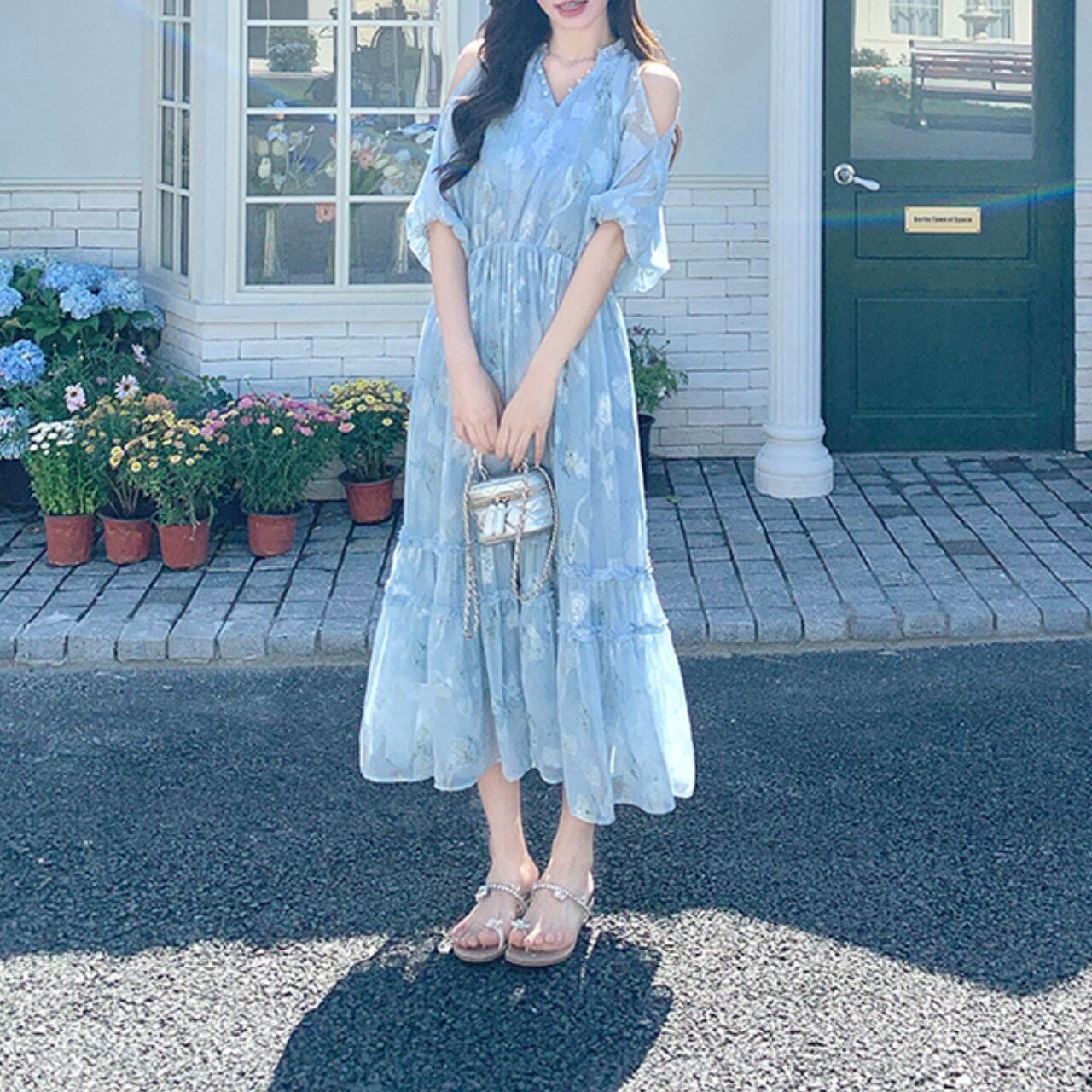 Vネックとオフショルダーのデザインが女性らしさを引き立てるマキシ丈ワンピース。軽やかなシルエットで、夏のデートやリゾートにもぴったりです。歩くたびに揺れる裾が、優雅な雰囲気を演出します。普段使いから特別な日のお出かけまで、幅広いシーンで活躍する一着です。