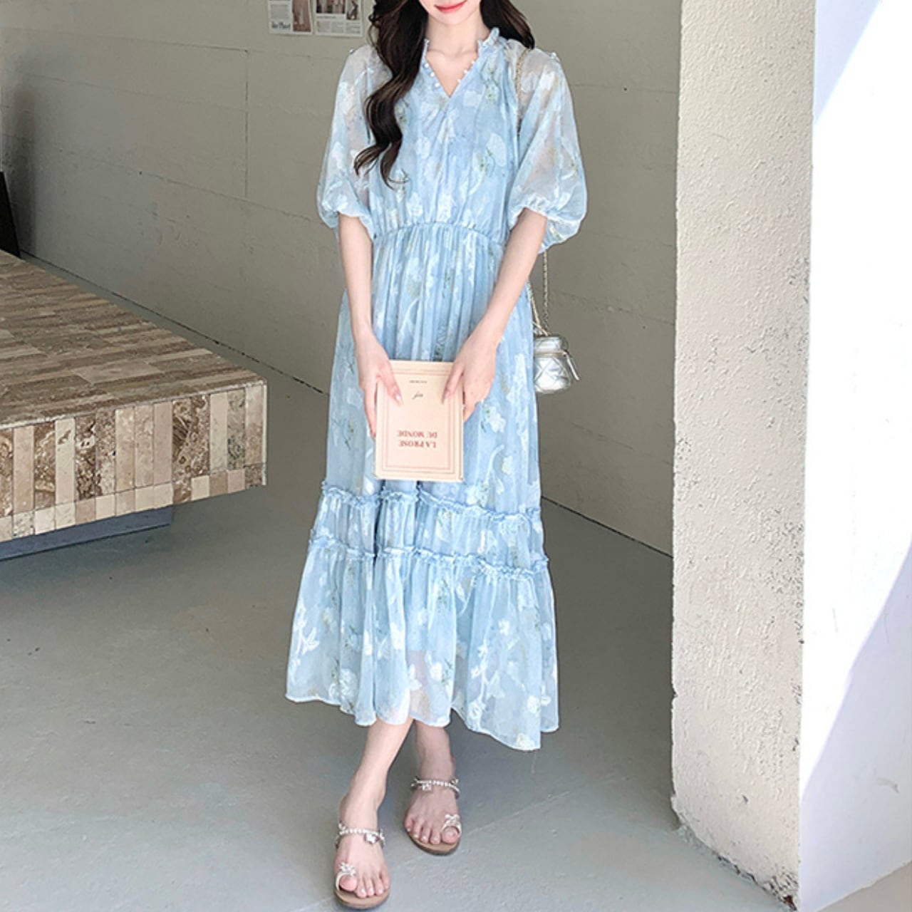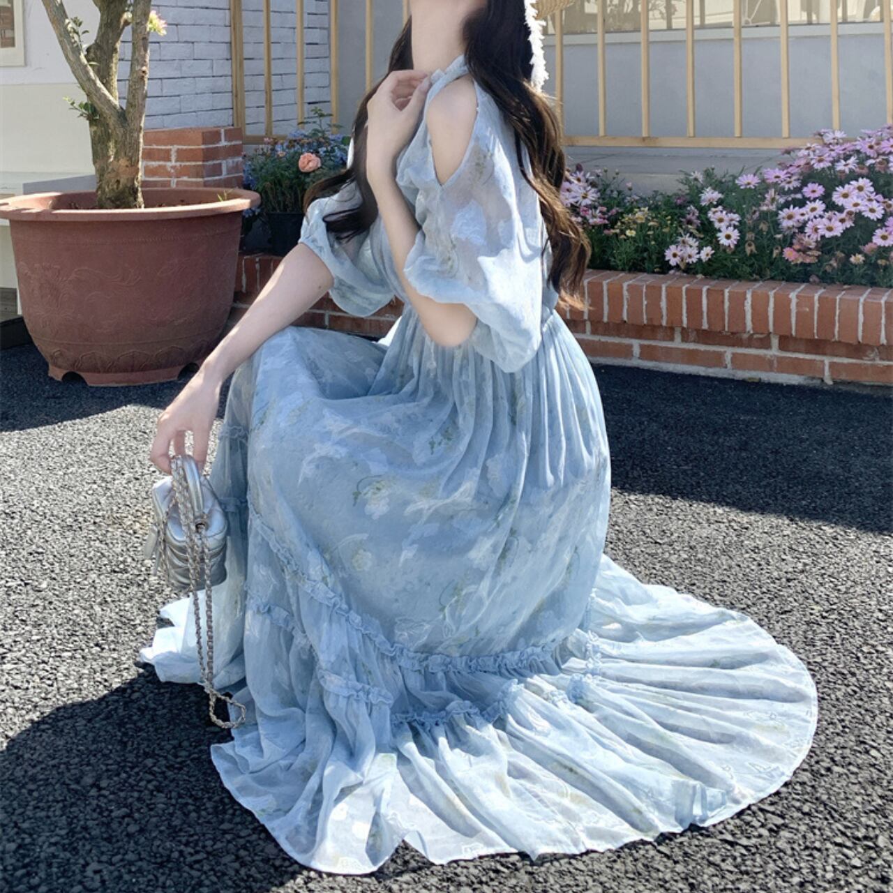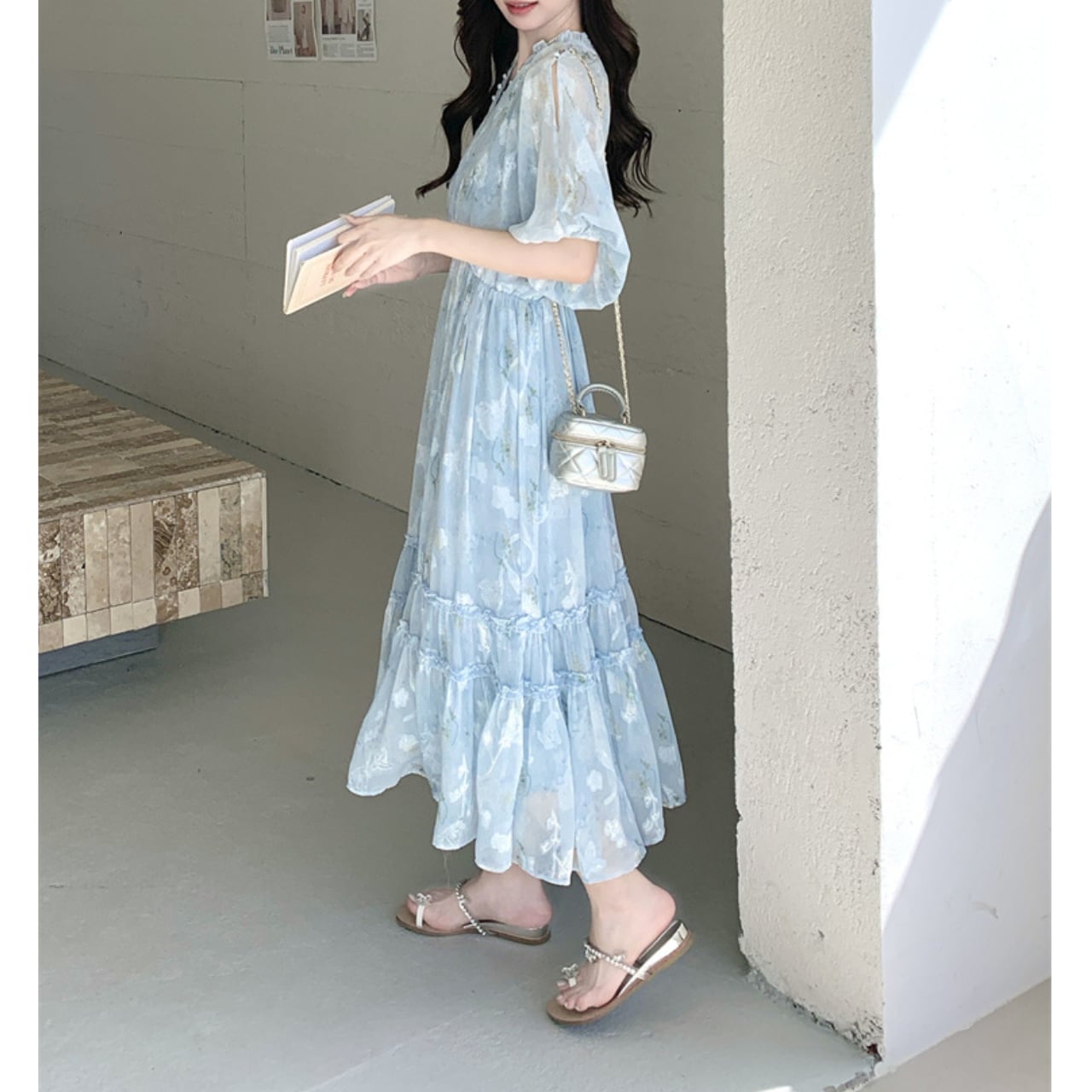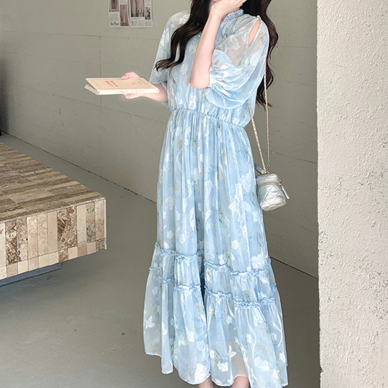 Vネックとオフショルダーのデザインが女性らしさを引き立てるマキシ丈ワンピース。軽やかなシルエットで、夏のデートやリゾートにもぴったりです。歩くたびに揺れる裾が、優雅な雰囲気を演出します。普段使いから特別な日のお出かけまで、幅広いシーンで活躍する一着です。