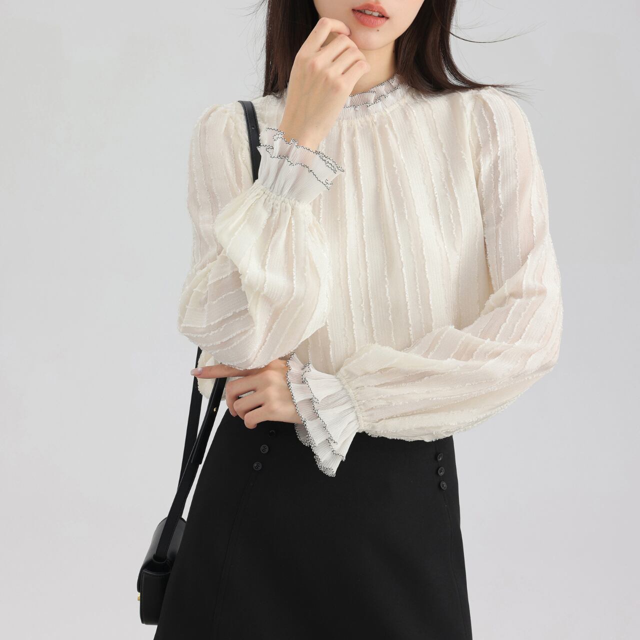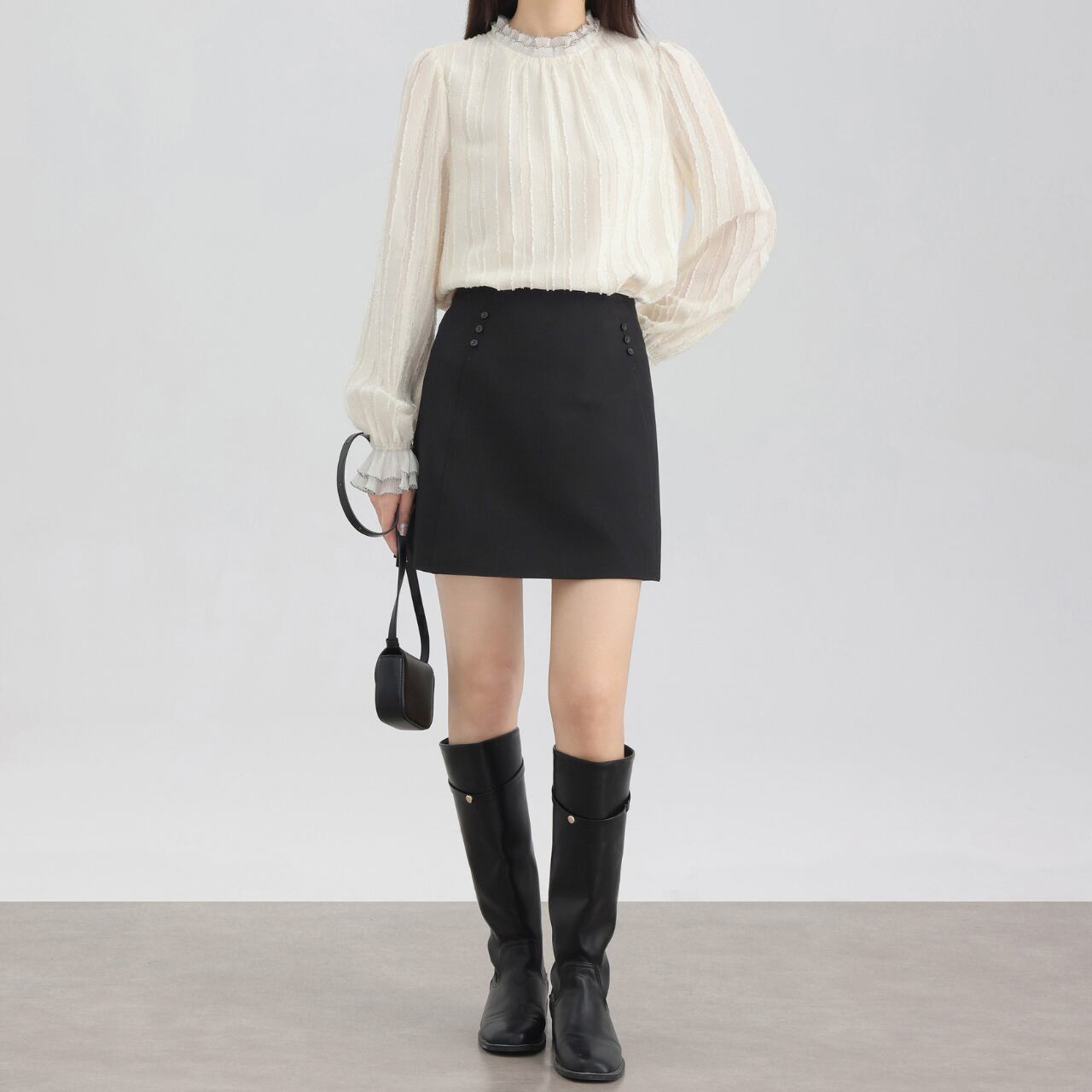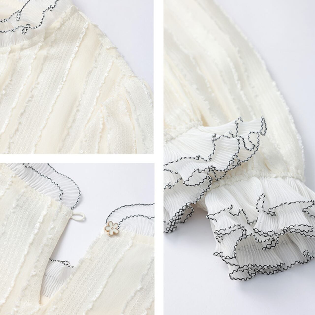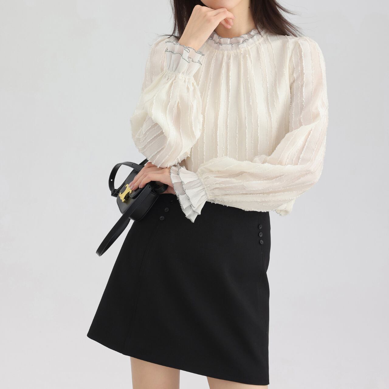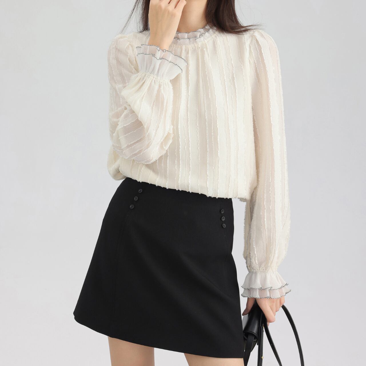 旅行やちょっとしたお出かけにもぴったりな フリルカフスハイネックシャーリングブラウス。着心地の良さも魅力で、一日中快適に過ごせます。シンプルなデザインながら、存在感があるので、コーディネートの主役としても活躍します◎