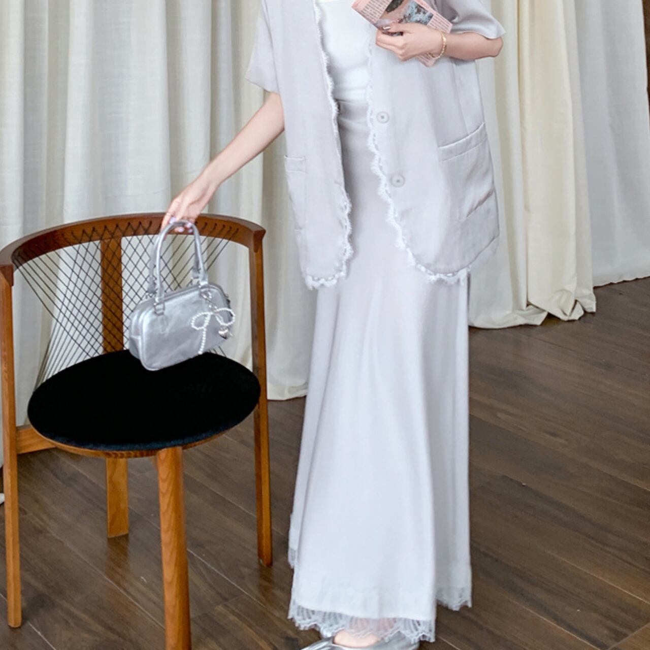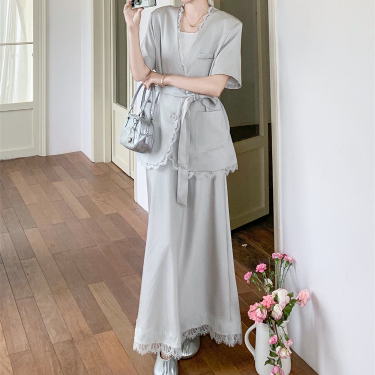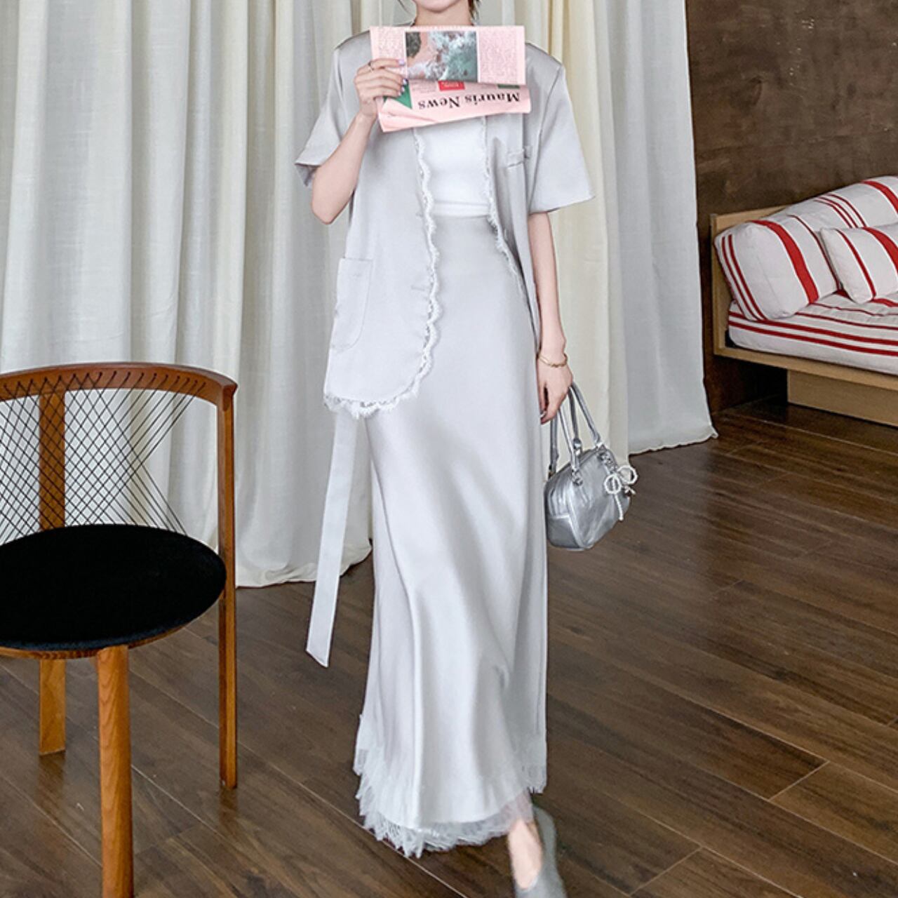 Aラインシルエットのマキシスカートとジャケットのセットアップです。 レーストリムが上品さをプラスし、大人の女性らしさを演出します。 普段使いはもちろん、旅行やちょっとしたお出かけにも◎。 一枚でこなれた着こなしが叶います。 ◼️サイズ 【S】 胸囲:102cm 着丈:64cm 【M】 胸囲:106cm 着丈:65cm 【L】 胸囲:110cm 着丈:66cm 【XL】 胸囲:114cm 着丈:67cm 【S】 ウエスト: 62cm スカート丈: 86cm 【M】 ウエスト: 66cm スカート丈: 87cm 【L】 ウエスト: 70cm スカート丈: 88cm 【XL】 ウエスト: 74cm スカート丈: 89cm ◼️カラー ホワイト 【お届けについて】 こちらの商品は海外店舗より直接発送となる為、ご入金から1〜3週間でお届けいたします。 ◼️注意事項 ・タイミングによっては 商品在庫切れにより注文キャンセルとさせていただく恐れもございますので、予めご了承くださいませ。 ・日本製とは検品基準が異なる為、縫製などが若干甘い場合があります。 ・海外倉庫にて保管をしております。在庫情報に時差が生じますため在庫切れや生産中止、生産に遅れがある場合は、受注後でもキャンセルさせていただく恐れがございます。 ・商品の色味は、お手持ちのスマートフォンの画面によって実物と若干異なる場合がございます。 ・発送時期によりデザイン仕様(細部、素材など)の変更がある場合がございます。 ・イメージ違いやサイズ交換等、お客さまご都合による交換、返品は対応出来かねます。 ———————————— 誠に恐れ入りますが、ご購入前に以下をご確認頂きご承諾の上お買い求めくださいませ。 →https://petitelune.official.ec/about ————————————
