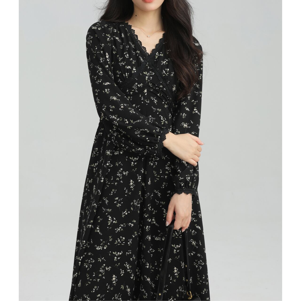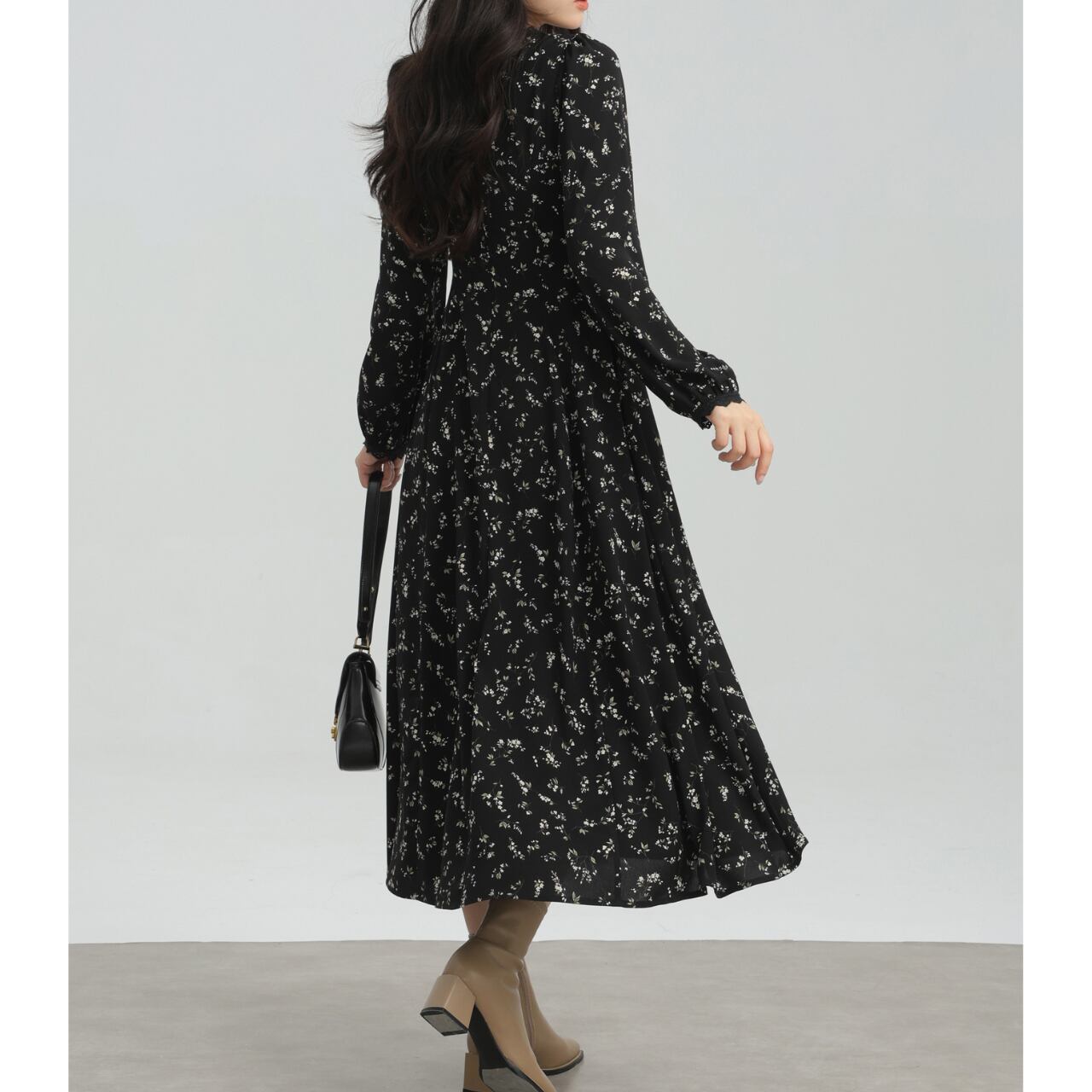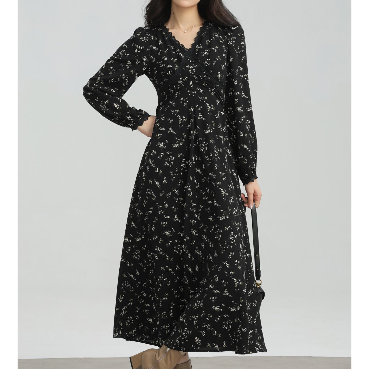 Vネック小花柄Aラインロングスリーブミモレ丈ワンピース 00202