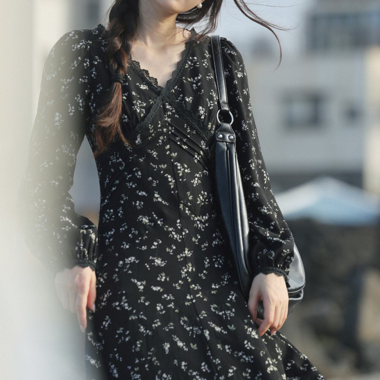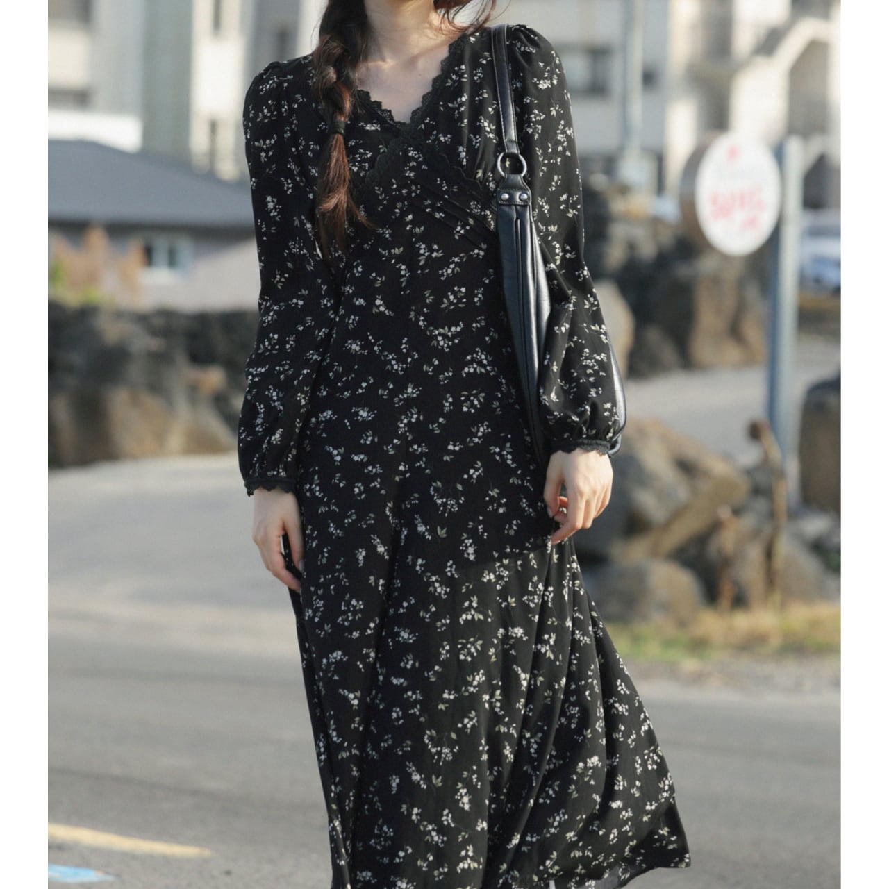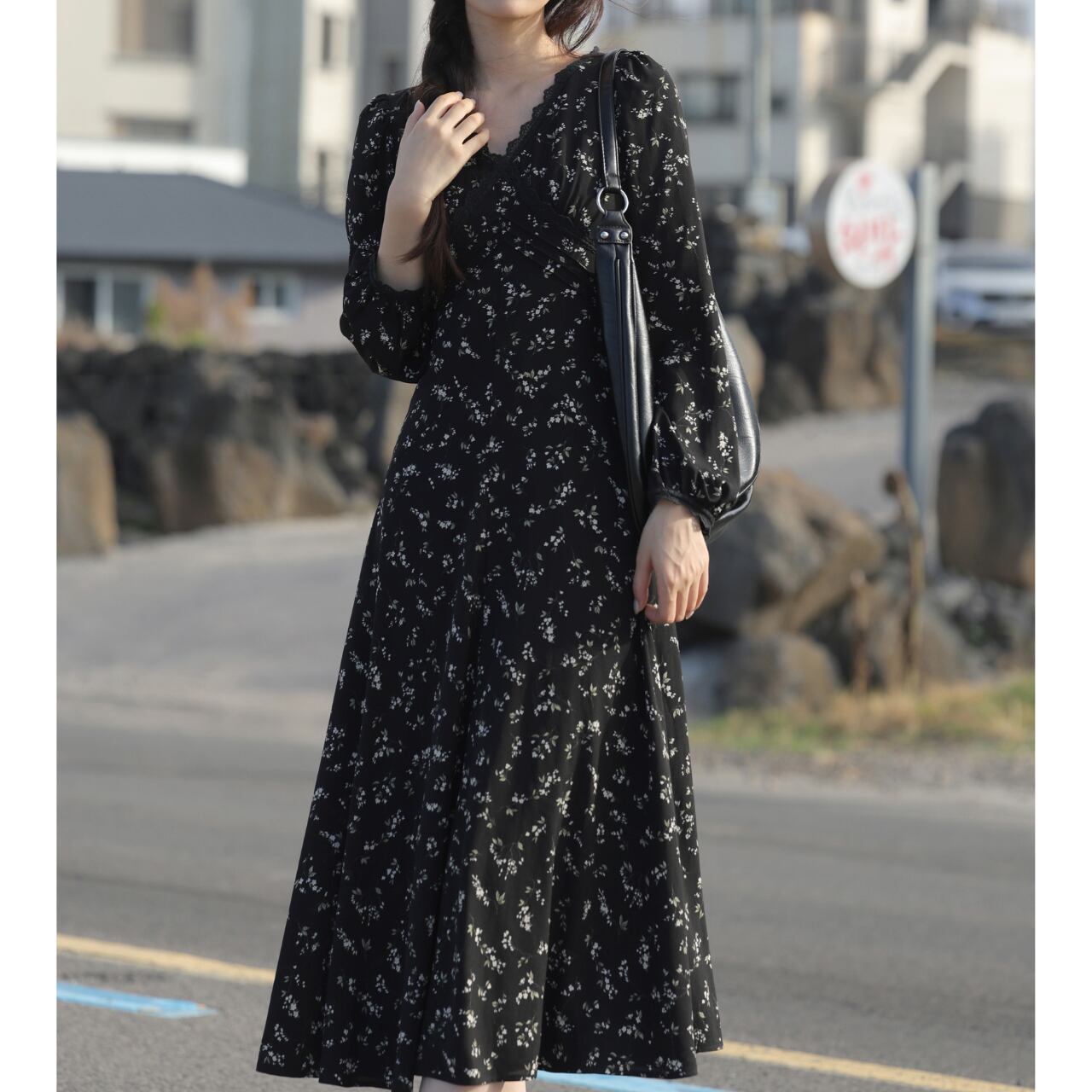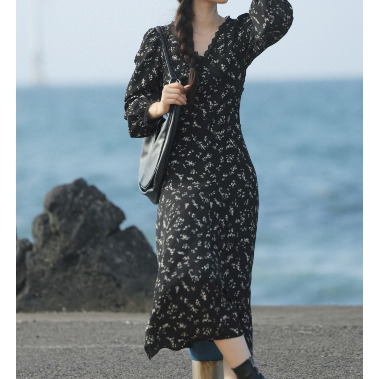 Vネック小花柄Aラインロングスリーブミモレ丈ワンピース 00202