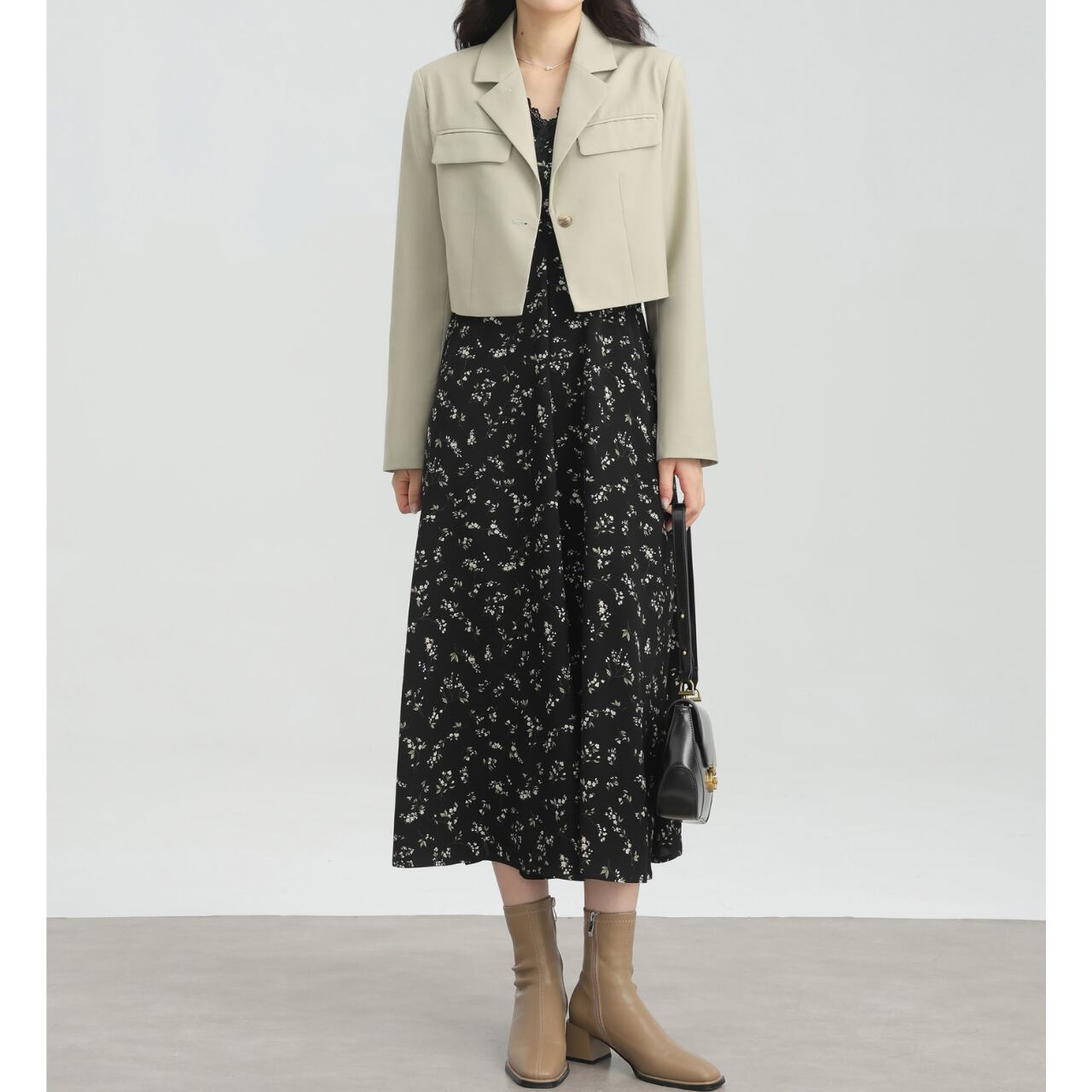 VネックのシャーリングとAラインシルエットが女性らしい、ミモレ丈ワンピース。さりげない花柄が、上品で落ち着いた印象を与えます。旅行や、ちょっとしたお出かけにもぴったり。着回し力の高さも魅力です◎