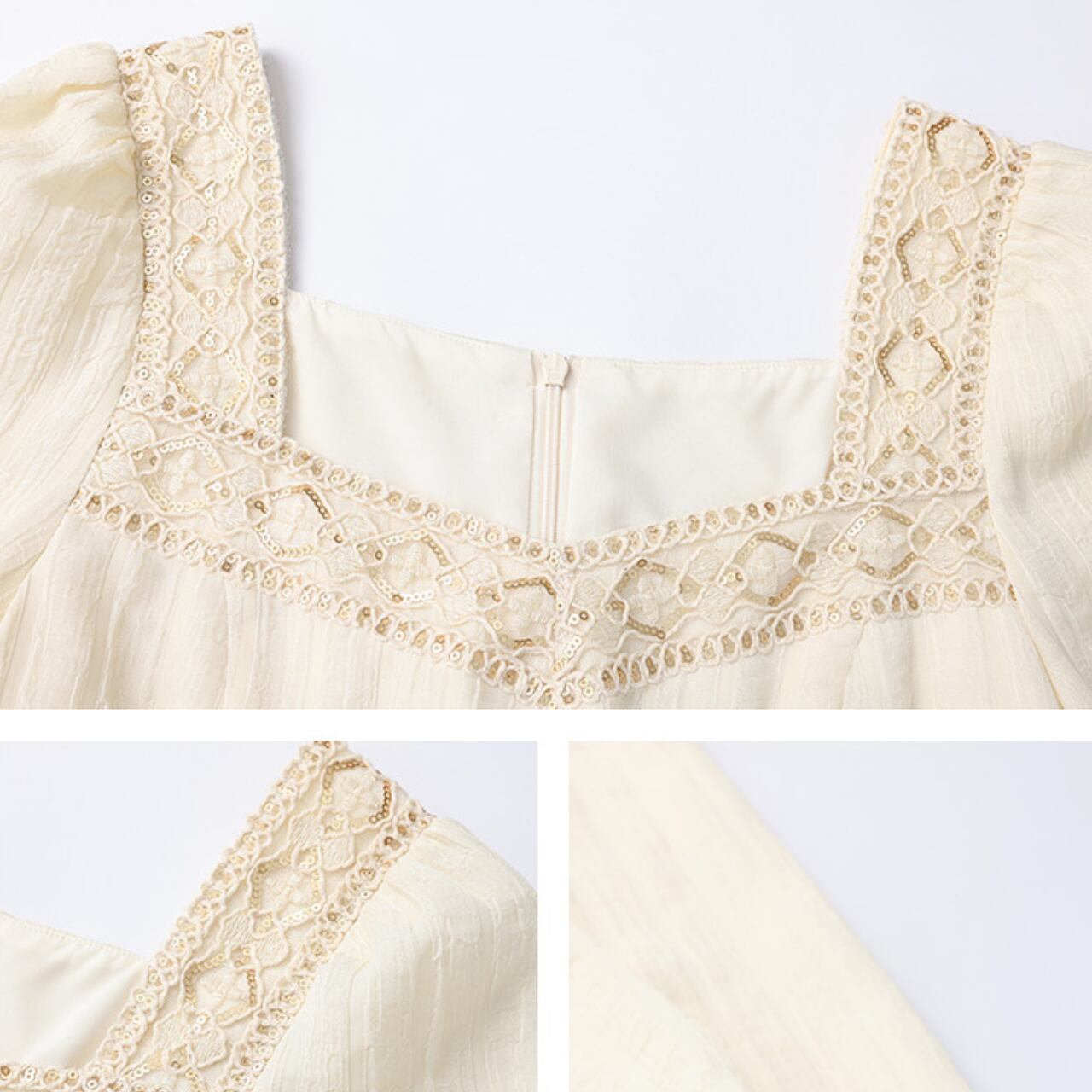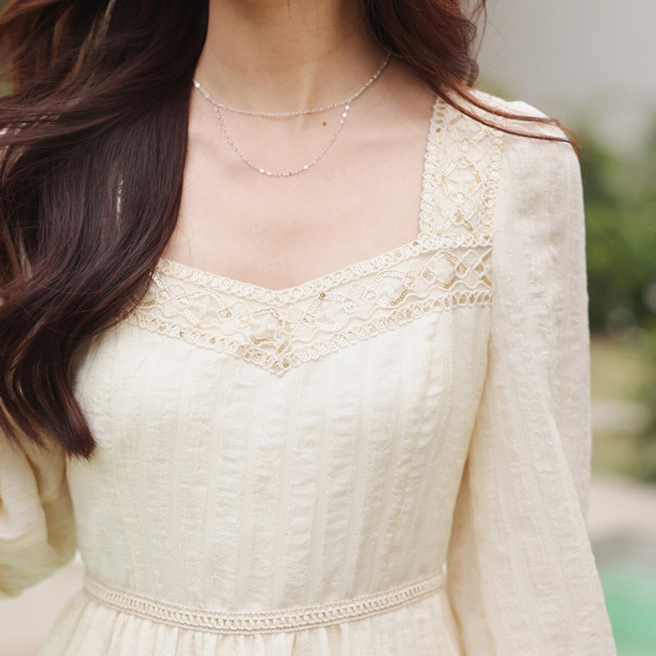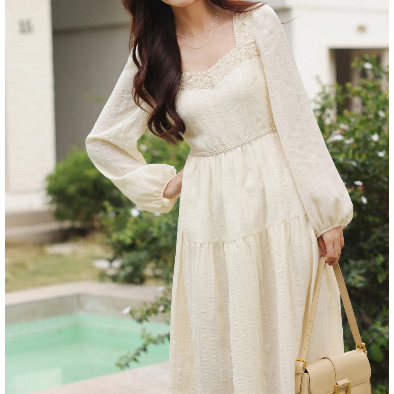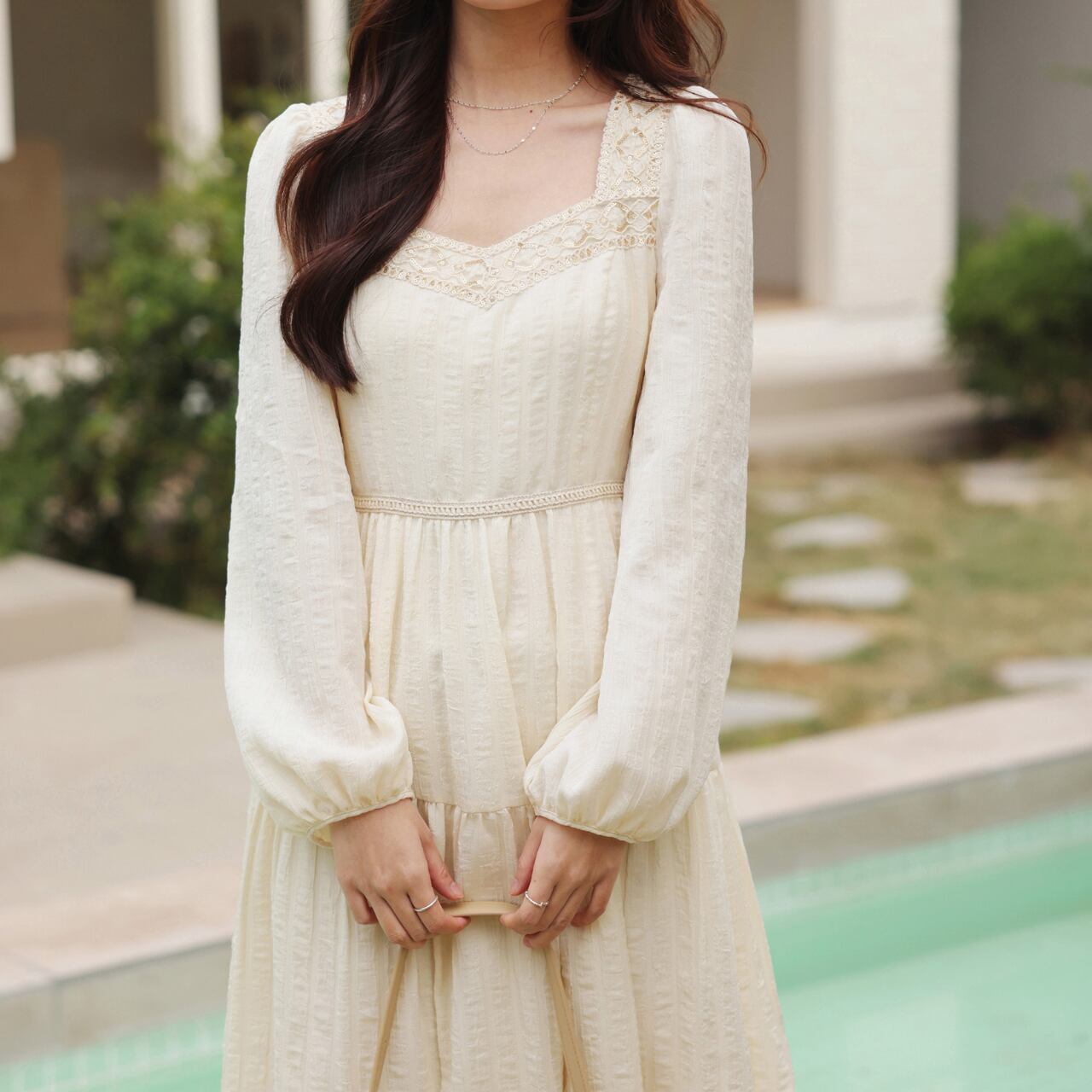 レースアップリケが繊細なアクセントになったロング丈ワンピース。バルーンスリーブが女性らしさを際立たせ、ティアードデザインのスカートが軽やかな動きを演出します。旅行や、ちょっとしたお出かけなど、様々なシーンで活躍すること間違いなし◎