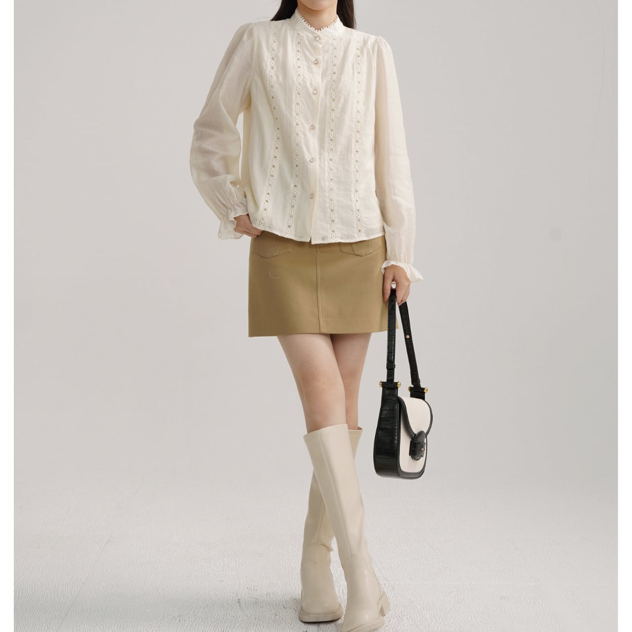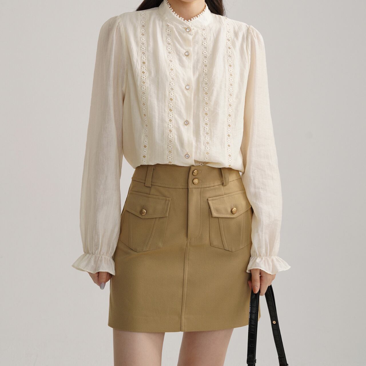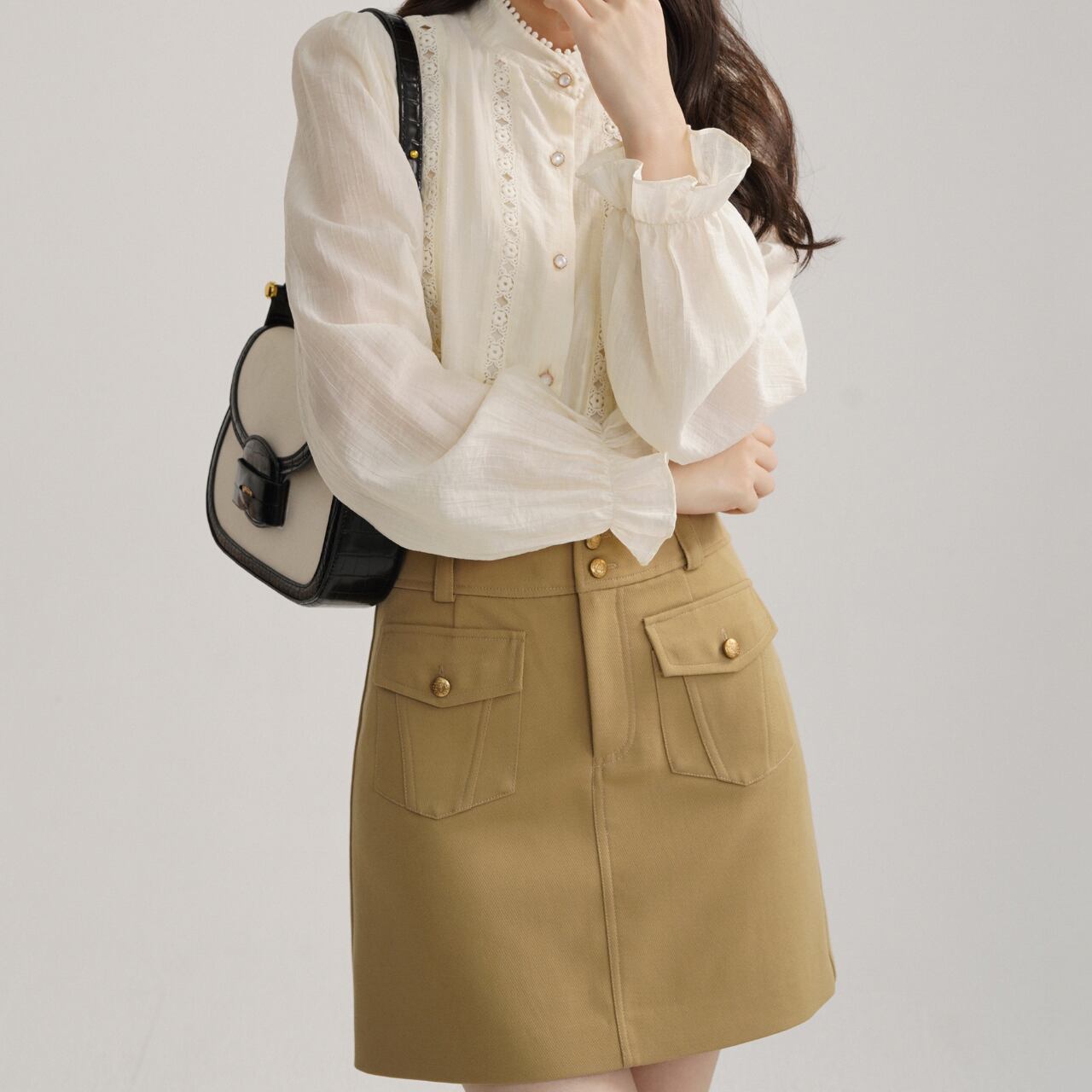 レース切替 Vネック バルーンスリーブ ロングスリーブブラウス 00182
