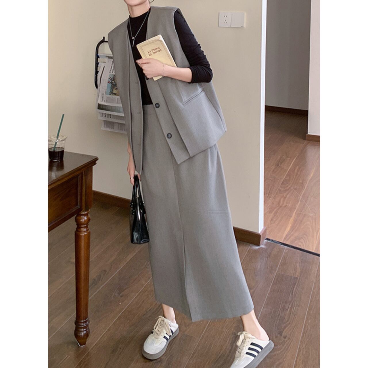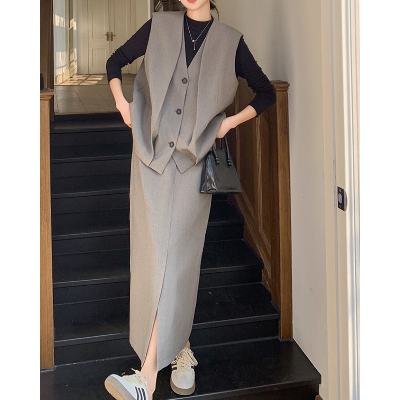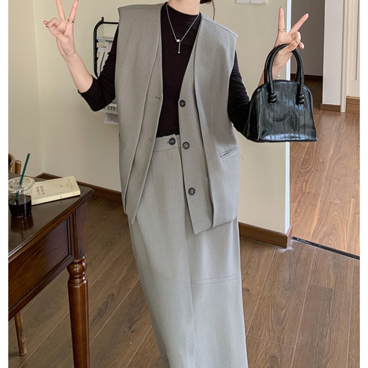 洗練されたデザインのロングベストとスカートのセットアップ。 ロング丈のベストは、気になる腰回りもカバー。 Aラインシルエットのスカートが、女性らしい柔らかな印象を与えます。 普段使いはもちろん、お出かけにもおすすめです◎ ◼️サイズ 【S】 肩幅: 41cm 胸囲: 108cm 着丈: 59cm 【M】 肩幅: 42cm 胸囲: 112cm 着丈: 60cm 【L】 肩幅: 43cm 胸囲: 116cm 着丈: 61cm 【XL】 肩幅: 44cm 胸囲: 120cm 着丈: 62cm 【S】ウエスト:66cm スカート丈:80cm 【M】ウエスト:70cm スカート丈:81cm 【L】ウエスト:74cm スカート丈:82cm 【XL】ウエスト:78cm スカート丈:83cm ◼️カラー グレー 【お届けについて】 こちらの商品は海外店舗より直接発送となる為、ご入金から1〜3週間でお届けいたします。 ◼️注意事項 ・タイミングによっては 商品在庫切れにより注文キャンセルとさせていただく恐れもございますので、予めご了承くださいませ。 ・日本製とは検品基準が異なる為、縫製などが若干甘い場合があります。 ・海外倉庫にて保管をしております。在庫情報に時差が生じますため在庫切れや生産中止、生産に遅れがある場合は、受注後でもキャンセルさせていただく恐れがございます。 ・商品の色味は、お手持ちのスマートフォンの画面によって実物と若干異なる場合がございます。 ・発送時期によりデザイン仕様(細部、素材など)の変更がある場合がございます。 ・イメージ違いやサイズ交換等、お客さまご都合による交換、返品は対応出来かねます。 ———————————— 誠に恐れ入りますが、ご購入前に以下をご確認頂きご承諾の上お買い求めくださいませ。 →https://petitelune.official.ec/about ————————————