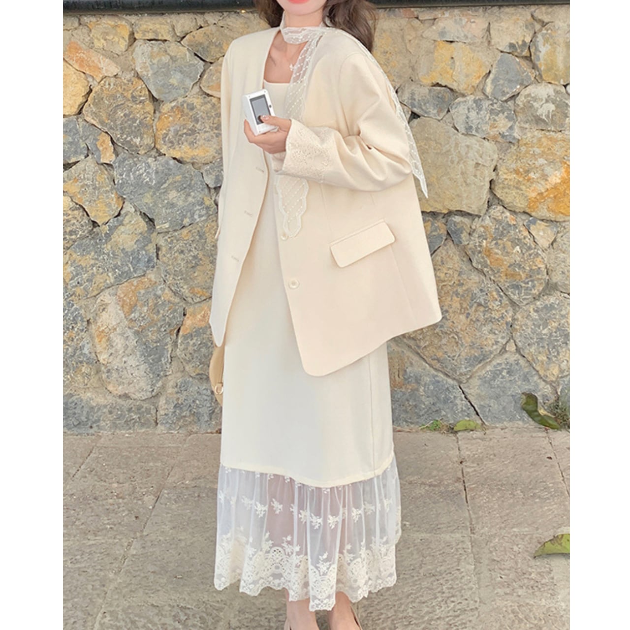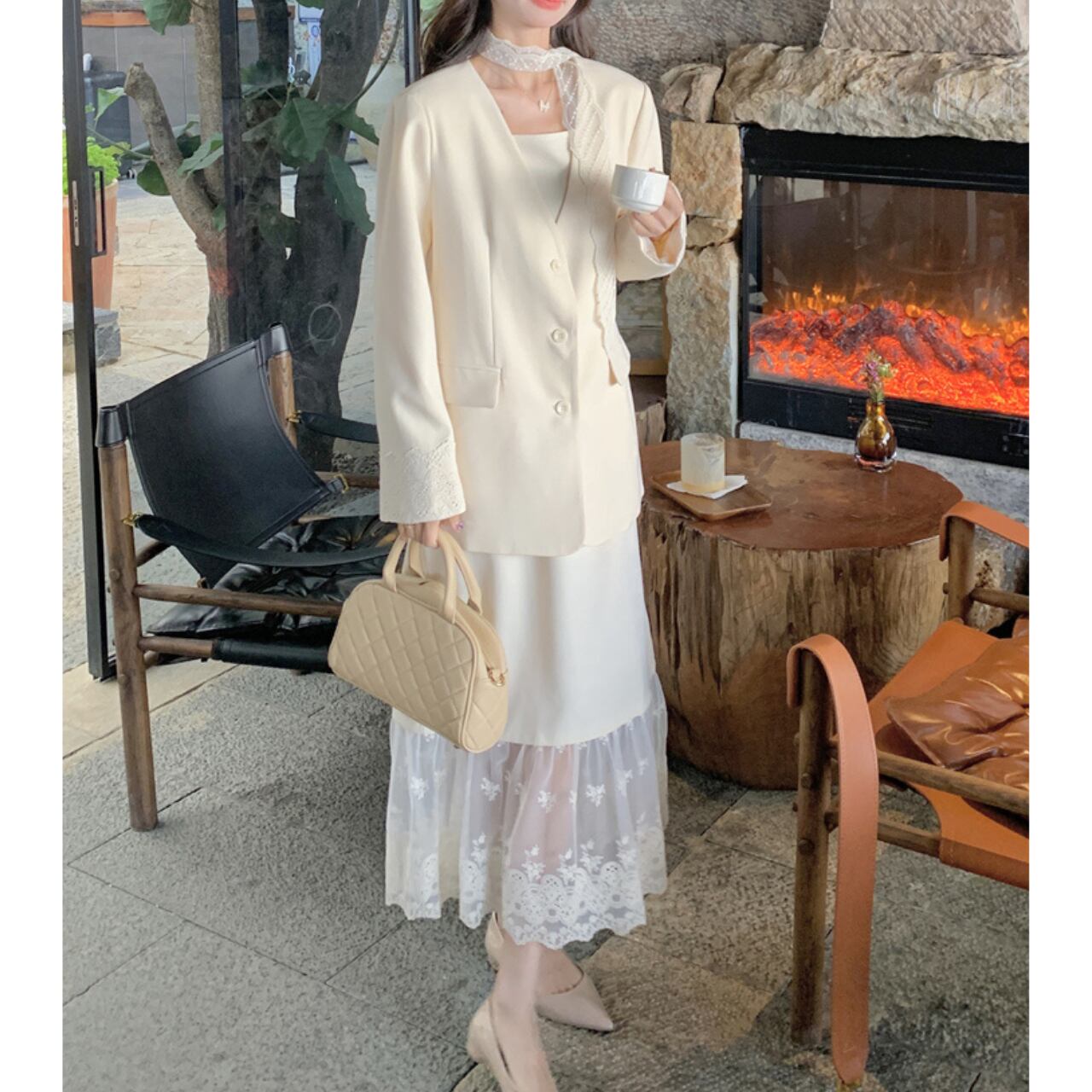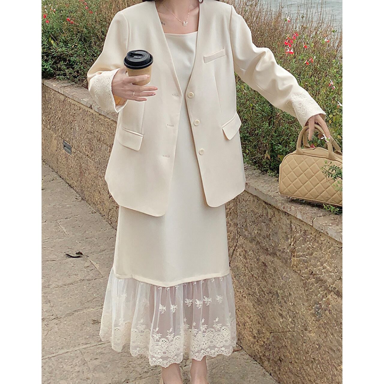 ノッチドラペルジャケットとレース切替フレアスカートセット00190