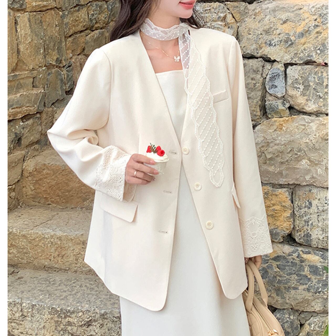 テーラードカラーのジャケットと、裾にレースをあしらったフレアスカートのセットアップ。上品で落ち着いた雰囲気を醸し出し、大人の女性の魅力を引き立てます。程よくきちんと感がありながら、女性らしい優しさを兼ね備えたデザインは、様々なシーンで好印象を与えてくれます。お仕事にも、お出かけにもおすすめです。