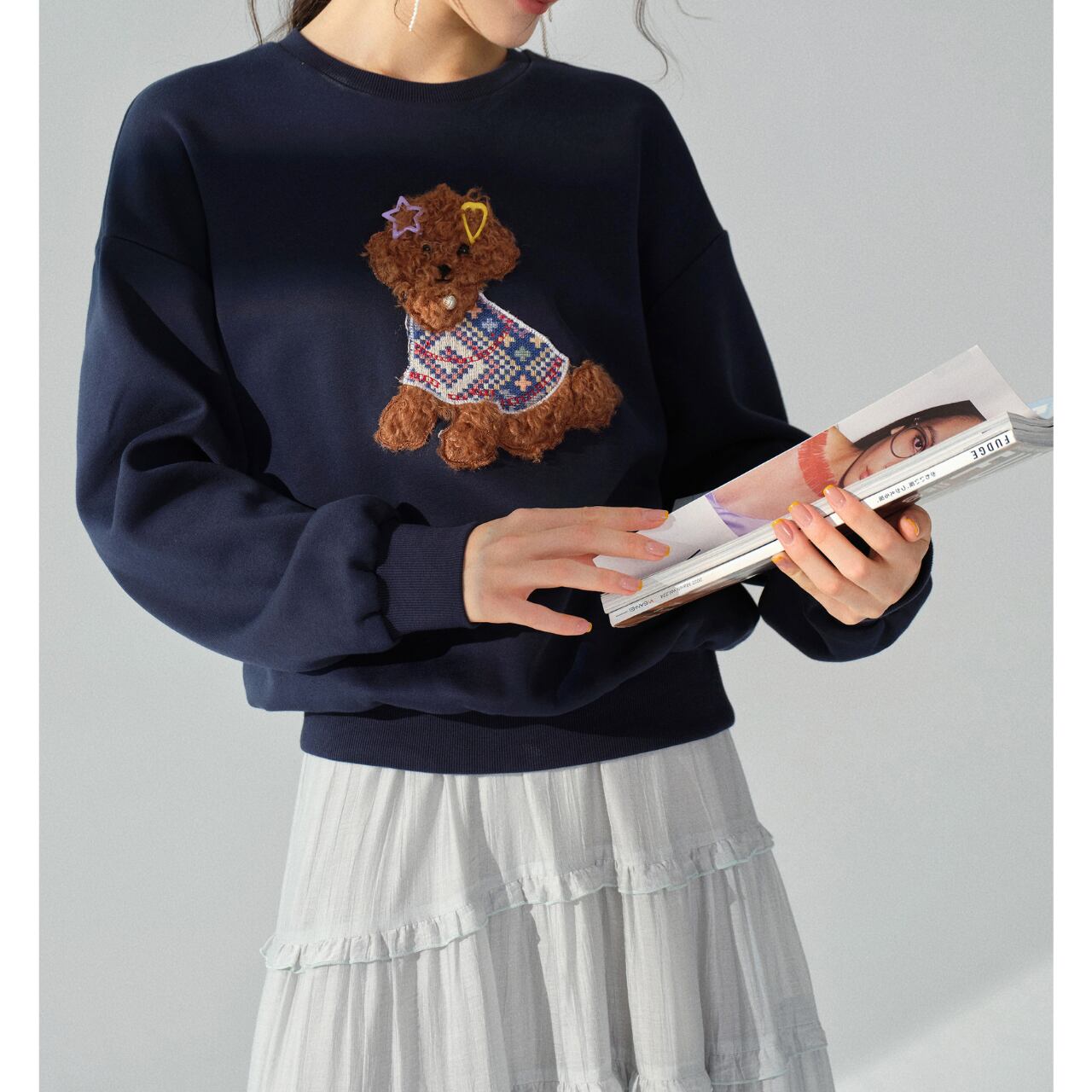 アップリケ付きドロップショルダークルーネックトップス 00213