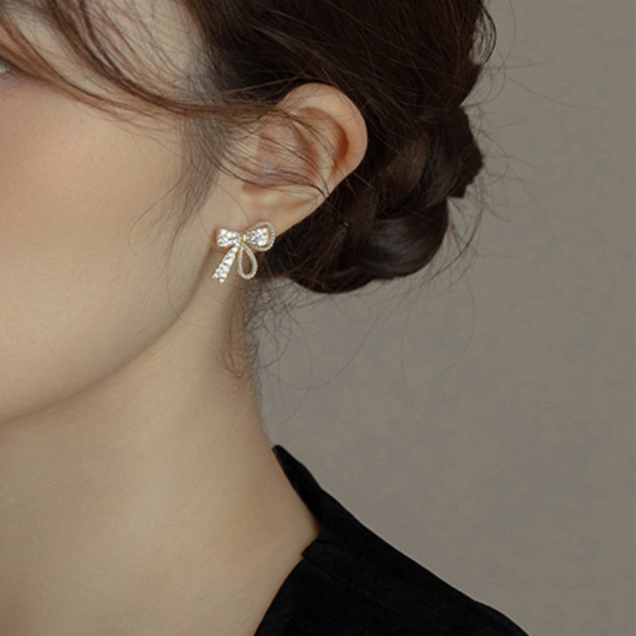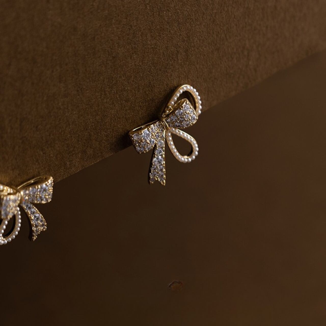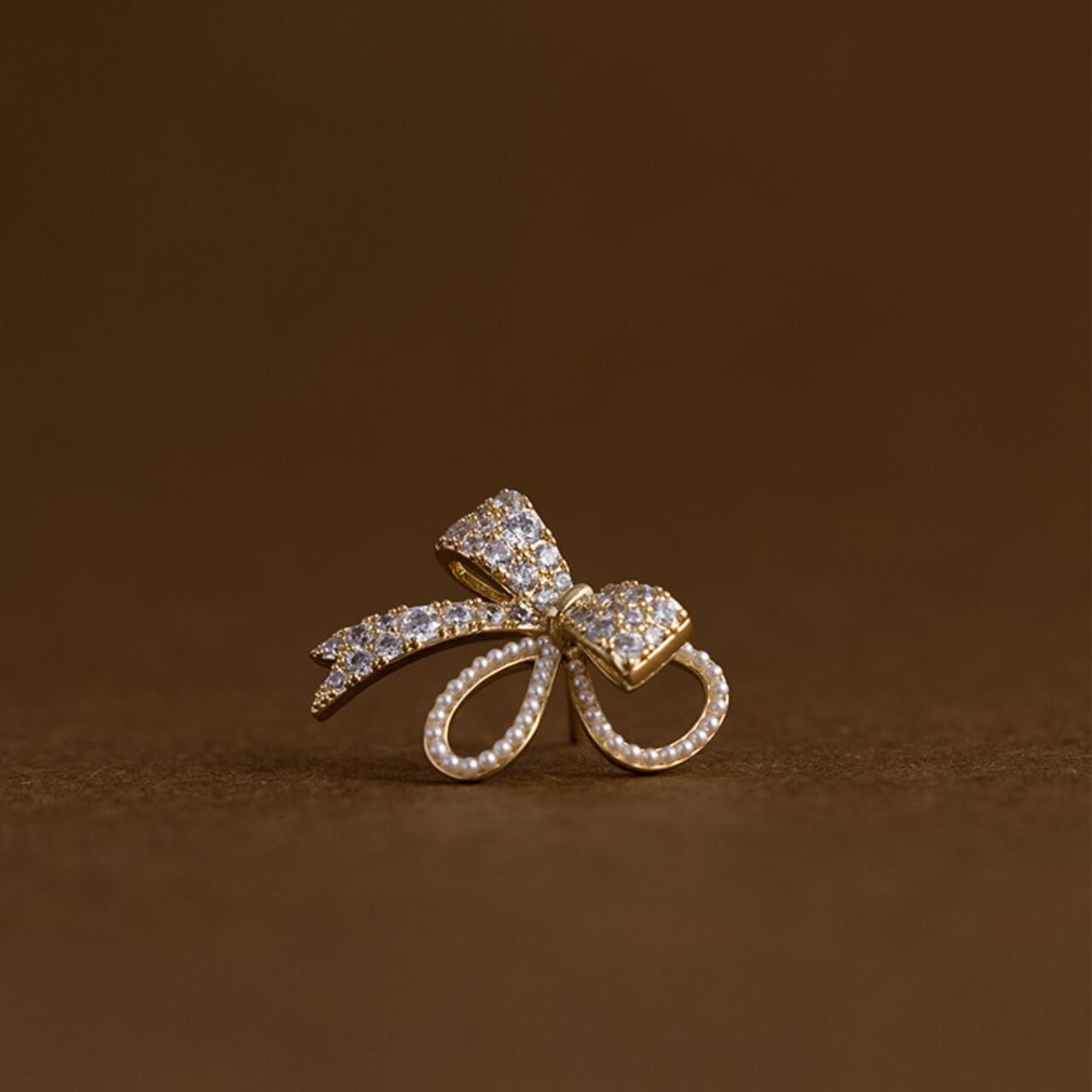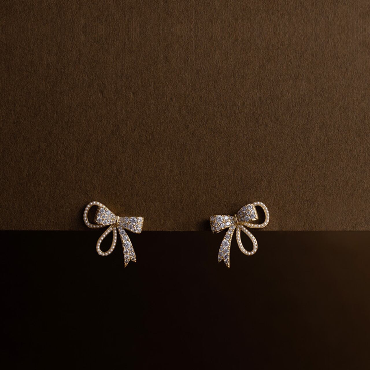 上品なリボンモチーフに輝くストーンがあしらわれたスタッドピアス。