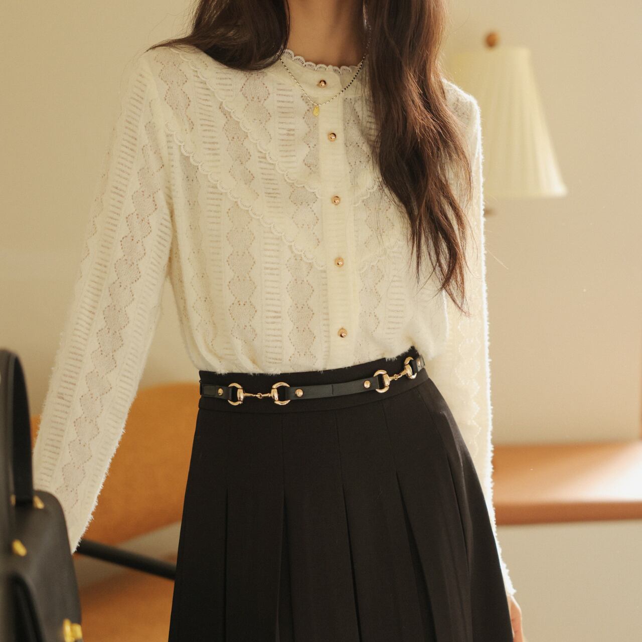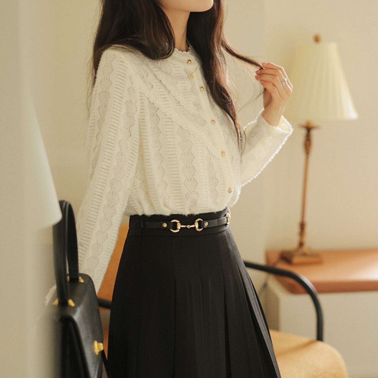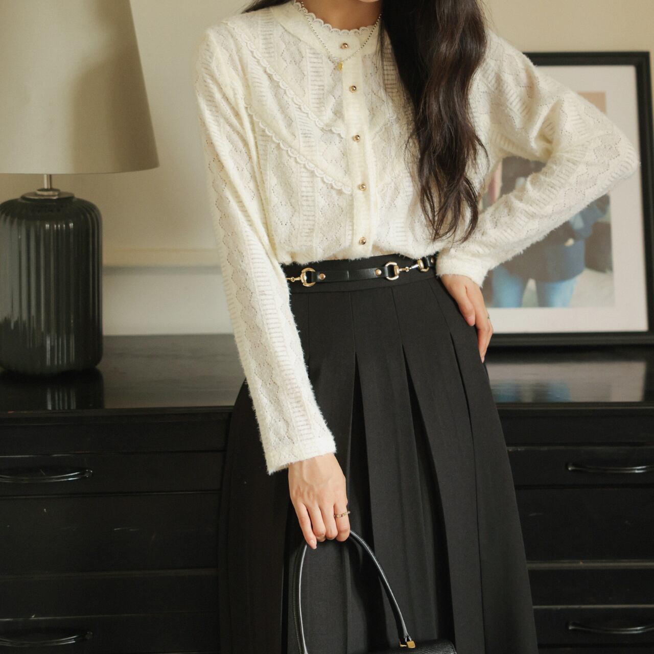 ケーブル編みのニットカーディガン。ボタン留めで着脱も簡単です。ラウンドネックのデザインが、上品で落ち着いた印象を与えます。普段使いはもちろん、ちょっとしたお出かけにもぴったり◎ 着回し力抜群で、様々なスタイルに合わせられます。