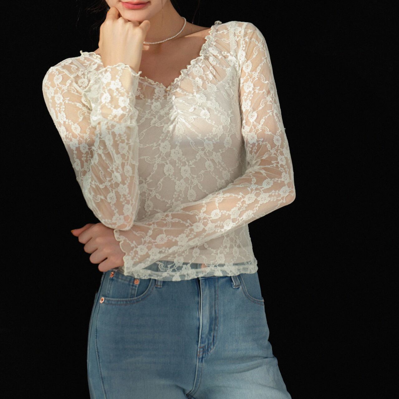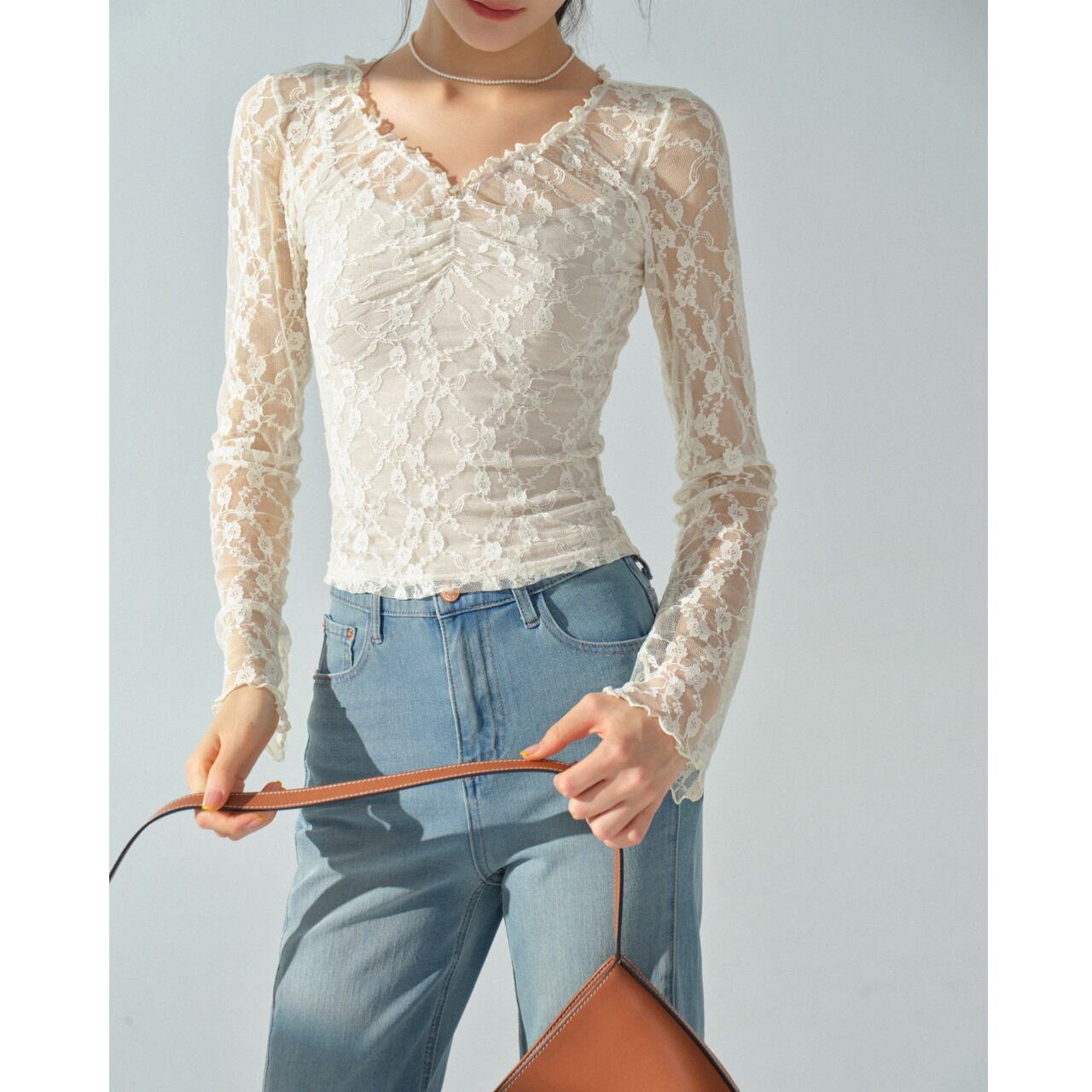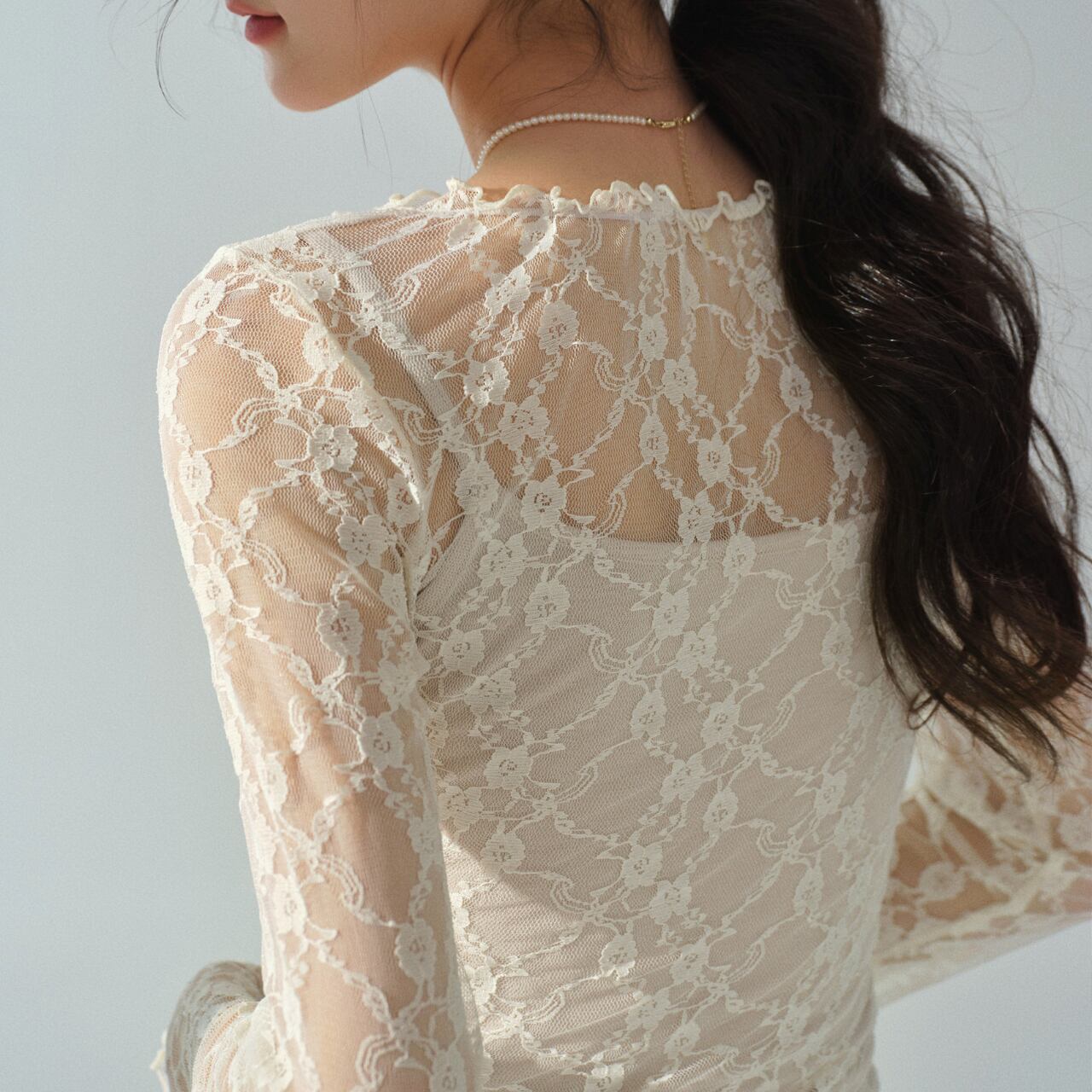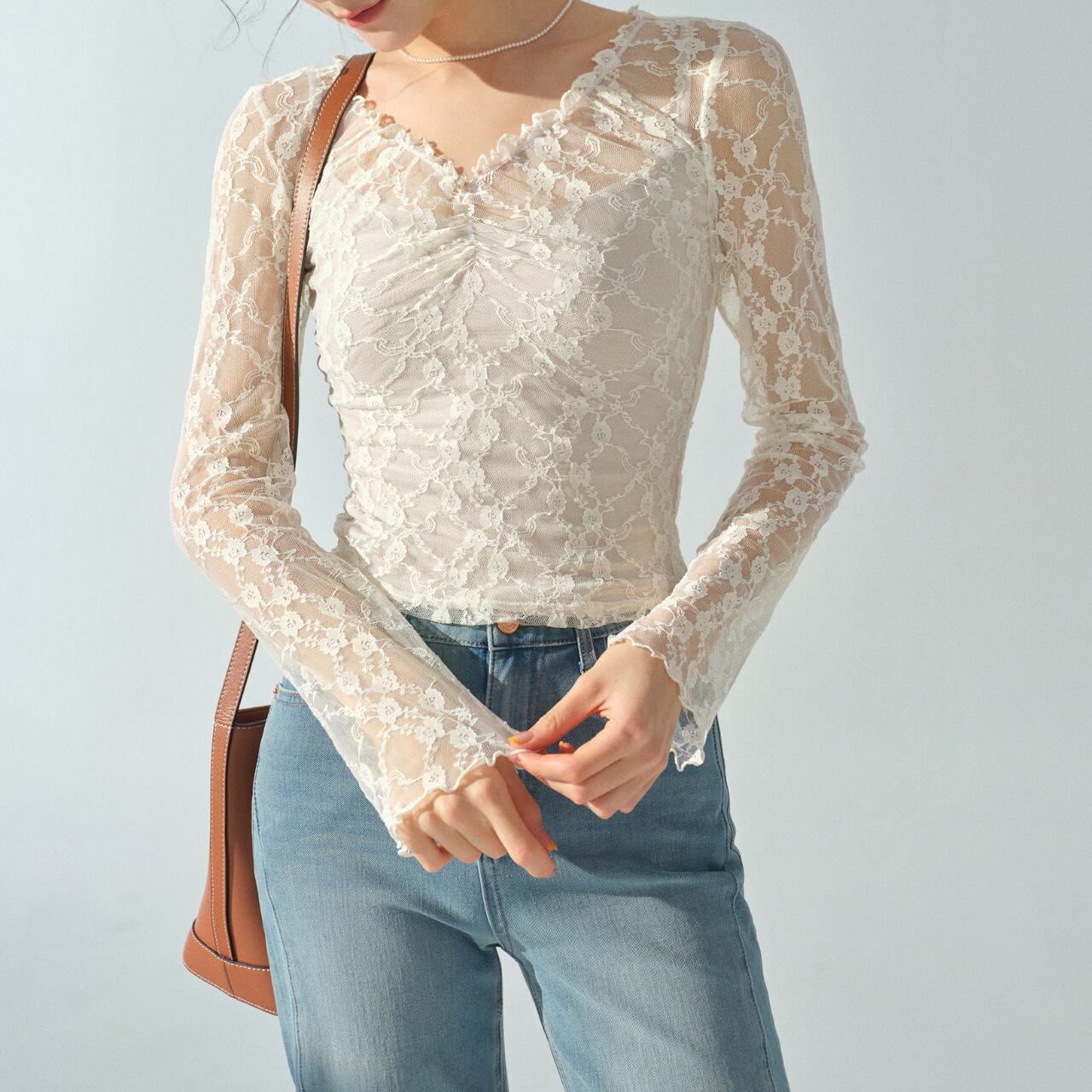 長袖レースカットソーは、大人の女性らしさを引き立てるアイテム。