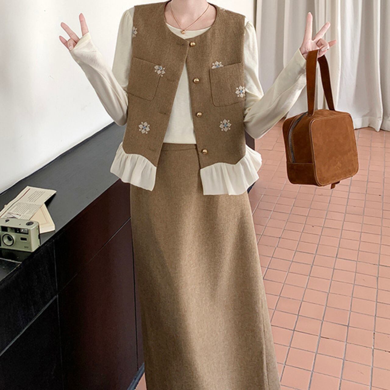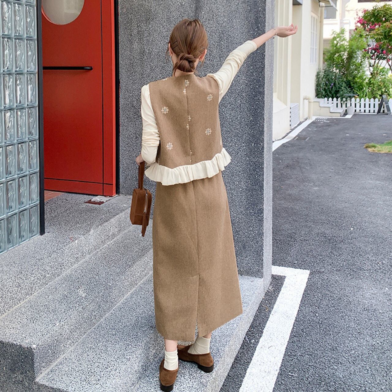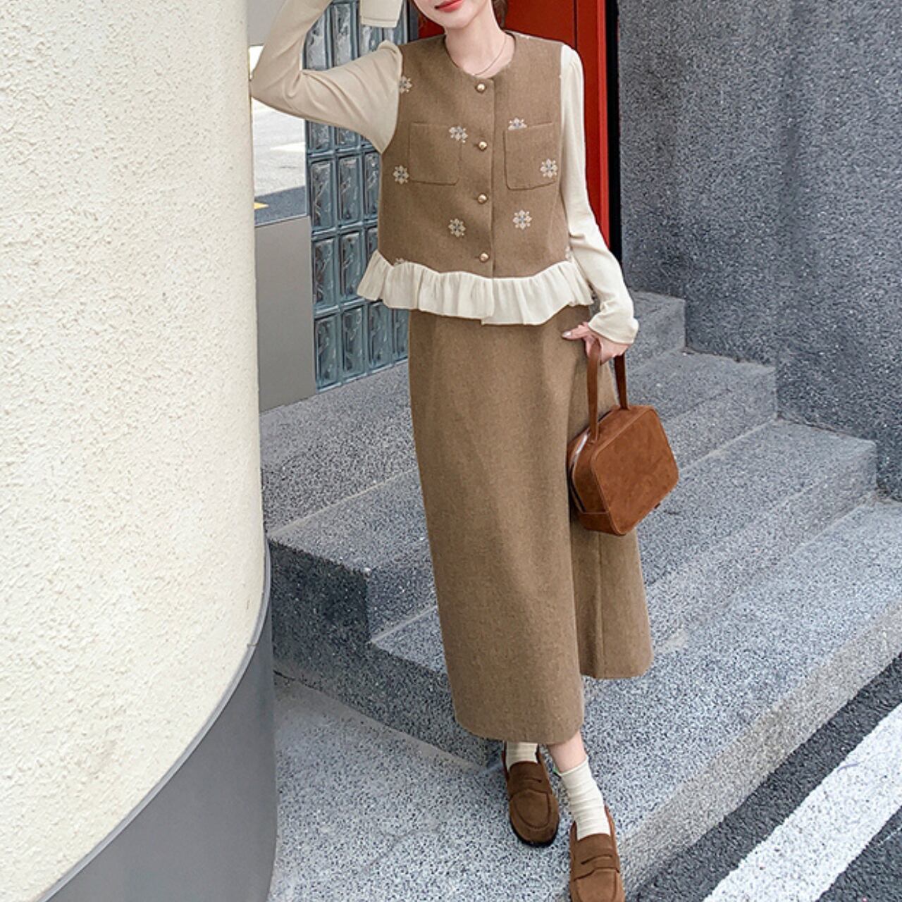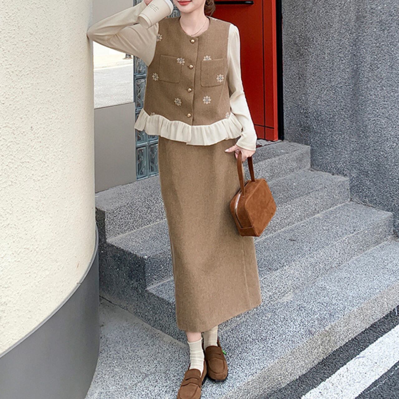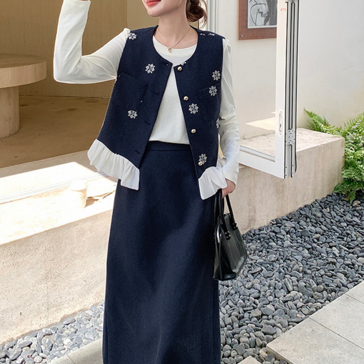 フリルがあしらわれたベストとミモレ丈スカートのセットアップ。 上品なラウンドネックと裾のフリルが、普段の装いにフェミニンな印象をプラスします。 ちょっとしたお出かけや、落ち着いた雰囲気の場所にもおすすめです。 ◼️サイズ 【s】 肩幅: 34cm 胸囲: 92cm 着丈: 49cm 【M】 肩幅: 35cm 胸囲: 96cm 着丈: 50cm 【l】 肩幅: 36cm 胸囲: 100cm 着丈: 51cm 【XL】 肩幅: 37cm 胸囲: 104cm 着丈: 52cm 【s】 肩幅: 32cm 胸囲: 84cm 着丈: 51cm 袖丈: 58cm 【M】 肩幅: 33cm 胸囲: 88cm 着丈: 52cm 袖丈: 59cm 【l】 肩幅: 34cm 胸囲: 92cm 着丈: 53cm 袖丈: 60cm 【XL】 肩幅: 35cm 胸囲: 96cm 着丈: 54cm 袖丈: 61cm ◼️カラー ベージュ ブラック 【お届けについて】 こちらの商品は海外店舗より直接発送となる為、ご入金から1〜3週間でお届けいたします。 ◼️注意事項 ・タイミングによっては 商品在庫切れにより注文キャンセルとさせていただく恐れもございますので、予めご了承くださいませ。 ・日本製とは検品基準が異なる為、縫製などが若干甘い場合があります。 ・海外倉庫にて保管をしております。在庫情報に時差が生じますため在庫切れや生産中止、生産に遅れがある場合は、受注後でもキャンセルさせていただく恐れがございます。 ・商品の色味は、お手持ちのスマートフォンの画面によって実物と若干異なる場合がございます。 ・発送時期によりデザイン仕様(細部、素材など)の変更がある場合がございます。 ・イメージ違いやサイズ交換等、お客さまご都合による交換、返品は対応出来かねます。 ———————————— 誠に恐れ入りますが、ご購入前に以下をご確認頂きご承諾の上お買い求めくださいませ。 →https://petitelune.official.ec/about ————————————