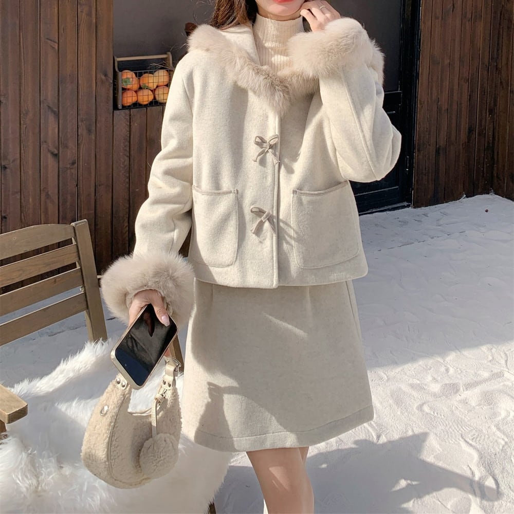 ボリューム感のあるエコファーを贅沢にあしらった、フードジャケットとミニスカートのセットアップです。