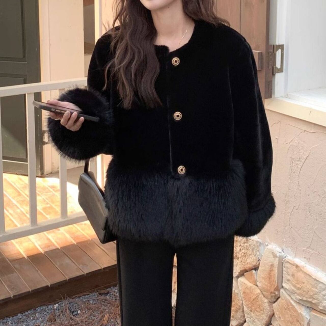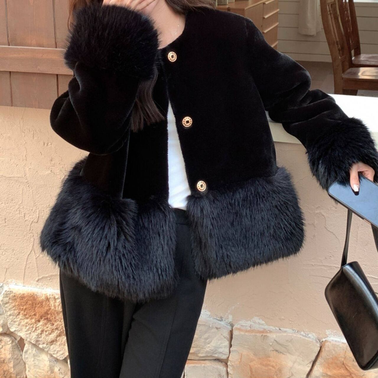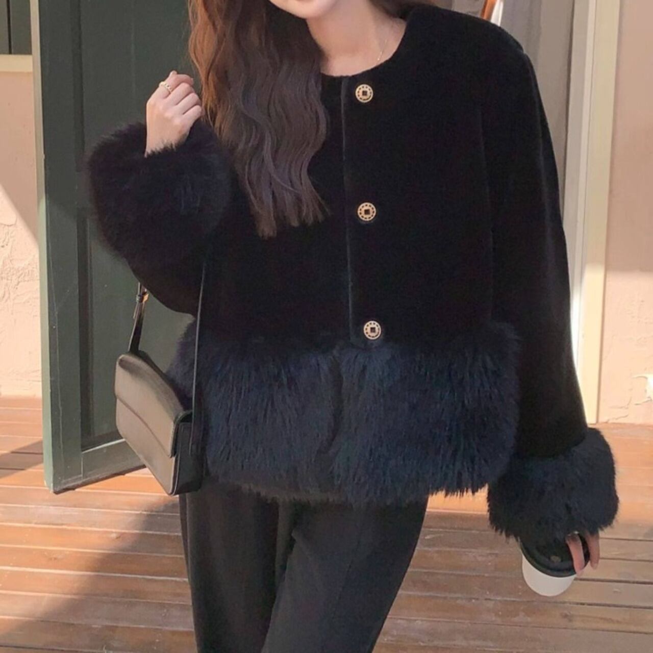 ボリューム感のある袖と裾のファーが、シンプルな装いに華やかさをプラスします。