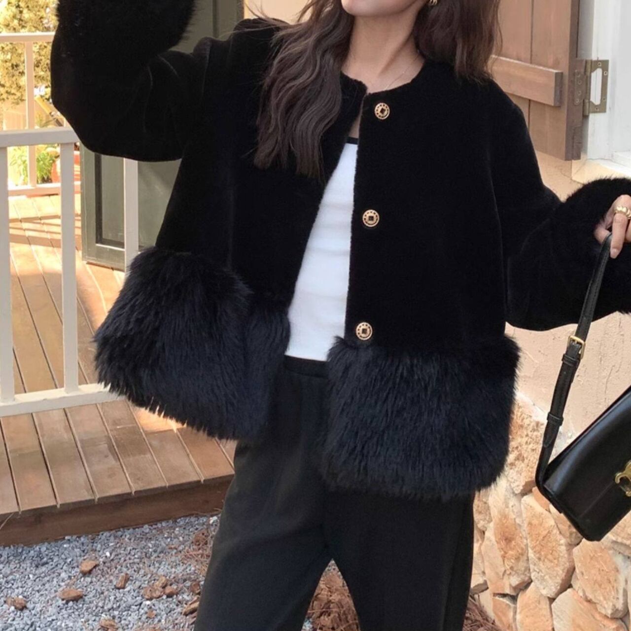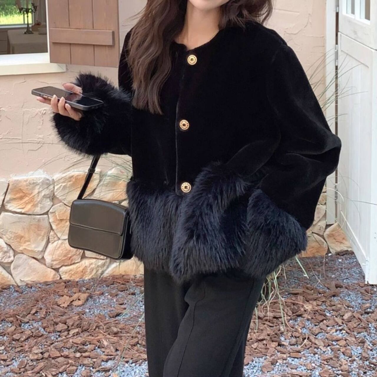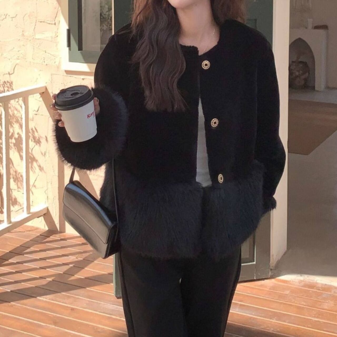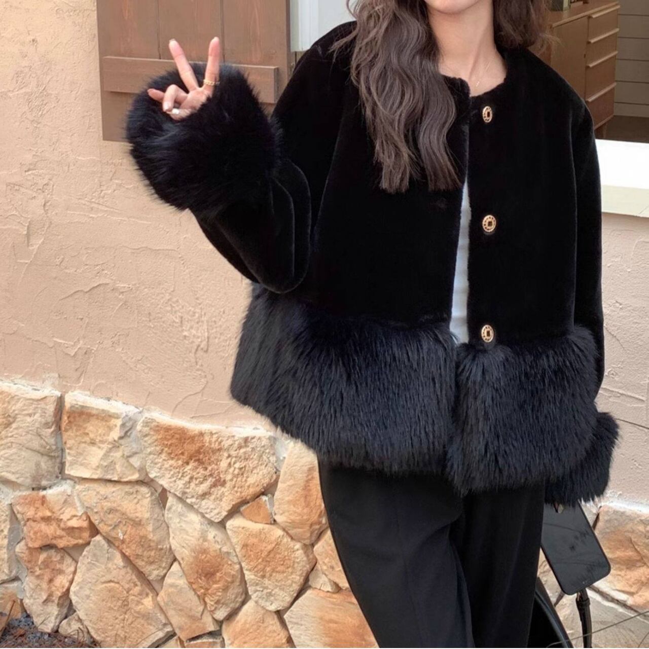ボリューム感のある袖と裾のファーが、シンプルな装いに華やかさをプラスします。