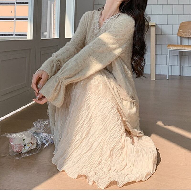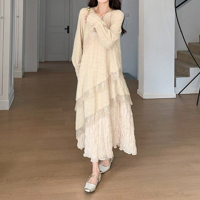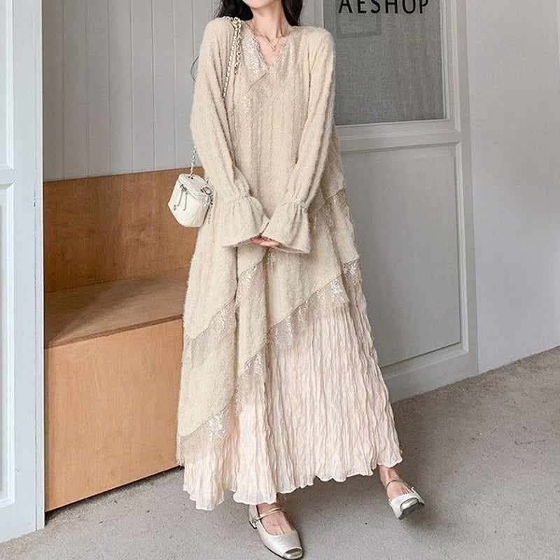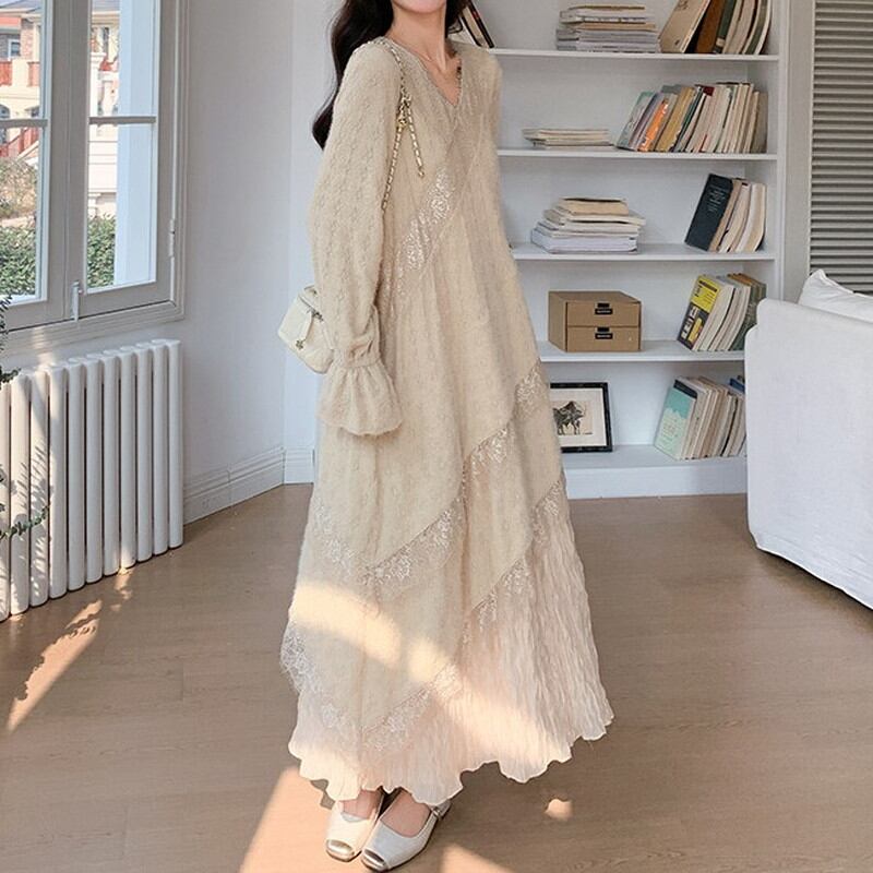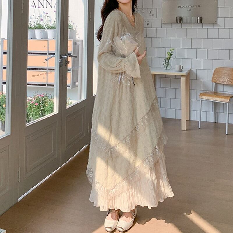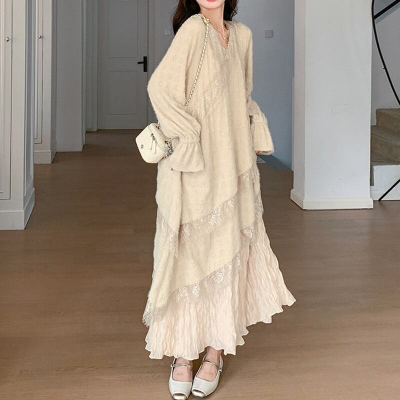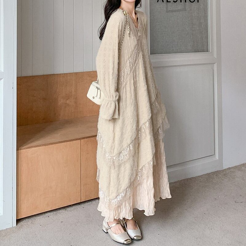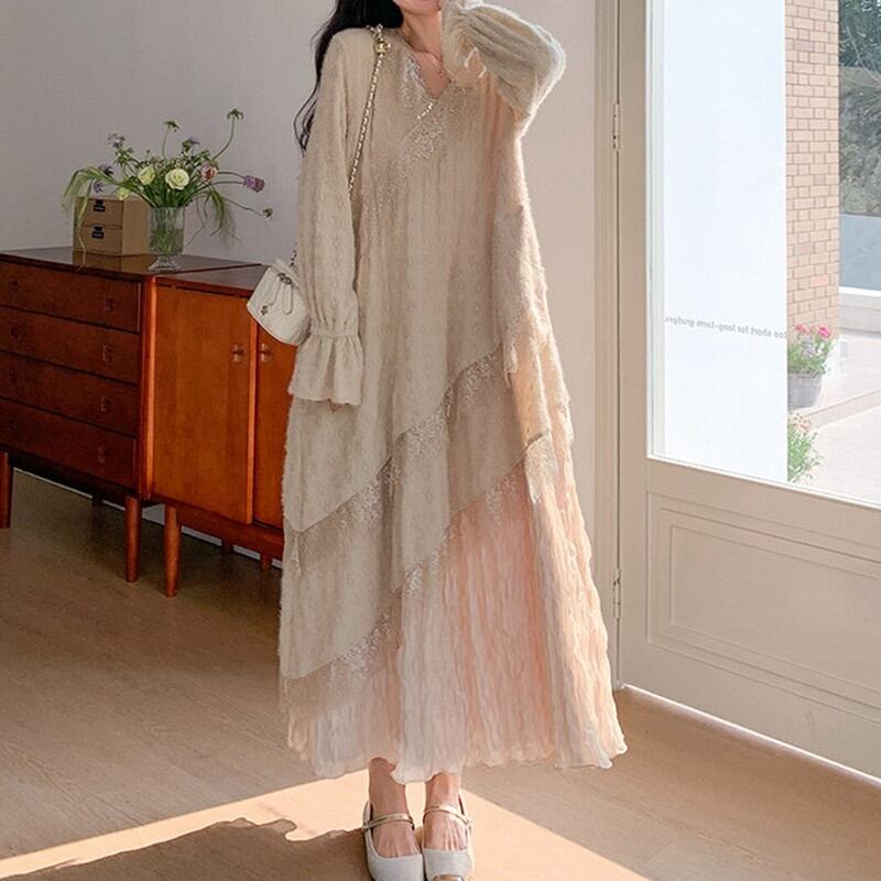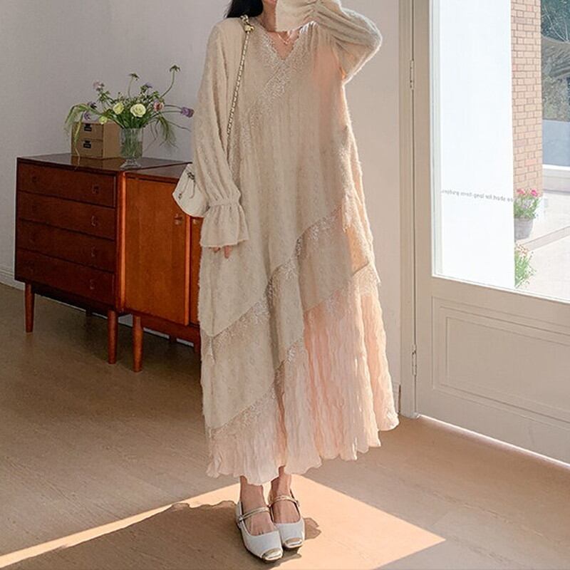 柔らかな質感の生地に繊細なレースを贅沢に切り替えた、ニュアンス感たっぷりのロングワンピースです。 顔周りをすっきりと見せるVネックラインと、袖口に向かって広がるフレアスリーブが優雅な印象を与えます。 アシンメトリーに配置されたレースのラインが、裾に向かって美しいドレープを描き出す華やかなデザイン。 歩くたびに軽やかに揺れるボリュームシルエットで、一枚で洗練されたレディな装いが完成する特別な一着です。 ◼️サイズ 【S】 肩幅:40cm 胸囲:96cm 着丈:126cm 袖丈:63cm 【M】 肩幅:41cm 胸囲:100cm 着丈:128cm 袖丈:64cm 【L】 肩幅:42cm 胸囲:104cm 着丈:130cm 袖丈:65cm 【XL】 肩幅:43cm 胸囲:108cm 着丈:132cm 袖丈:66cm ◼️カラー アイボリー ◼️素材 ポリエステル 【お届けについて】 こちらの商品は海外店舗より直接発送となる為、ご入金から1〜3週間でお届けいたします。 ◼️注意事項 ・タイミングによっては 商品在庫切れにより注文キャンセルとさせていただく恐れもございますので、予めご了承くださいませ。 ・日本製とは検品基準が異なる為、縫製などが若干甘い場合があります。 ・海外倉庫にて保管をしております。在庫情報に時差が生じますため在庫切れや生産中止、生産に遅れがある場合は、受注後でもキャンセルさせていただく恐れがございます。 ・商品の色味は、お手持ちのスマートフォンの画面によって実物と若干異なる場合がございます。 ・発送時期によりデザイン仕様(細部、素材など)の変更がある場合がございます。 ・イメージ違いやサイズ交換等、お客さまご都合による交換、返品は対応出来かねます。 ———————————— 誠に恐れ入りますが、ご購入前に以下をご確認頂きご承諾の上お買い求めくださいませ。 →https://petitelune.official.ec/about ————————————