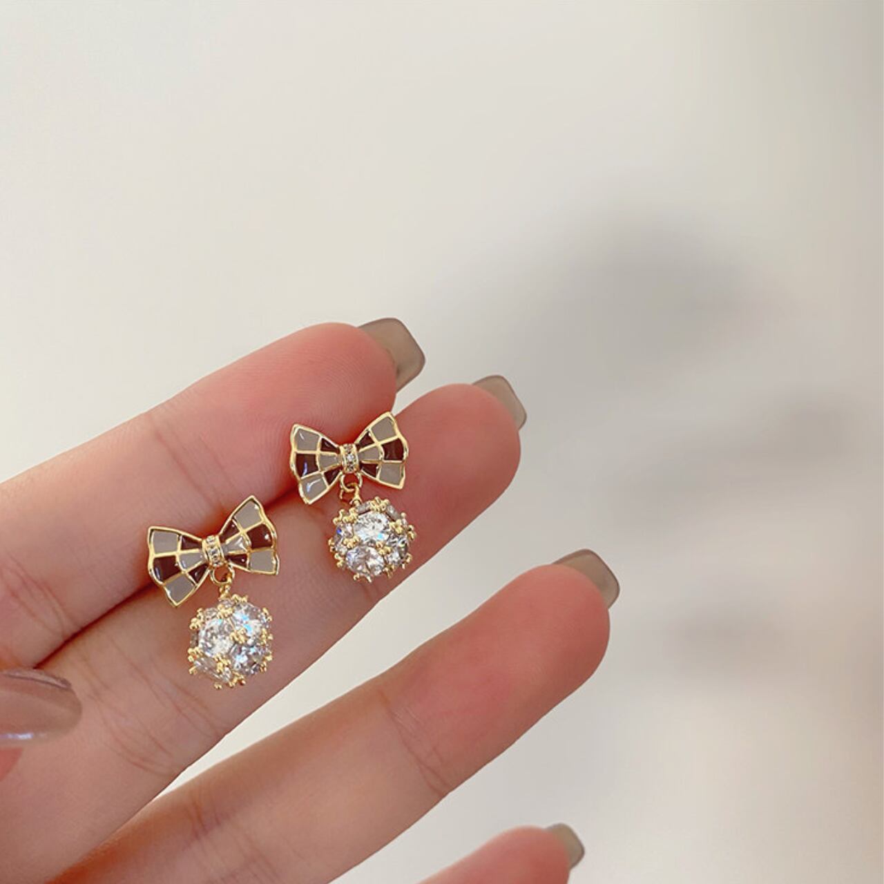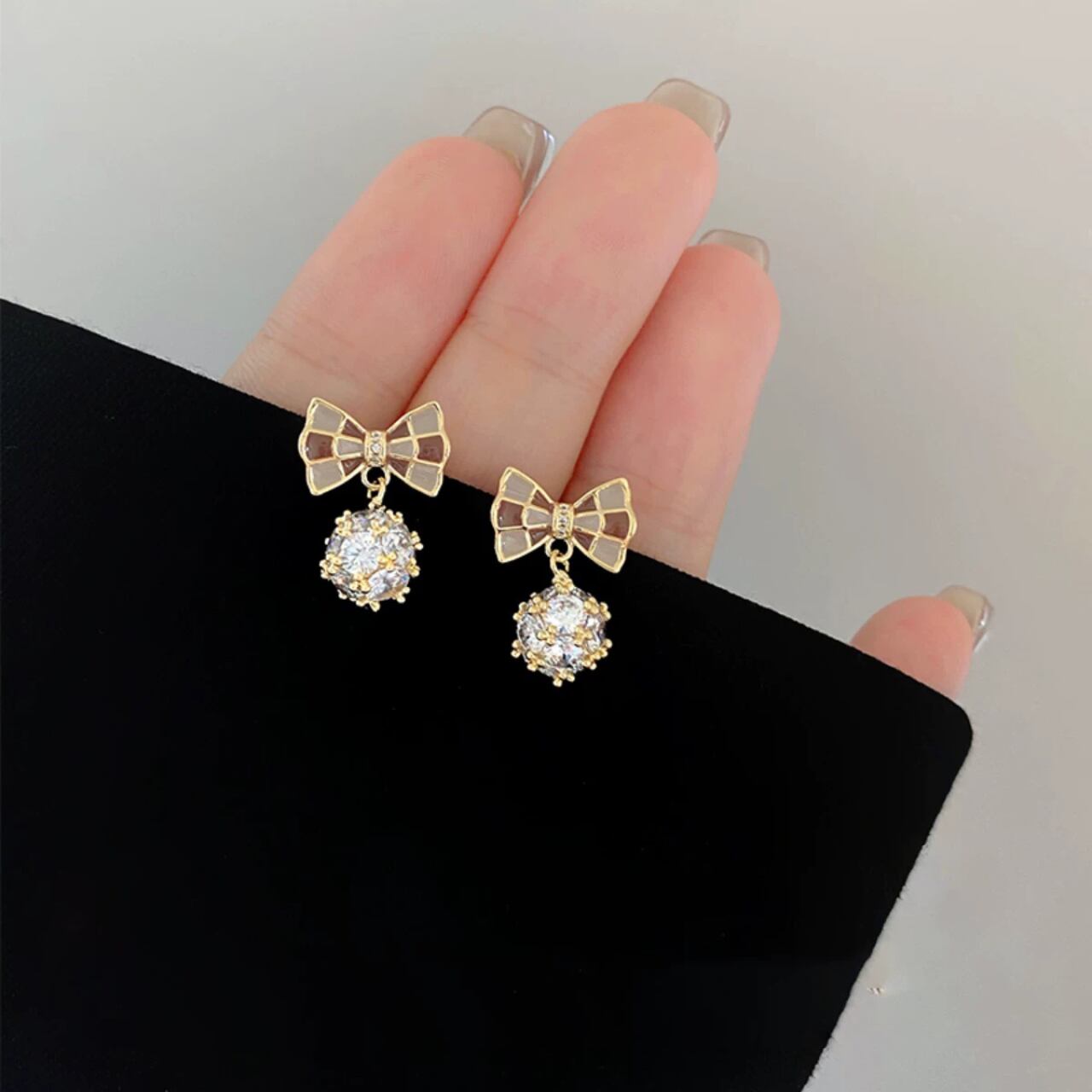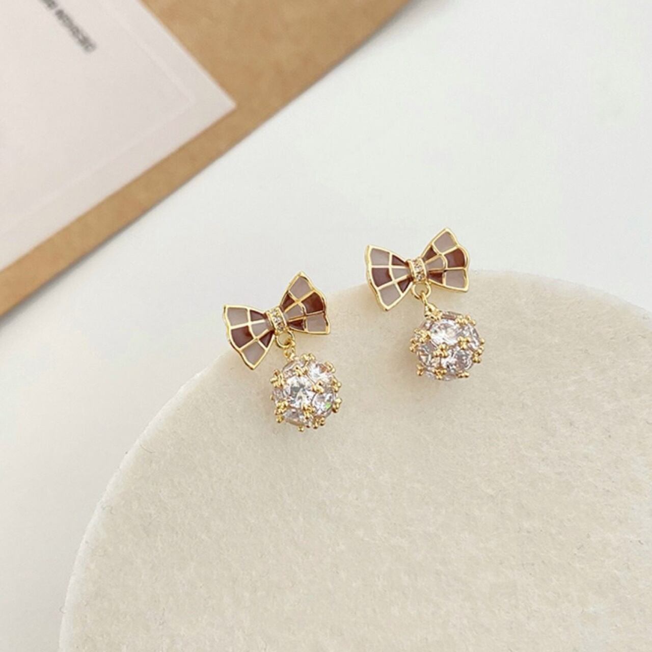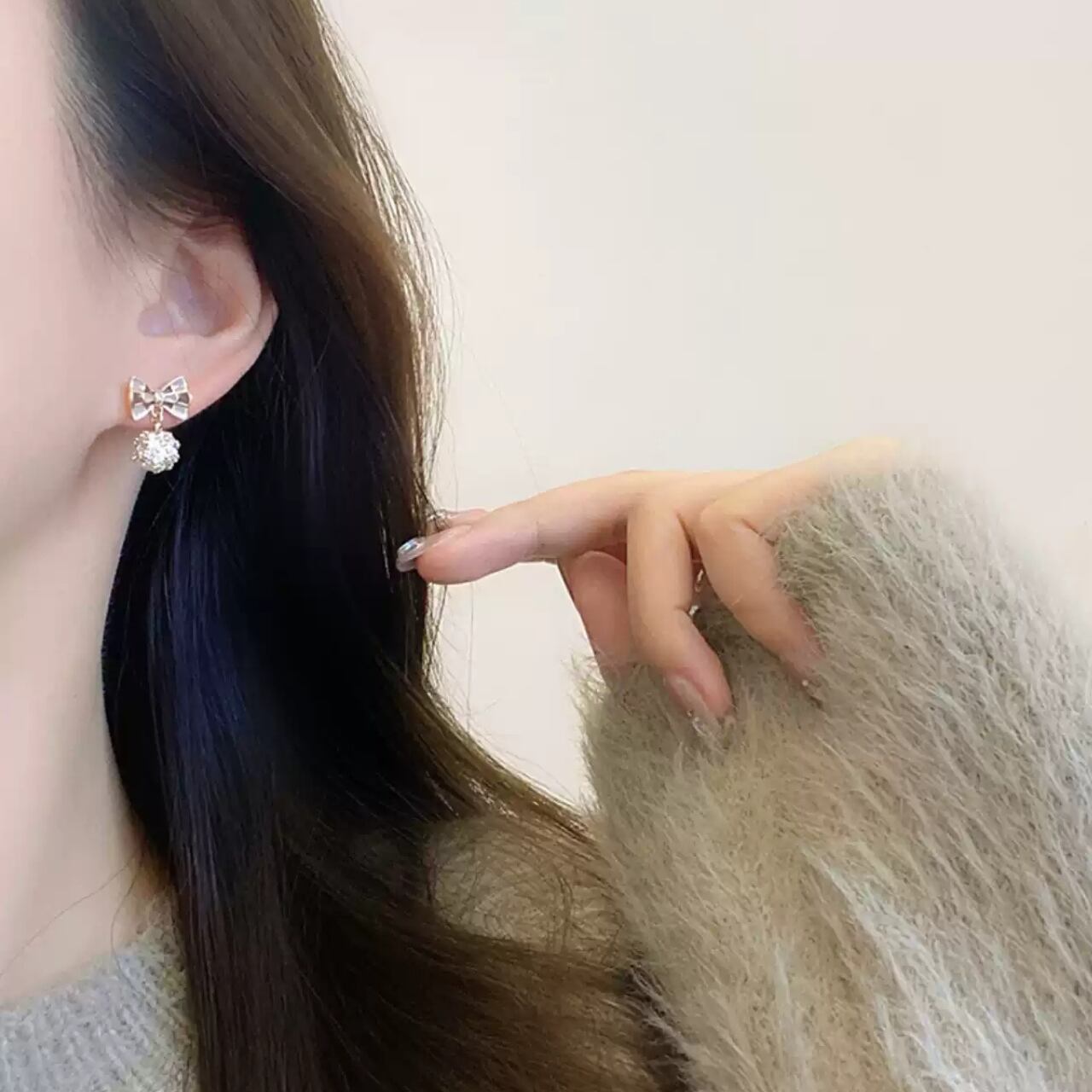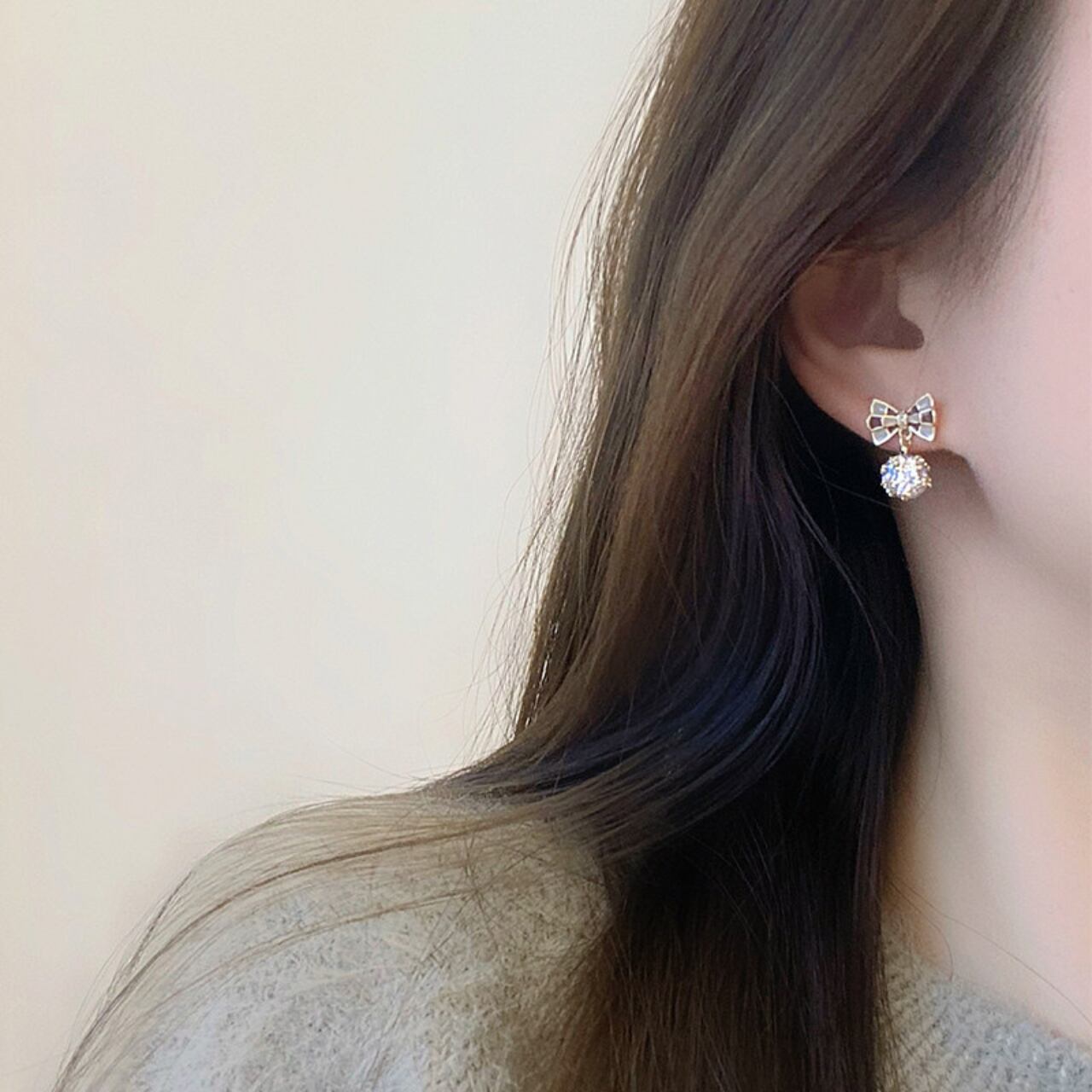 耳元で可愛らしく揺れる、リボンとボールモチーフのドロップピアス。