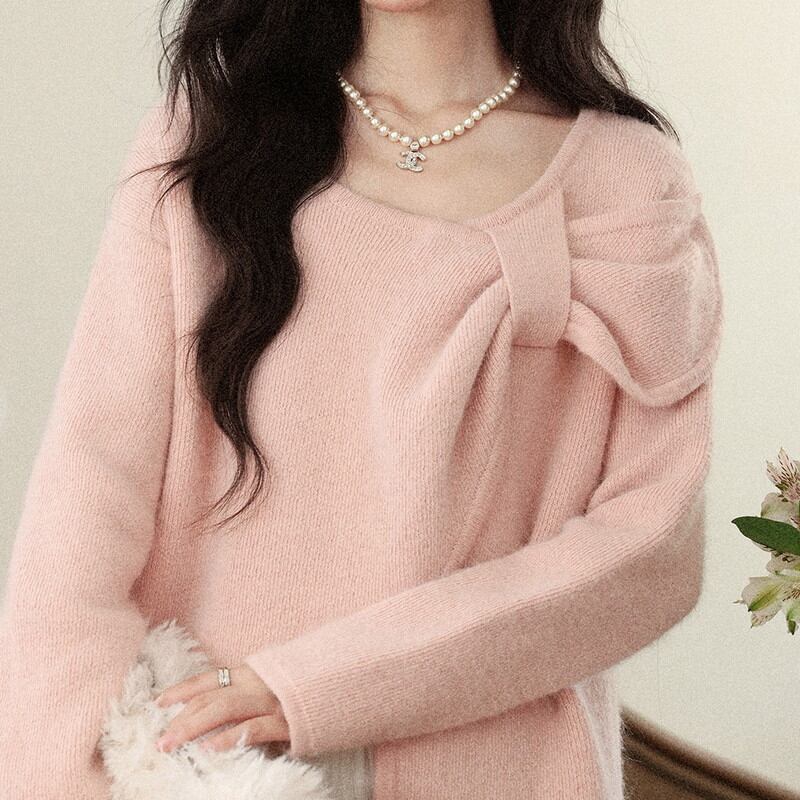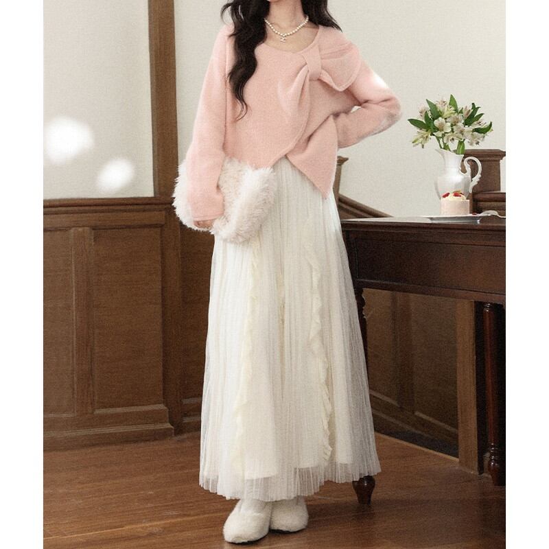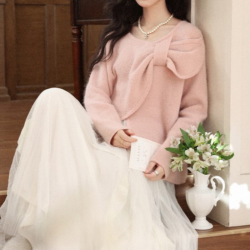フロントに施された大胆なビッグリボンが、圧倒的な存在感と愛らしさを放つ主役級のニットです。