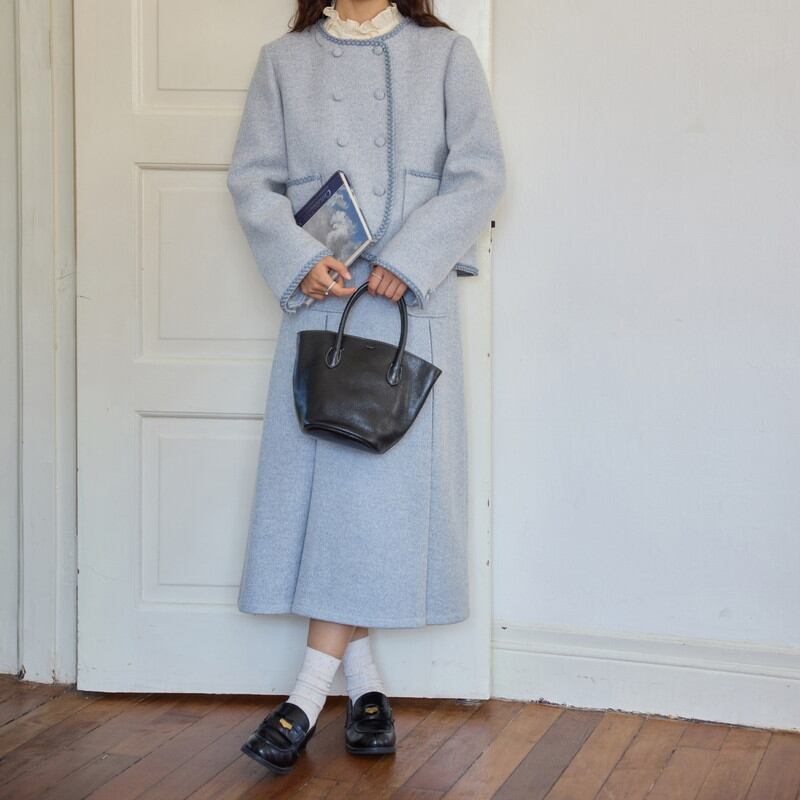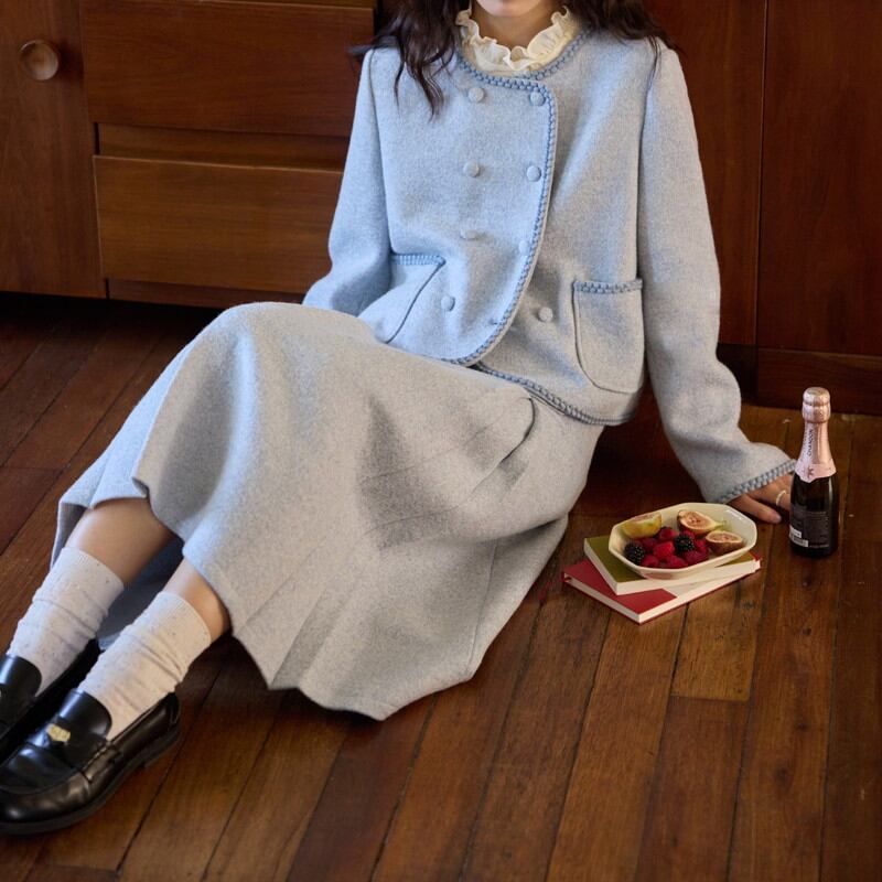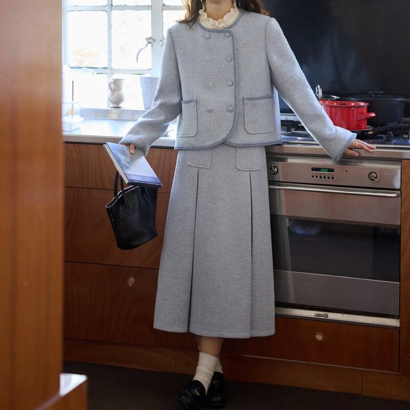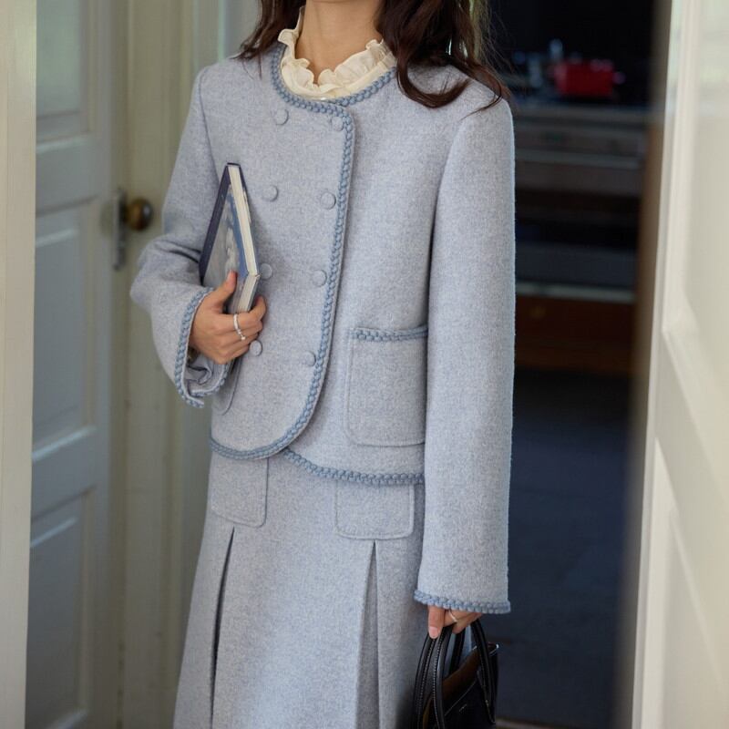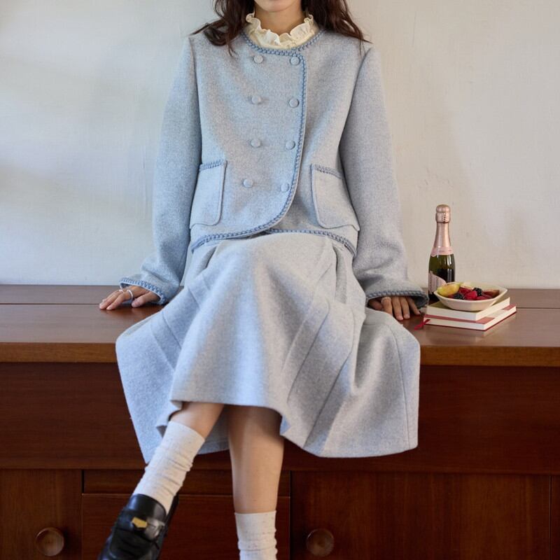 縁取りの装飾がクラシカルなアクセントを添える、ノーカラー風のラウンドネックジャケットとスカートのセットアップです。
