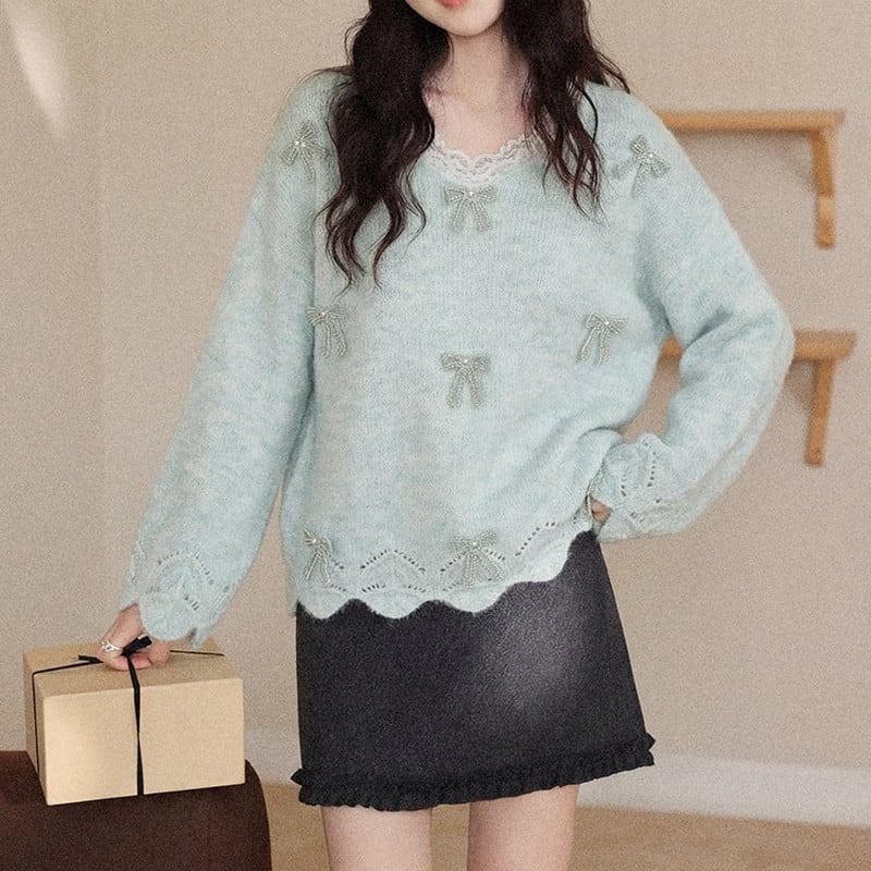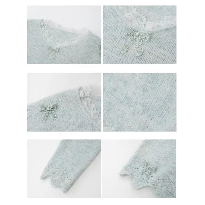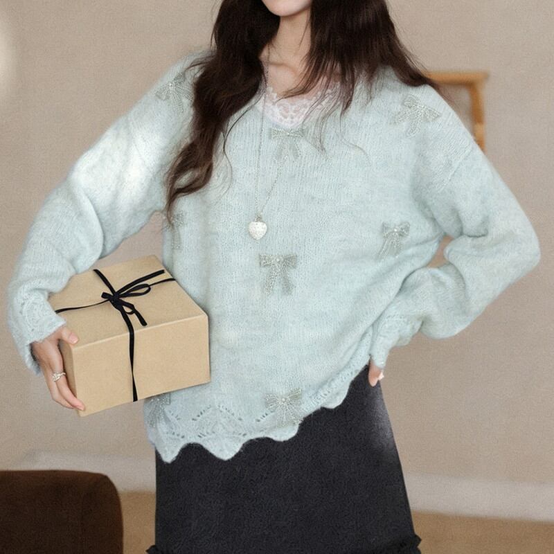 全体に散りばめられた小さなリボンモチーフが、可憐で遊び心のある表情を演出するシャギーニットです。