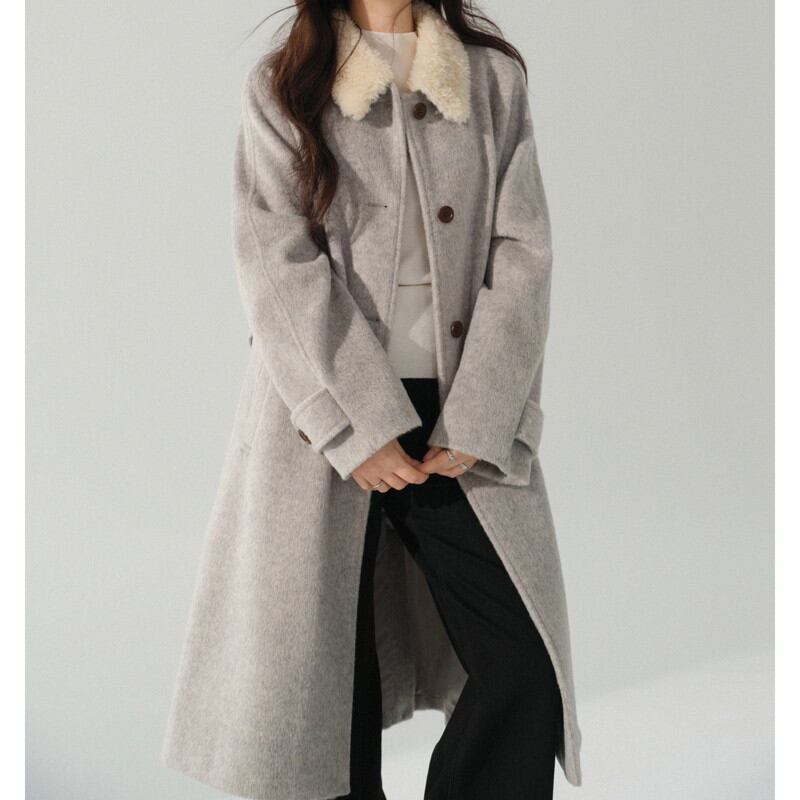 首元に柔らかなボア素材をあしらうことで、顔周りに温かみと愛らしいアクセントを添えたロングコートです。 ストンと落ちるストレートなラインが、ボリューム感のある生地ながらもスマートで洗練された印象を与えます。 フロントに配された丸いボタンが、シンプルでミニマルなデザインの中にクラシカルな表情をプラス。 柔らかな肌触りと軽やかな着心地を両立し、デイリーから特別な日のお出かけまで幅広く活躍してくれる一着です。 ◼️サイズ 【XS】 胸囲:111cm 着丈:99cm 袖丈:70.5cm 【S】 胸囲:115cm 着丈:102cm 袖丈:72.5cm 【M】 胸囲:119cm 着丈:103.5cm 袖丈:74cm 【L】 胸囲:123cm 着丈:105cm 袖丈:75.5cm ◼️カラー グレー ◼️素材 ポリエステル82% ウール9% ビスコース9% 【お届けについて】 こちらの商品は海外店舗より直接発送となる為、ご入金から1〜3週間でお届けいたします。 ◼️注意事項 ・タイミングによっては 商品在庫切れにより注文キャンセルとさせていただく恐れもございますので、予めご了承くださいませ。 ・日本製とは検品基準が異なる為、縫製などが若干甘い場合があります。 ・海外倉庫にて保管をしております。在庫情報に時差が生じますため在庫切れや生産中止、生産に遅れがある場合は、受注後でもキャンセルさせていただく恐れがございます。 ・商品の色味は、お手持ちのスマートフォンの画面によって実物と若干異なる場合がございます。 ・発送時期によりデザイン仕様(細部、素材など)の変更がある場合がございます。 ・イメージ違いやサイズ交換等、お客さまご都合による交換、返品は対応出来かねます。 ———————————— 誠に恐れ入りますが、ご購入前に以下をご確認頂きご承諾の上お買い求めくださいませ。 →https://petitelune.official.ec/about ————————————