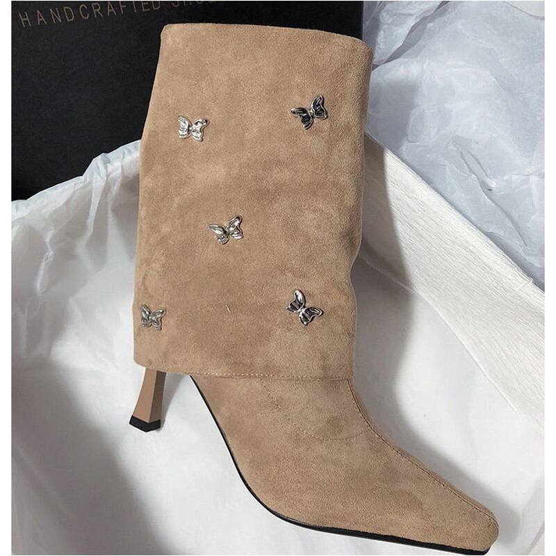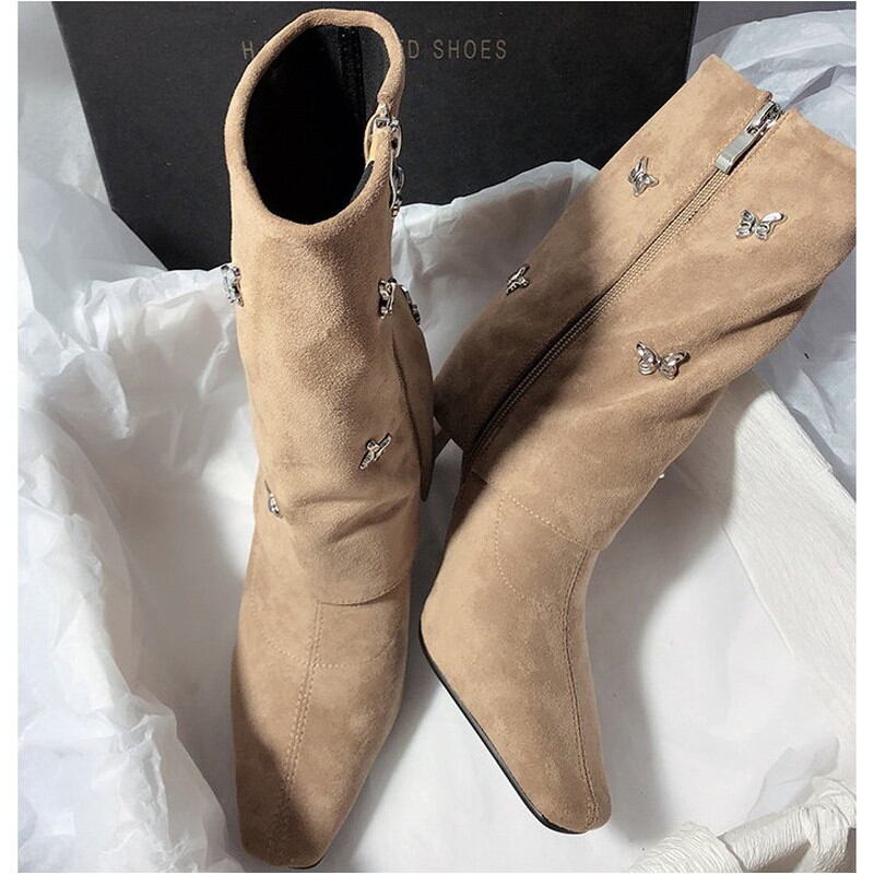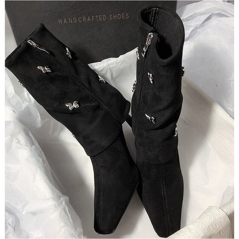 滑らかなスエード調の生地に、立体的なバタフライモチーフを贅沢に散りばめた、遊び心あふれるショートブーツです。 シャープなポインテッドトゥのシルエットが、足元をすっきりと洗練された大人の表情に引き締めてくれます。 程よく高さのあるヒールがスタイルアップを叶えつつ、柔らかな素材感が足に優しくフィットし快適な履き心地をサポート。 歩くたびにモチーフが繊細な輝きを放ち、冬のシンプルなコーディネートを華やかで個性豊かに彩ってくれる一着です。 ◼️サイズ 34((21.5~22.0cm) 35(22.0~22.5cm) 36(23.0~23.5cm) 37(23.5~24.0cm) 38(24.0~24.5cm) 39(24.5~25.0cm) ヒール高さ7.5cm 筒丈17cm ※足の形にもよりますが、甲の幅の広い方は通常よりもワンサイズ上げてご購入頂くことをお勧めします。 ※採寸方法により若干の誤差がある場合がございます ◼️カラー ブラック ベージュ 【お届けについて】 こちらの商品は海外店舗より直接発送となる為、ご入金から1〜3週間でお届けいたします。 ◼️注意事項 ・タイミングによっては 商品在庫切れにより注文キャンセルとさせていただく恐れもございますので、予めご了承くださいませ。 ・日本製とは検品基準が異なる為、縫製などが若干甘い場合があります。 ・海外倉庫にて保管をしております。在庫情報に時差が生じますため在庫切れや生産中止、生産に遅れがある場合は、受注後でもキャンセルさせていただく恐れがございます。 ・商品の色味は、お手持ちのスマートフォンの画面によって実物と若干異なる場合がございます。 ・発送時期によりデザイン仕様(細部、素材など)の変更がある場合がございます。 ・イメージ違いやサイズ交換等、お客さまご都合による交換、返品は対応出来かねます。 ———————————— 誠に恐れ入りますが、ご購入前に以下をご確認頂きご承諾の上お買い求めくださいませ。 →https://petitelune.official.ec/about ————————————