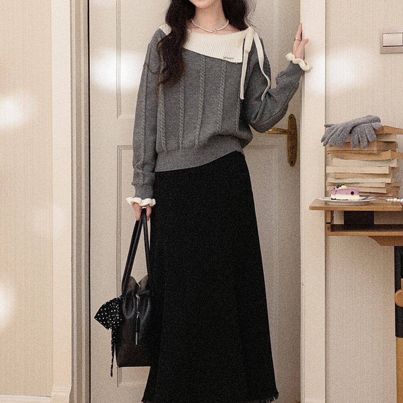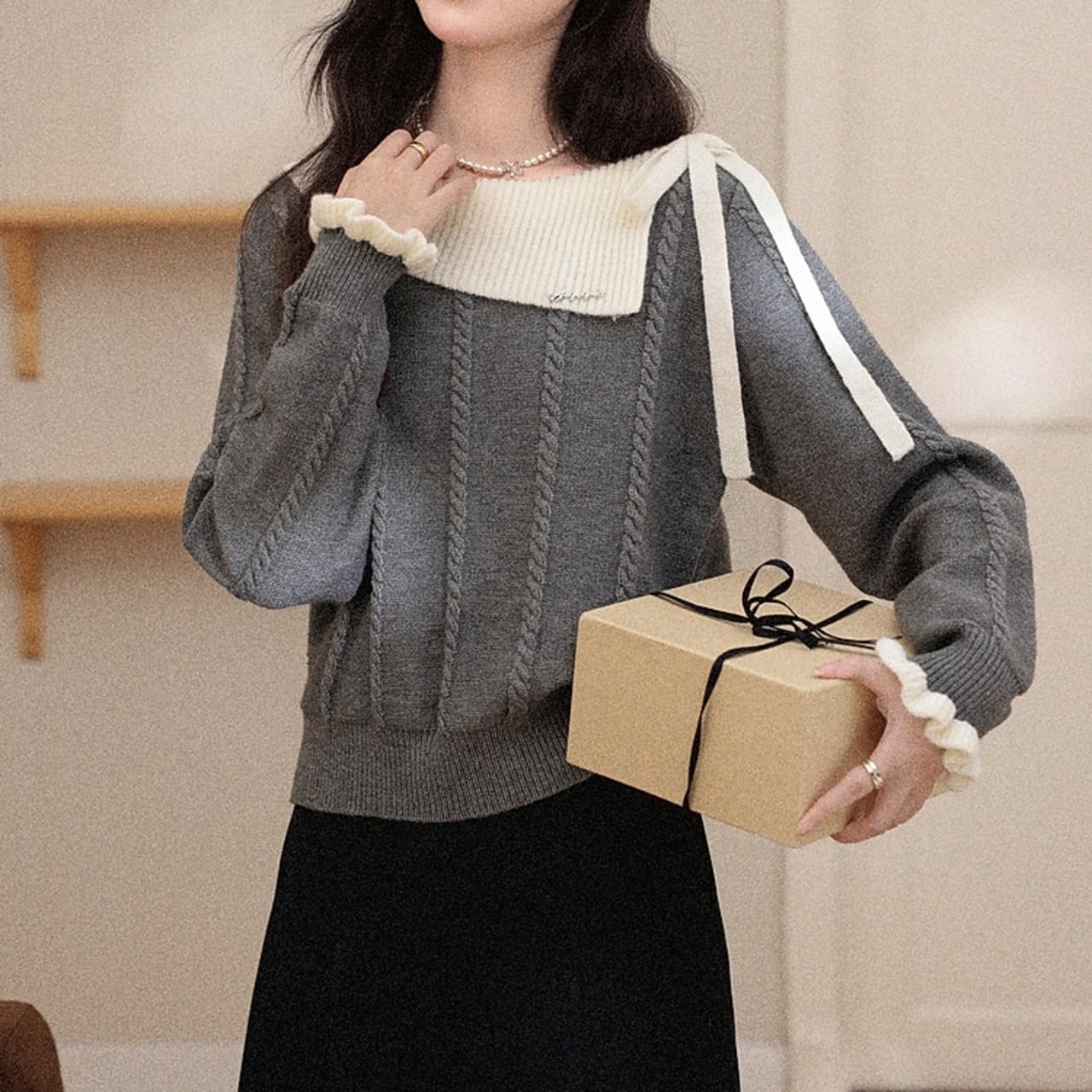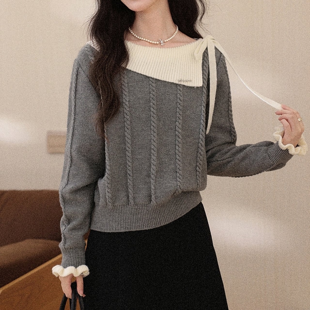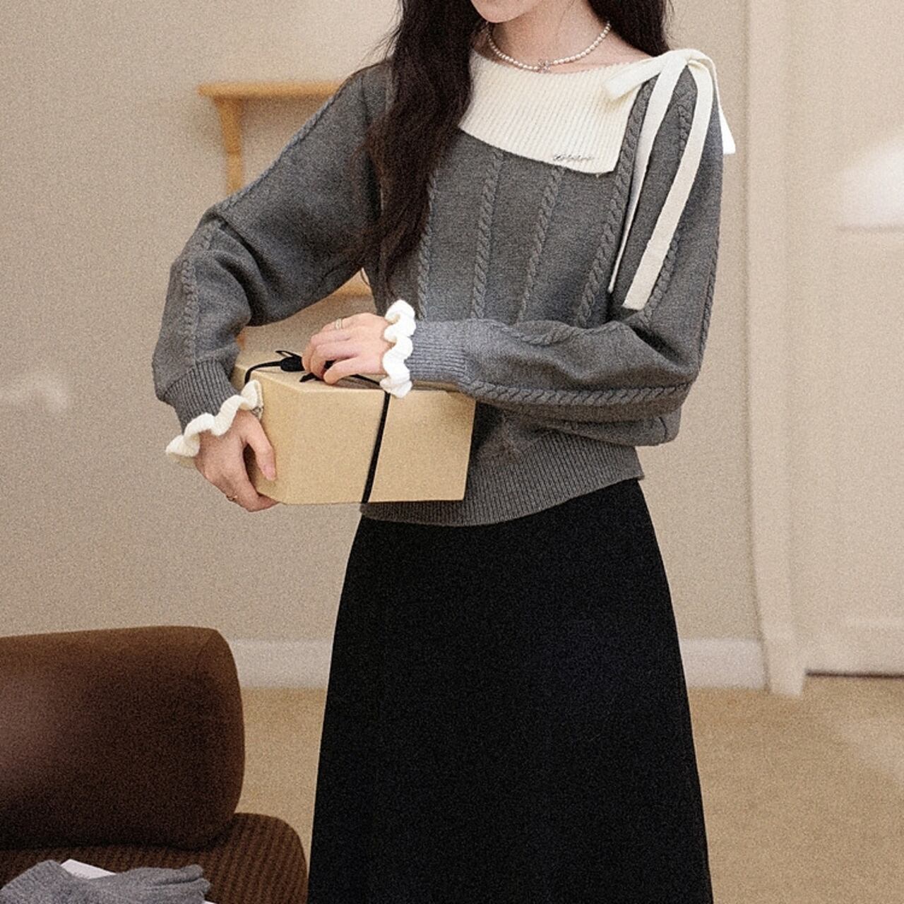 リボン付き アシンメトリーネック バイカラーニット 00416