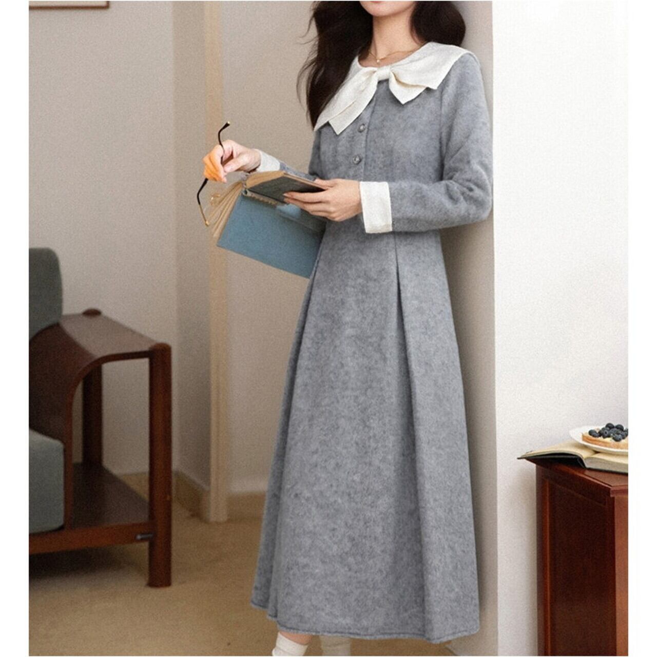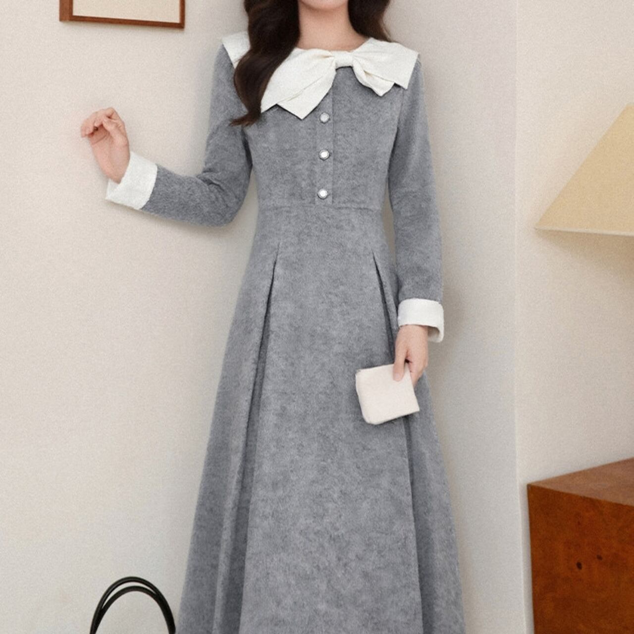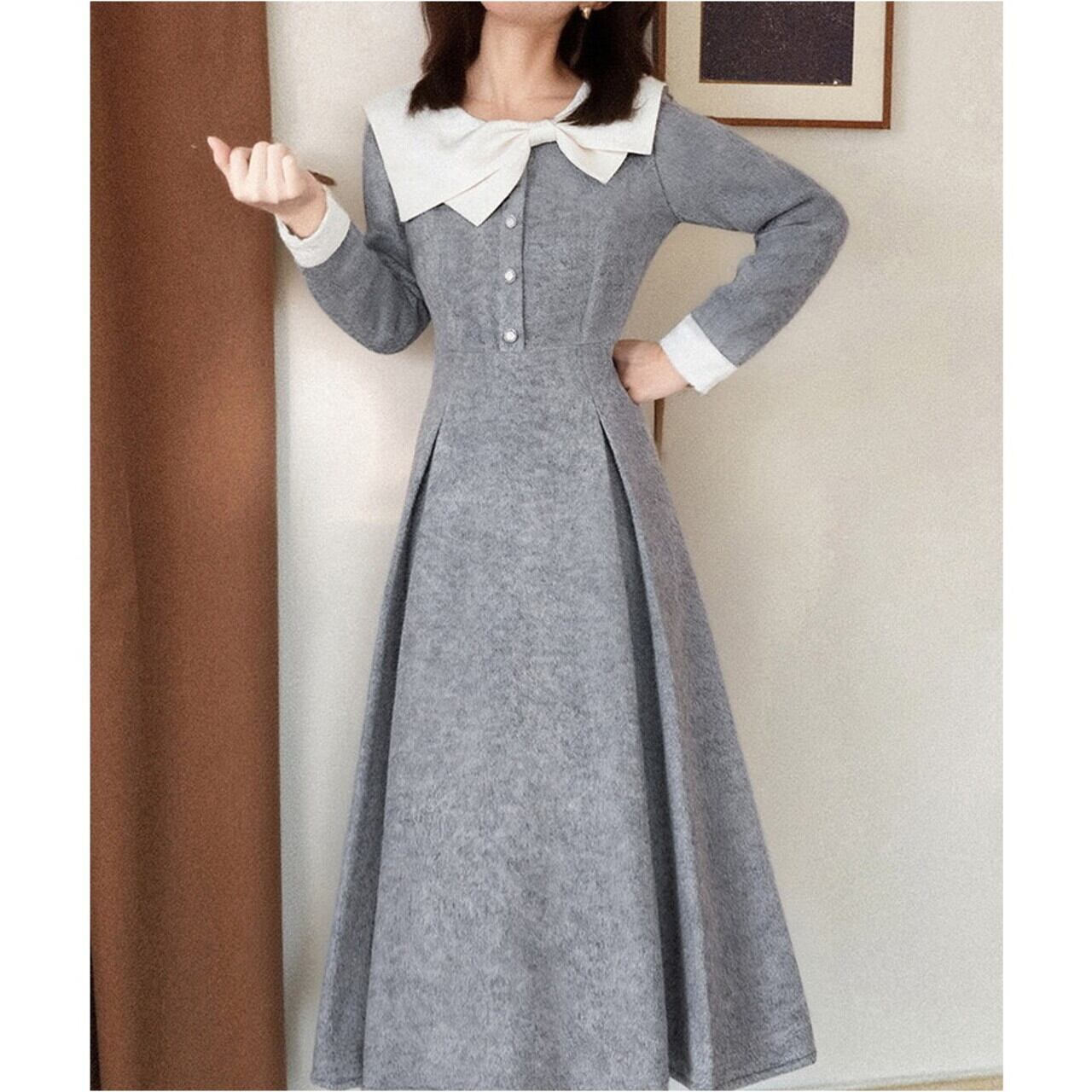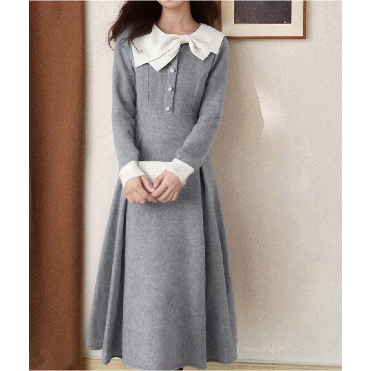 リボンデザインの大きめ襟が華やかな印象を与えるミモレ丈ワンピース。