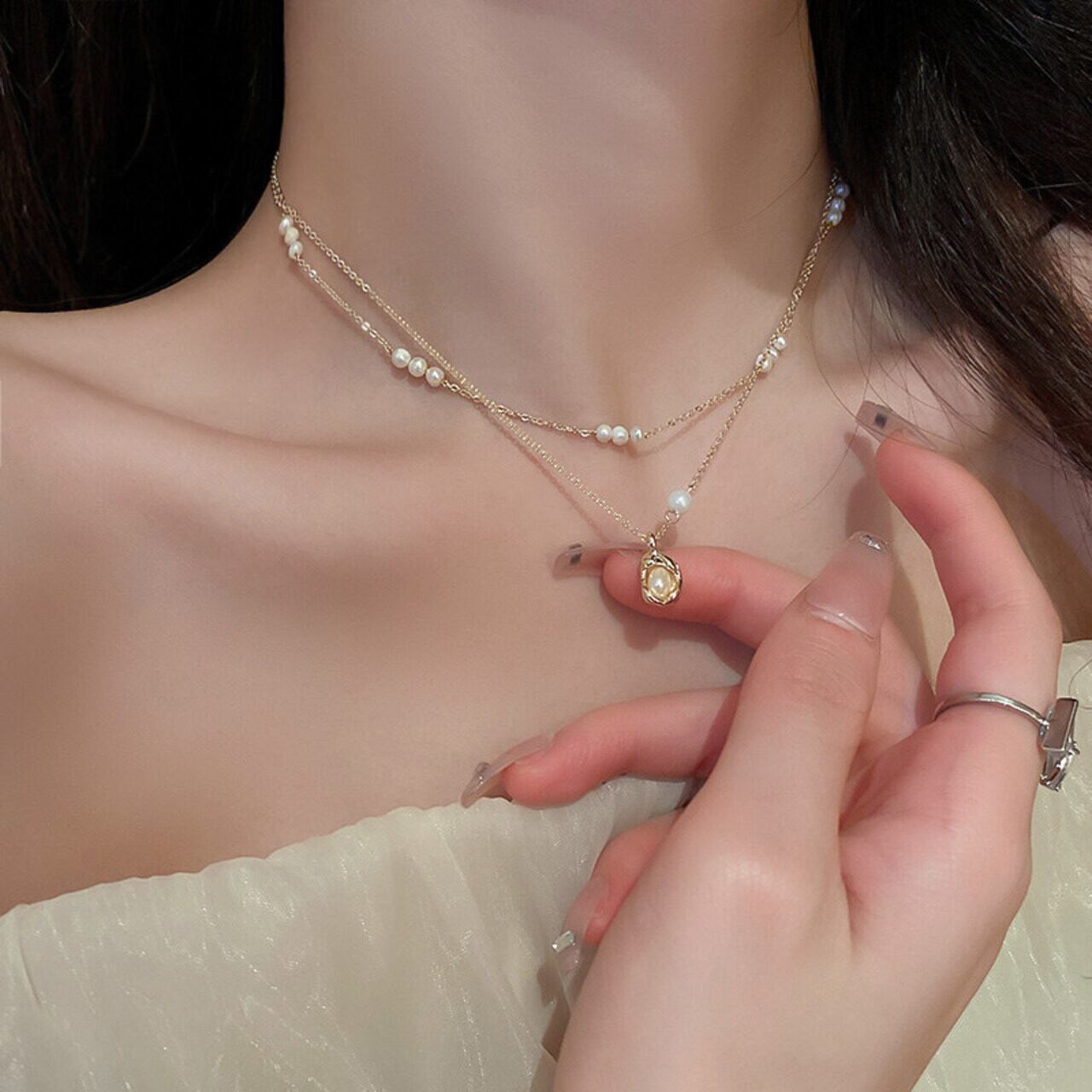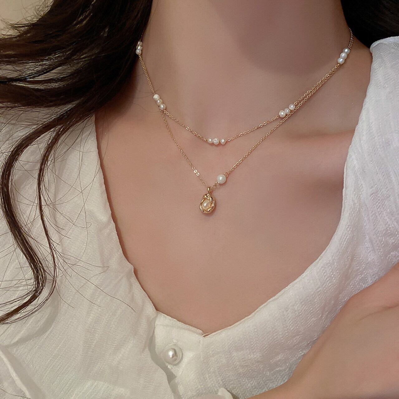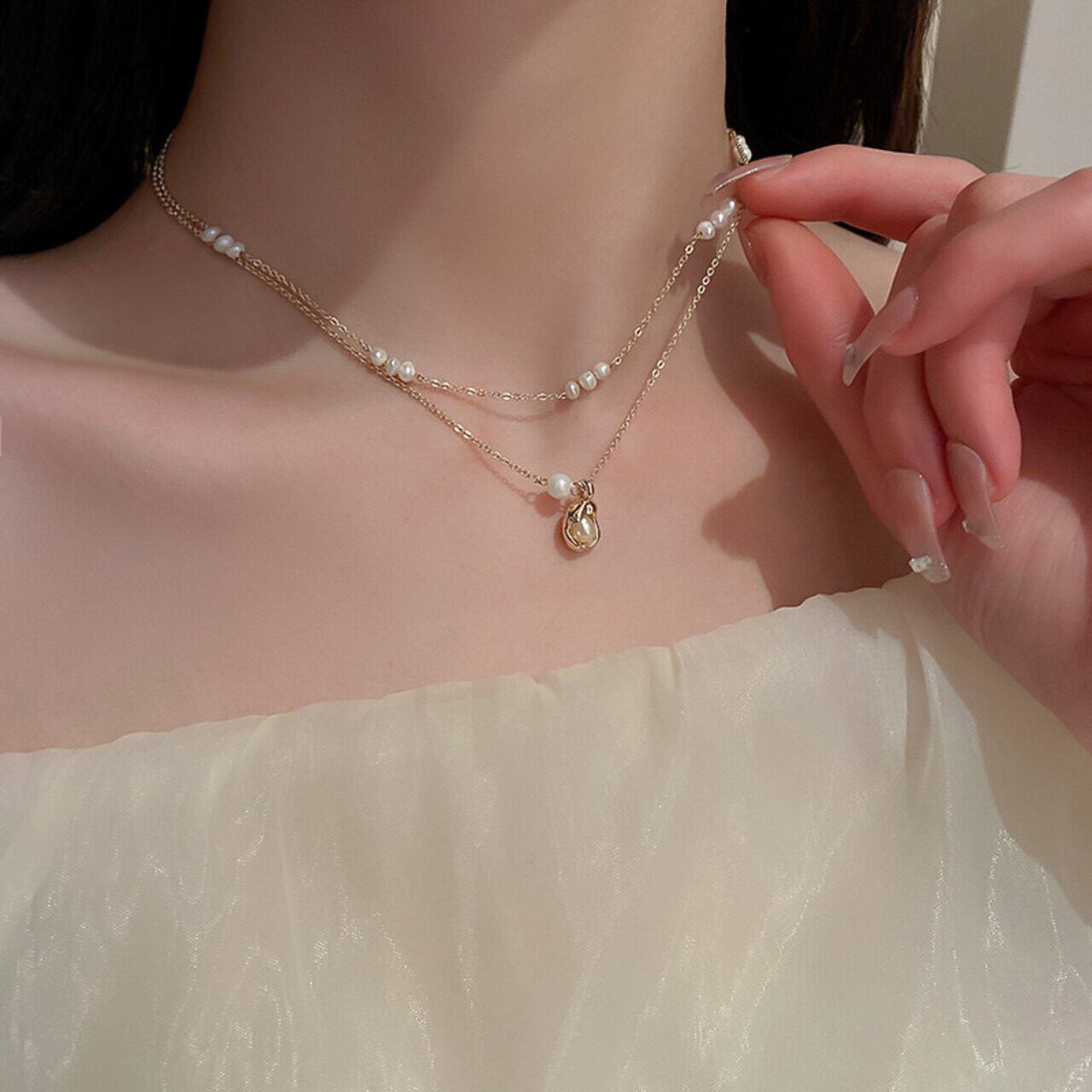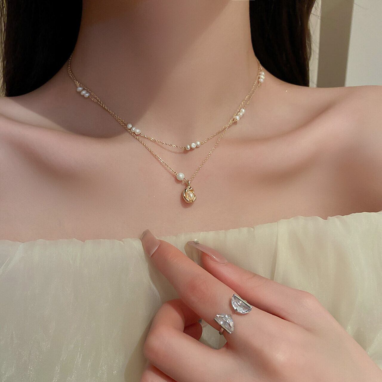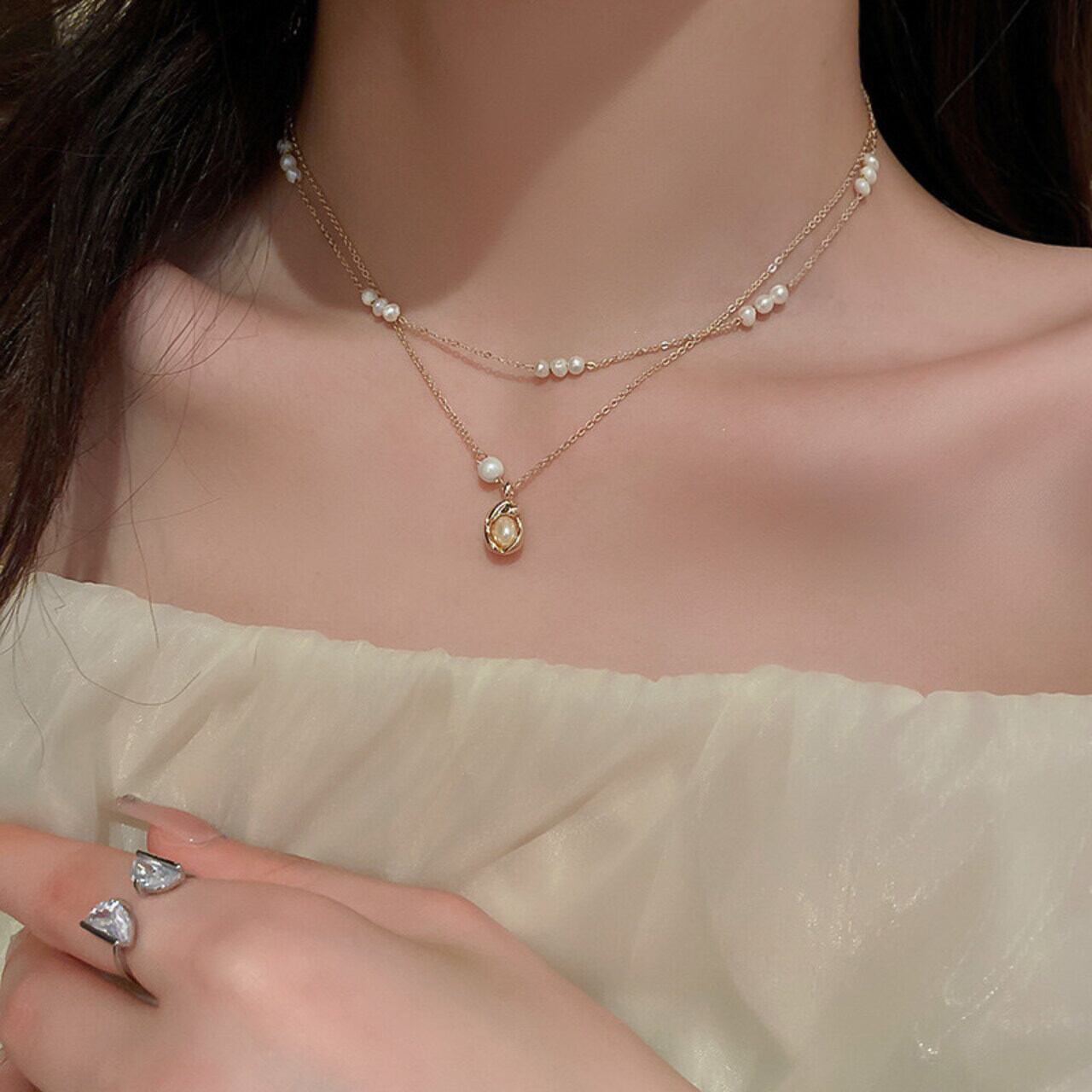 デコルテにきらめく大人の遊び心を感じさせる、プチパールが上品なネックレスセット。