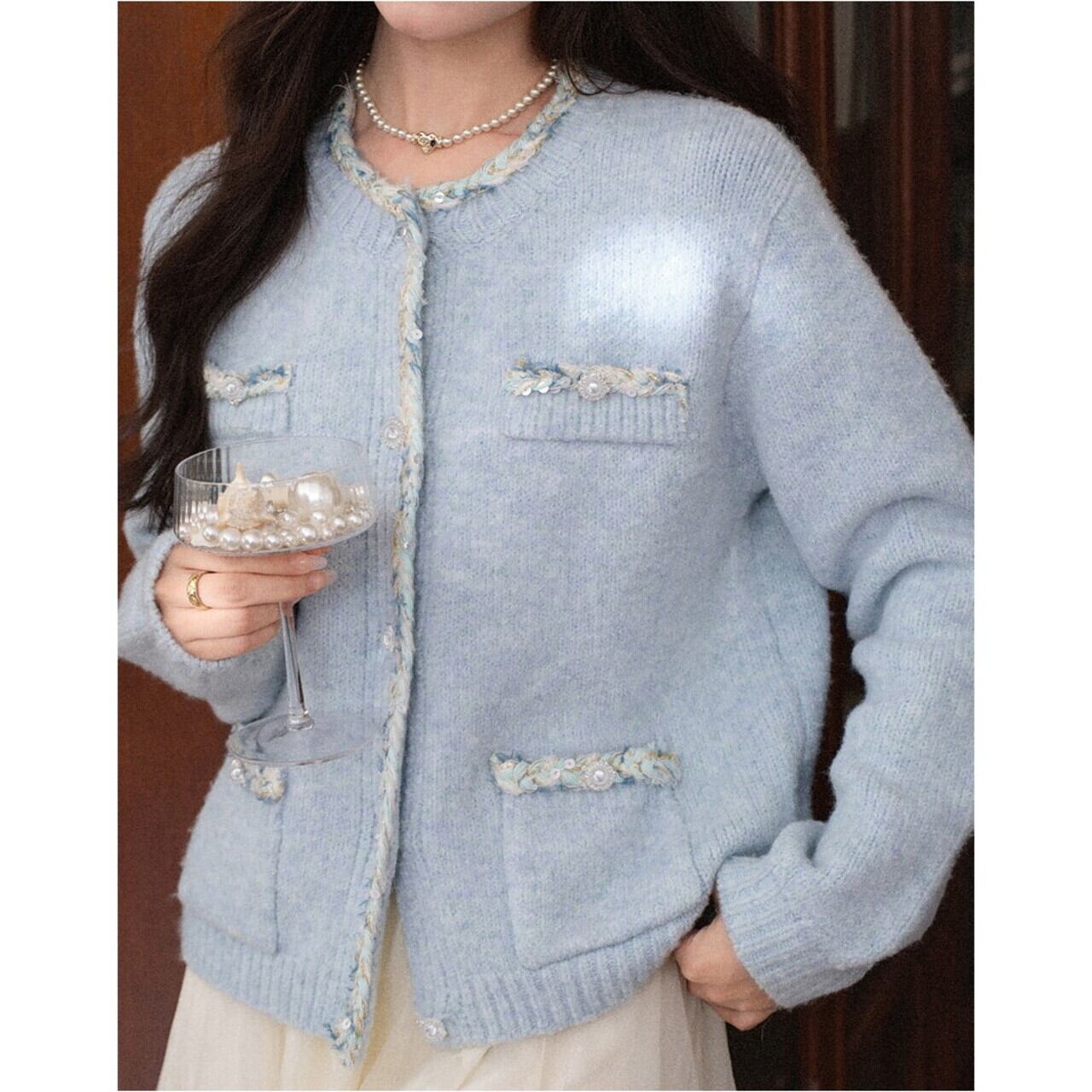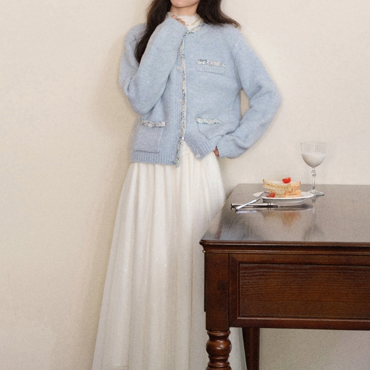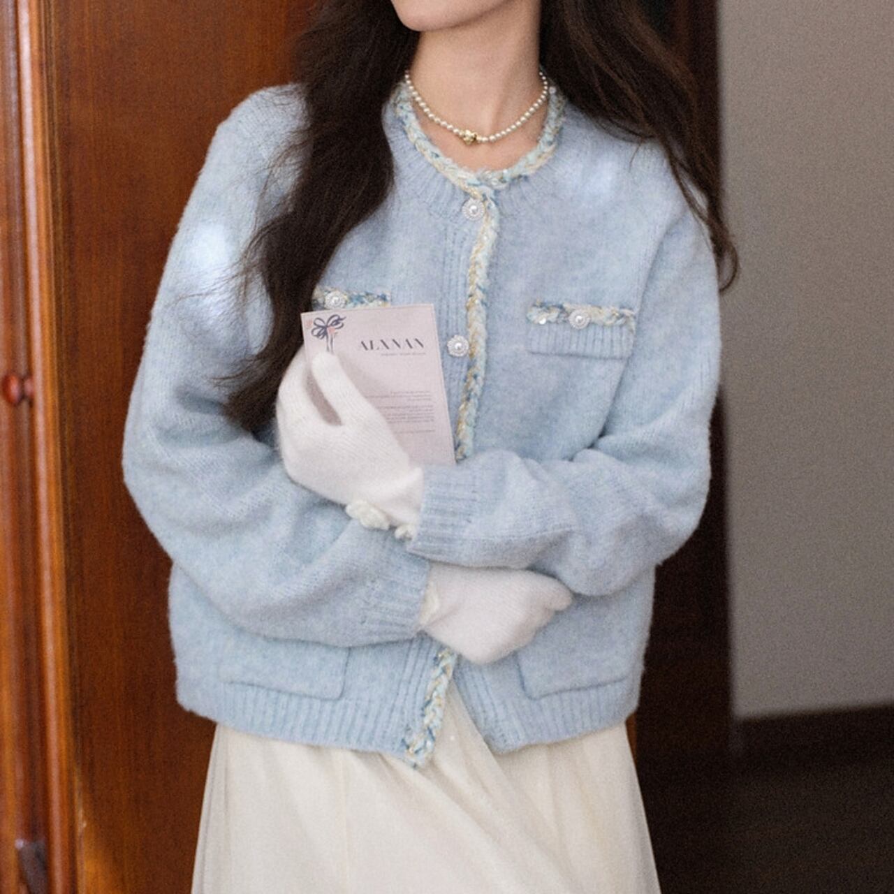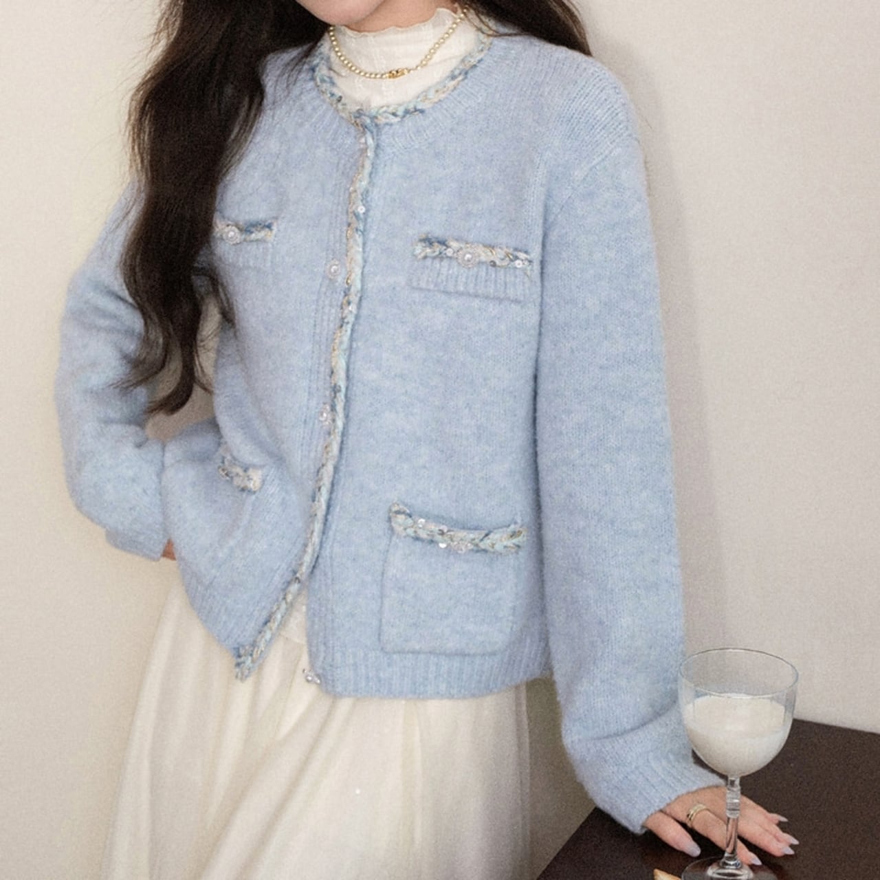ツイード調のトリムやパールボタンが華やかで、ワンピースやブラウスに羽織れば上品な雰囲気に。