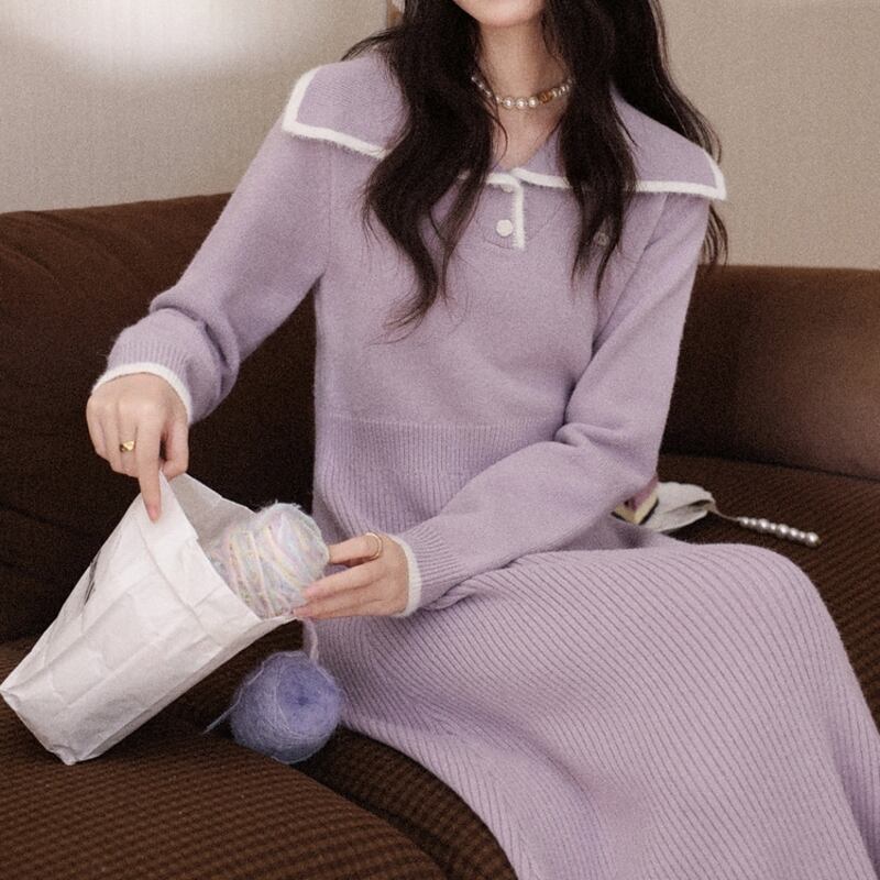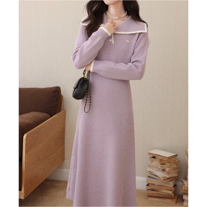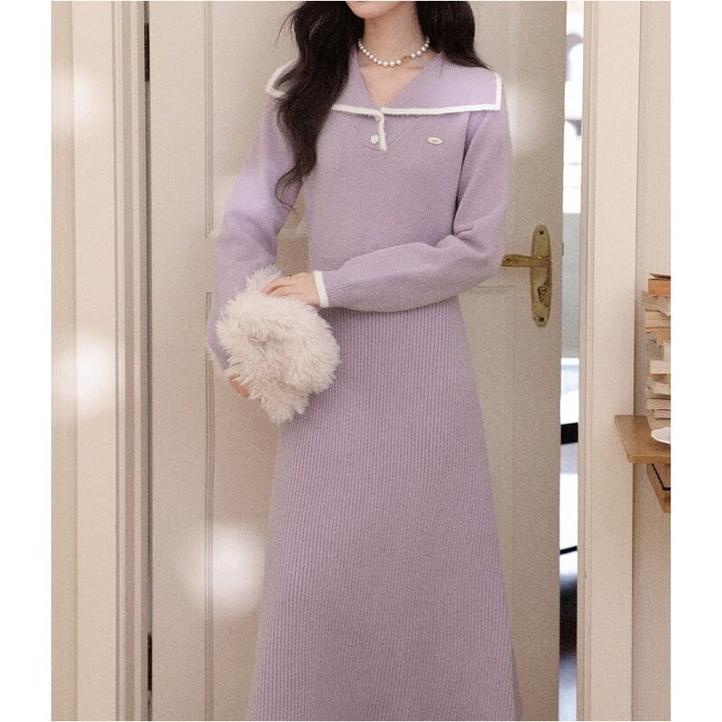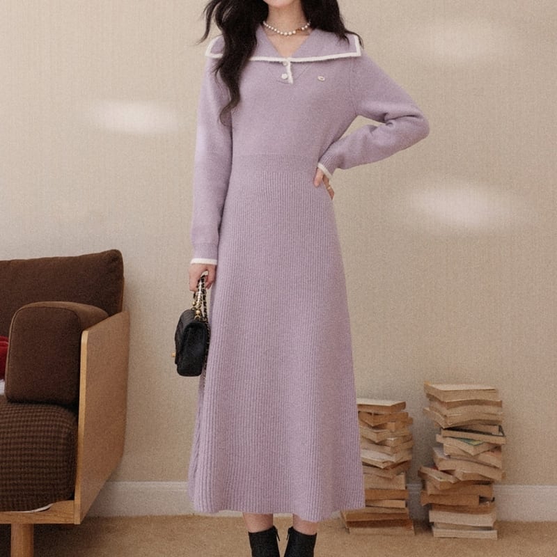 セーラーカラー リブニット切り替え ミモレワンピース 00422