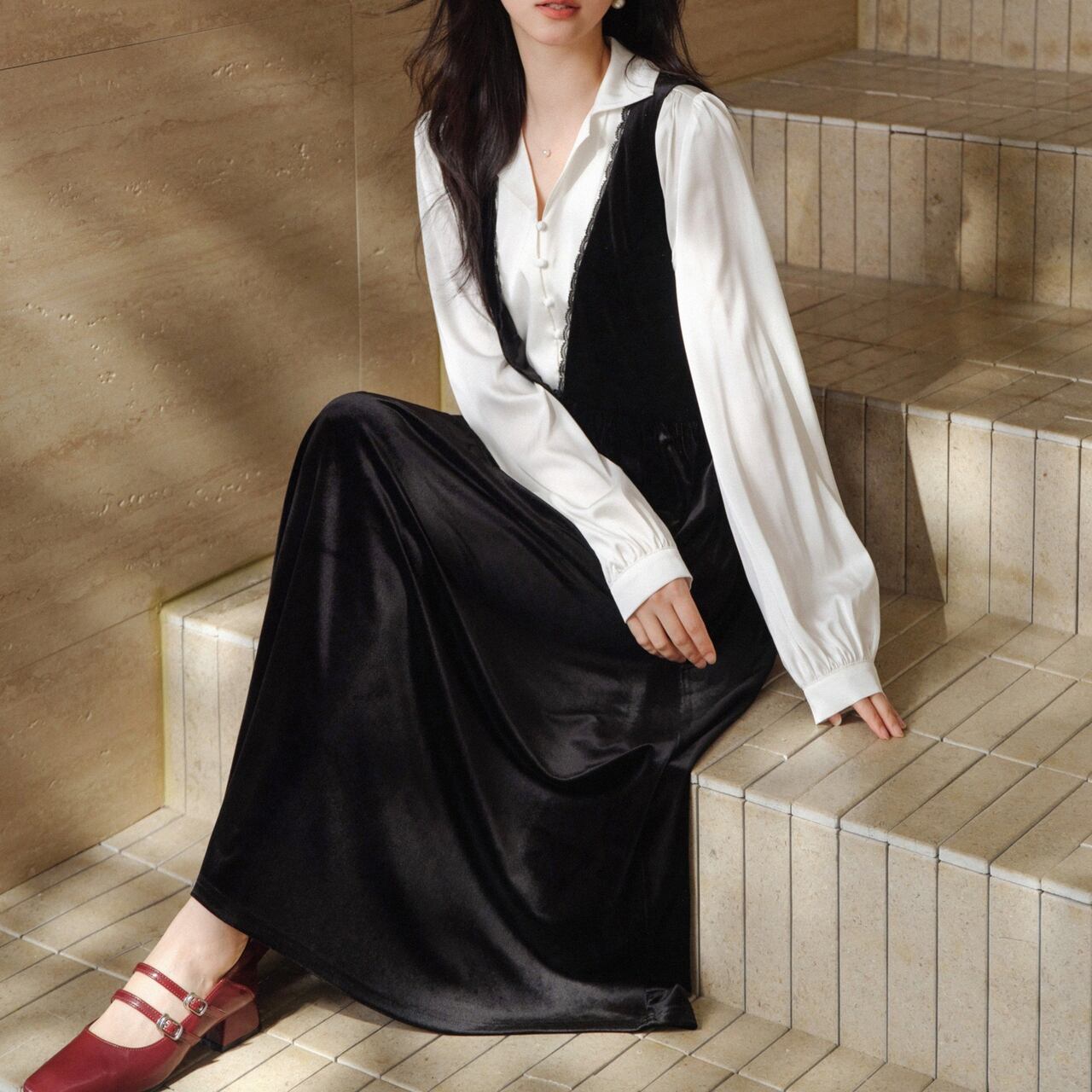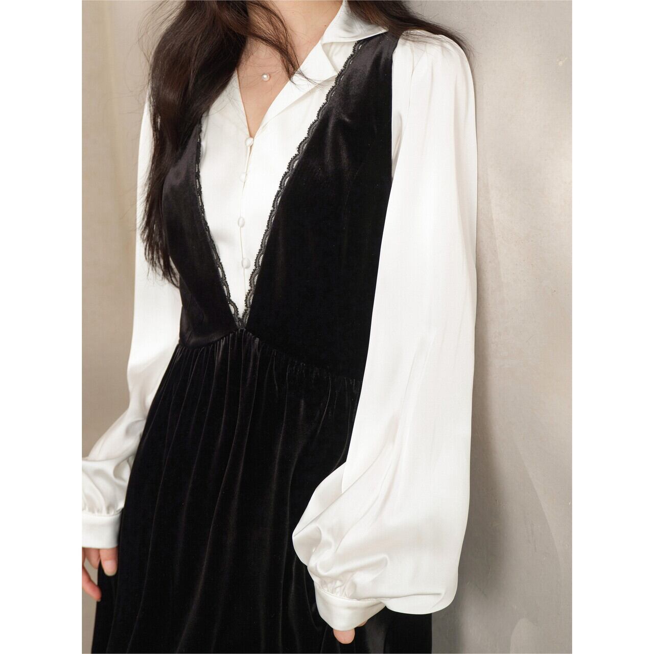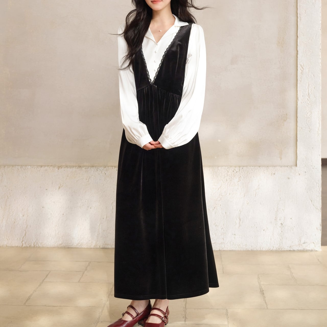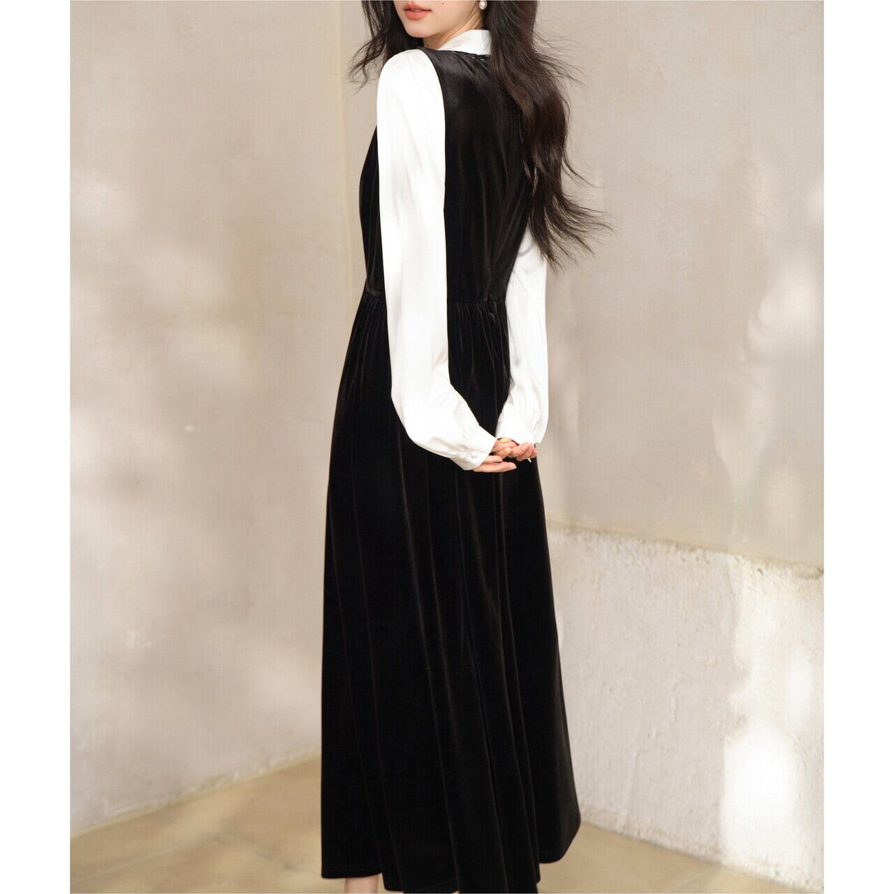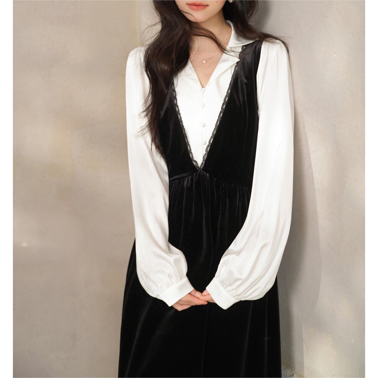 レーストリム Vネックベルベット ミモレ丈ワンピース 00446