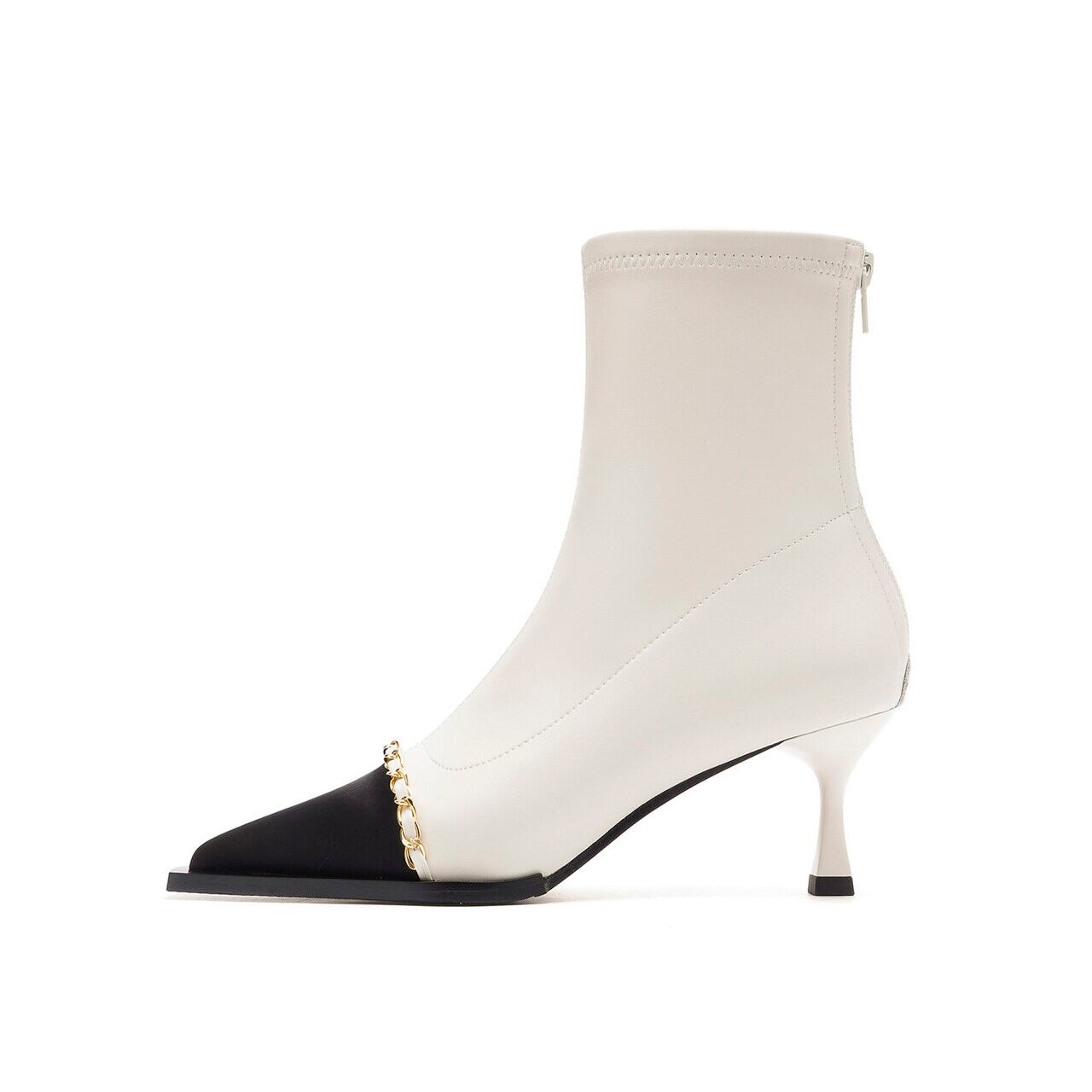 足元に上品なアクセントをプラスするバイカラー配色がシックなショートブーツです。 ポインテッドトゥのシャープなシルエットが、スタイリッシュな印象を与えます。 チェーン飾りが華やかさを添え、普段使いから少し特別な日まで、様々なシーンで活躍します。 ◼️サイズ 34(22.0cm) 35(22.5cm) 36(23.0cm) 37(23.5cm) 38(24.0cm) 39(24.5cm) ヒール:6cm 筒高:16cm ◼️カラー ホワイト ◼️素材 PU 【お届けについて】 こちらの商品は海外店舗より直接発送となる為、ご入金から1〜3週間でお届けいたします。 ◼️注意事項 ・タイミングによっては 商品在庫切れにより注文キャンセルとさせていただく恐れもございますので、予めご了承くださいませ。 ・日本製とは検品基準が異なる為、縫製などが若干甘い場合があります。 ・海外倉庫にて保管をしております。在庫情報に時差が生じますため在庫切れや生産中止、生産に遅れがある場合は、受注後でもキャンセルさせていただく恐れがございます。 ・商品の色味は、お手持ちのスマートフォンの画面によって実物と若干異なる場合がございます。 ・発送時期によりデザイン仕様(細部、素材など)の変更がある場合がございます。 ・イメージ違いやサイズ交換等、お客さまご都合による交換、返品は対応出来かねます。 ———————————— 誠に恐れ入りますが、ご購入前に以下をご確認頂きご承諾の上お買い求めくださいませ。 →https://petitelune.official.ec/about ————————————