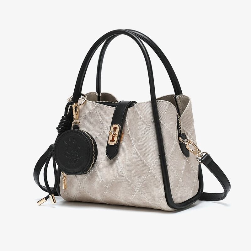 フロントのゴールド金具と配色ラインがアクセントとなり、装いに都会的な品格をプラスします。