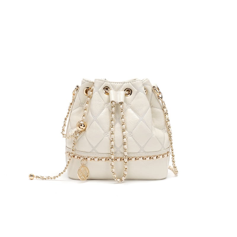 表面に施された繊細なステッチが、上品で洗練された印象を与えるバケットバッグです。